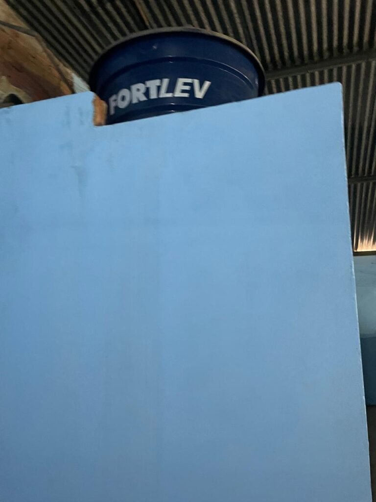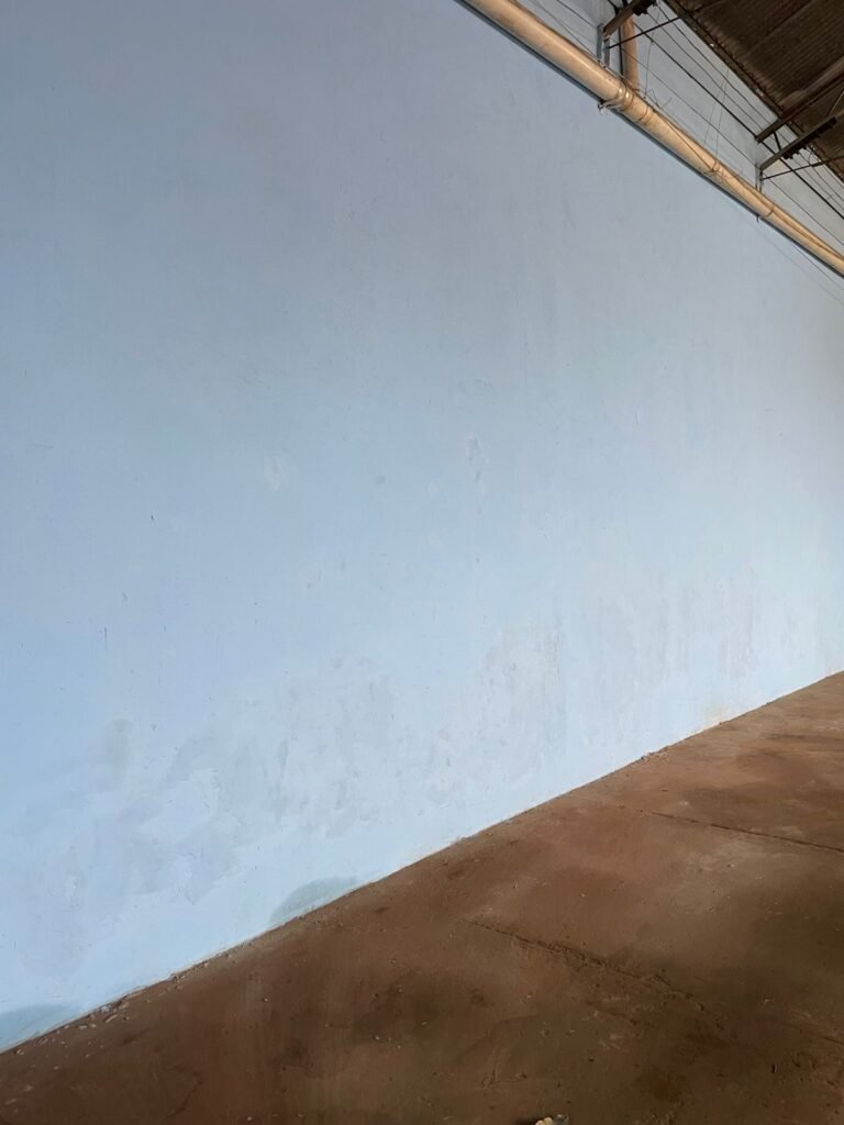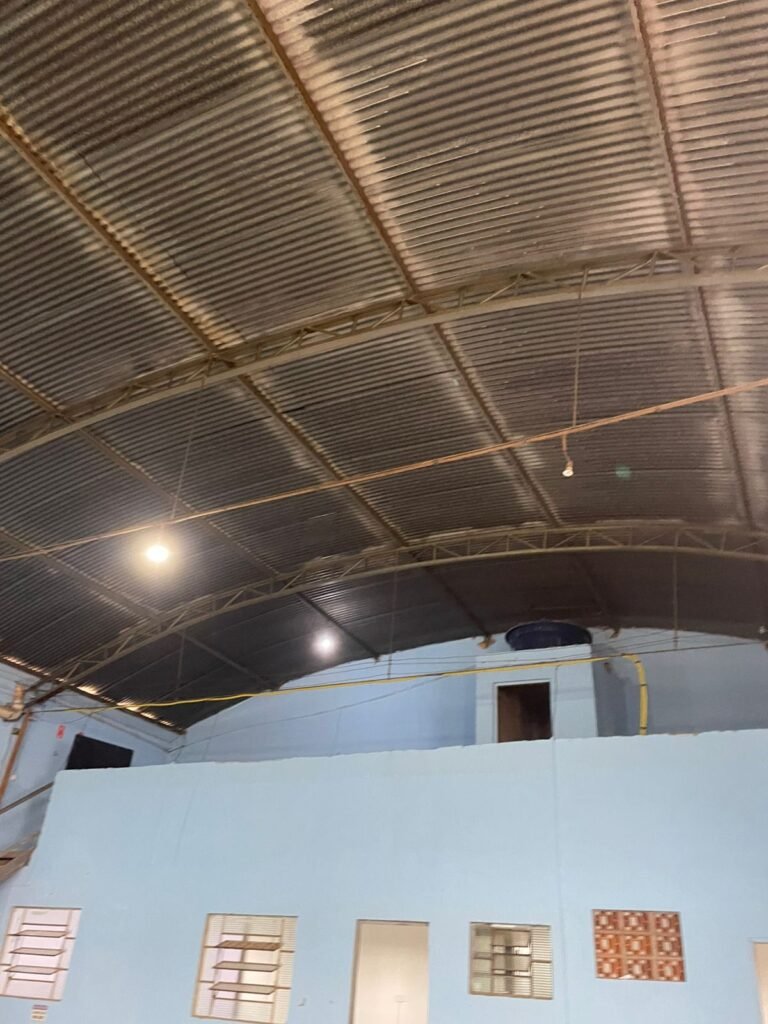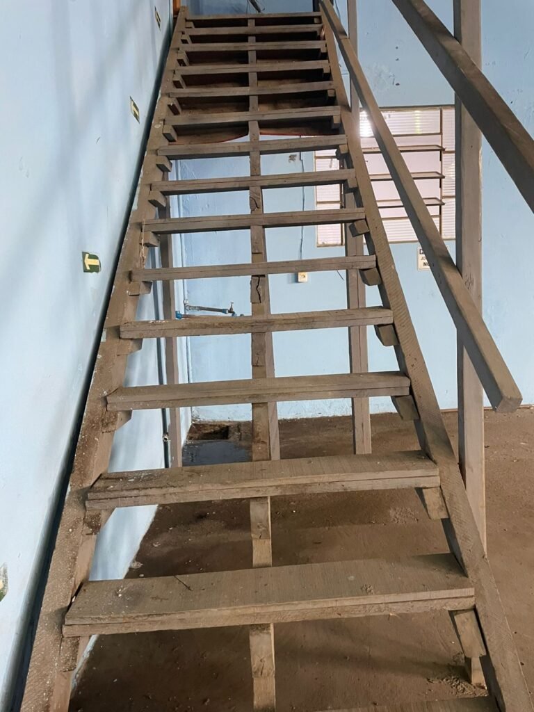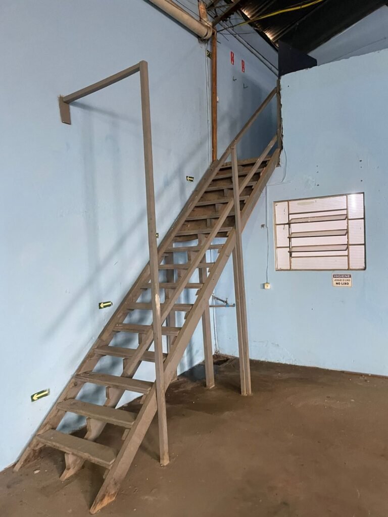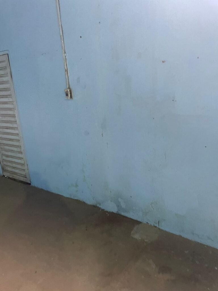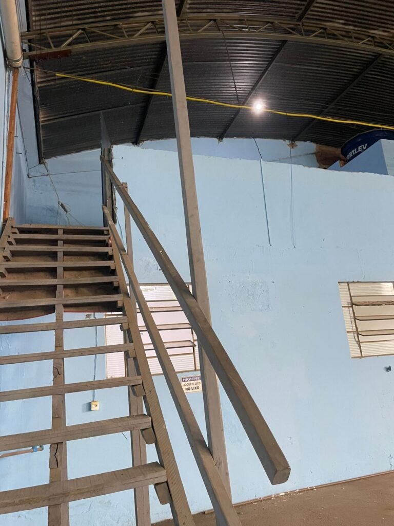 HALL MEZANINO-: 01 Porta de madeira, 01 interruptor e 01 tomada, piso de concreto, zero duas lâmpadas Led sendo que apenas 01 delas está em ordem, paredes com pintura na cor azul com manchas pela extensão e restante em ordem, 01 caixa d’água marca Fortlev em ordem, 01 banheiro inacabado, 02 suporte de extintores de incêndio e fiação aparente.