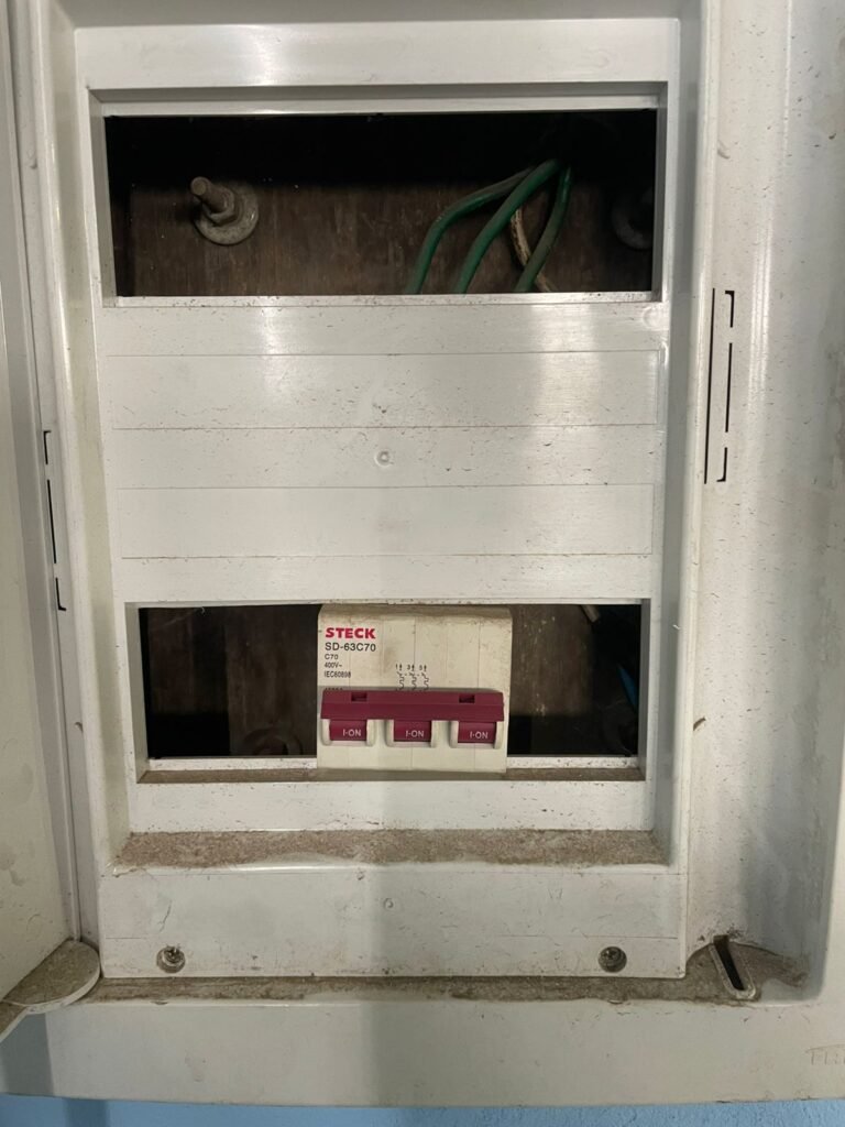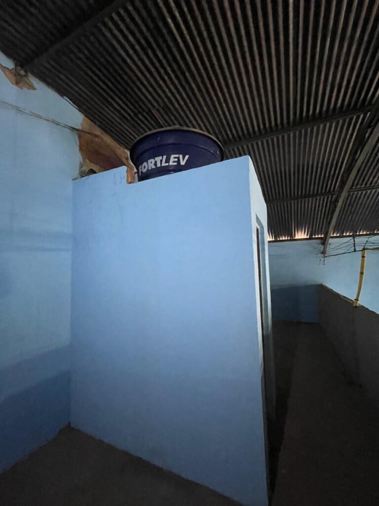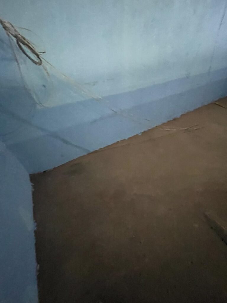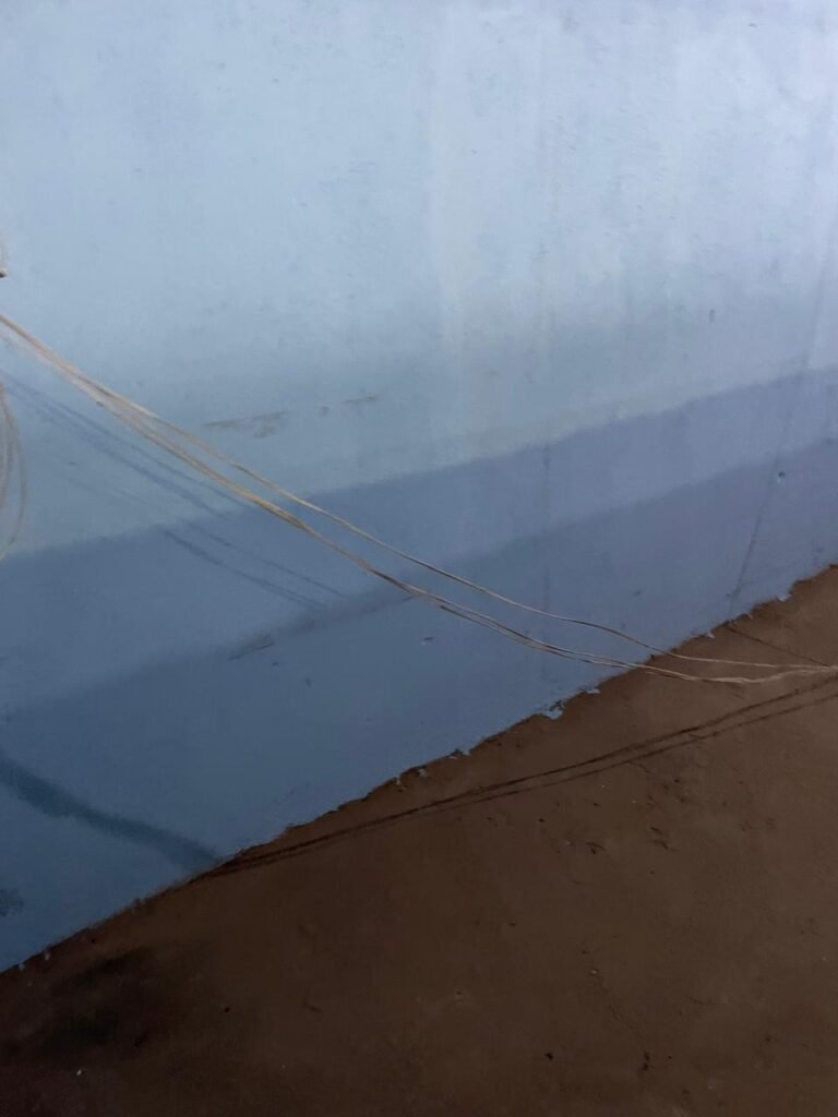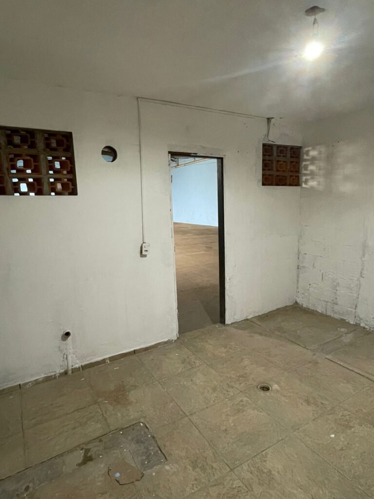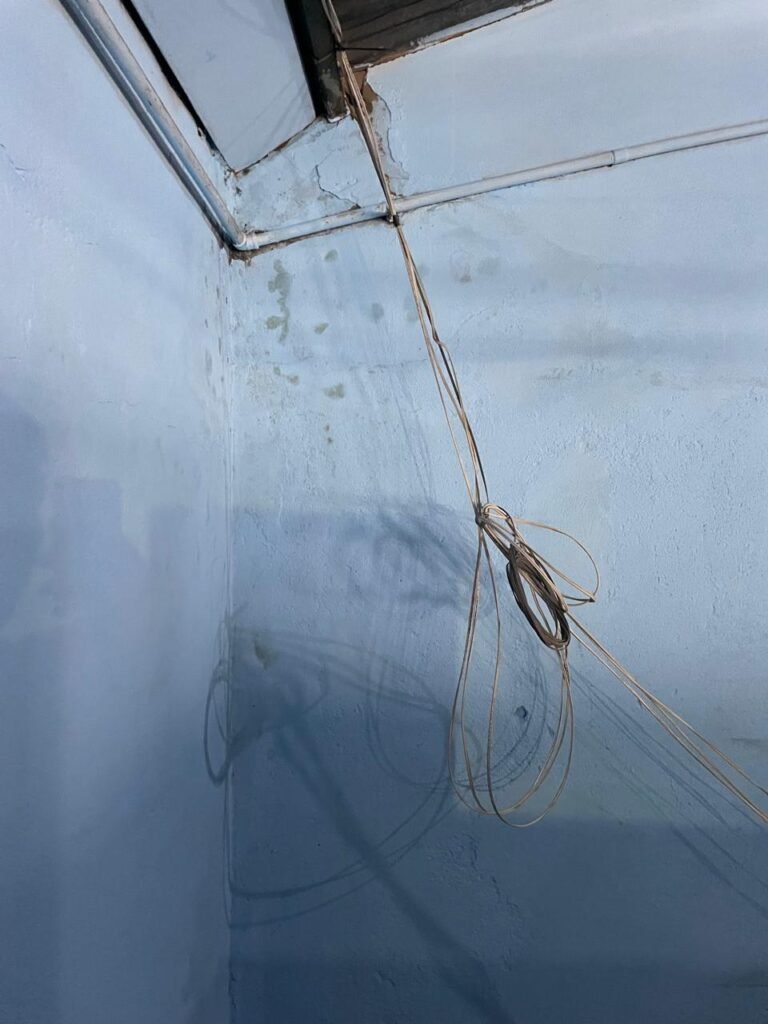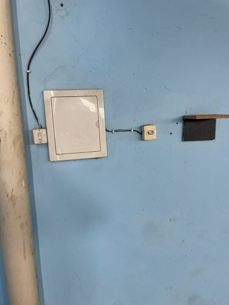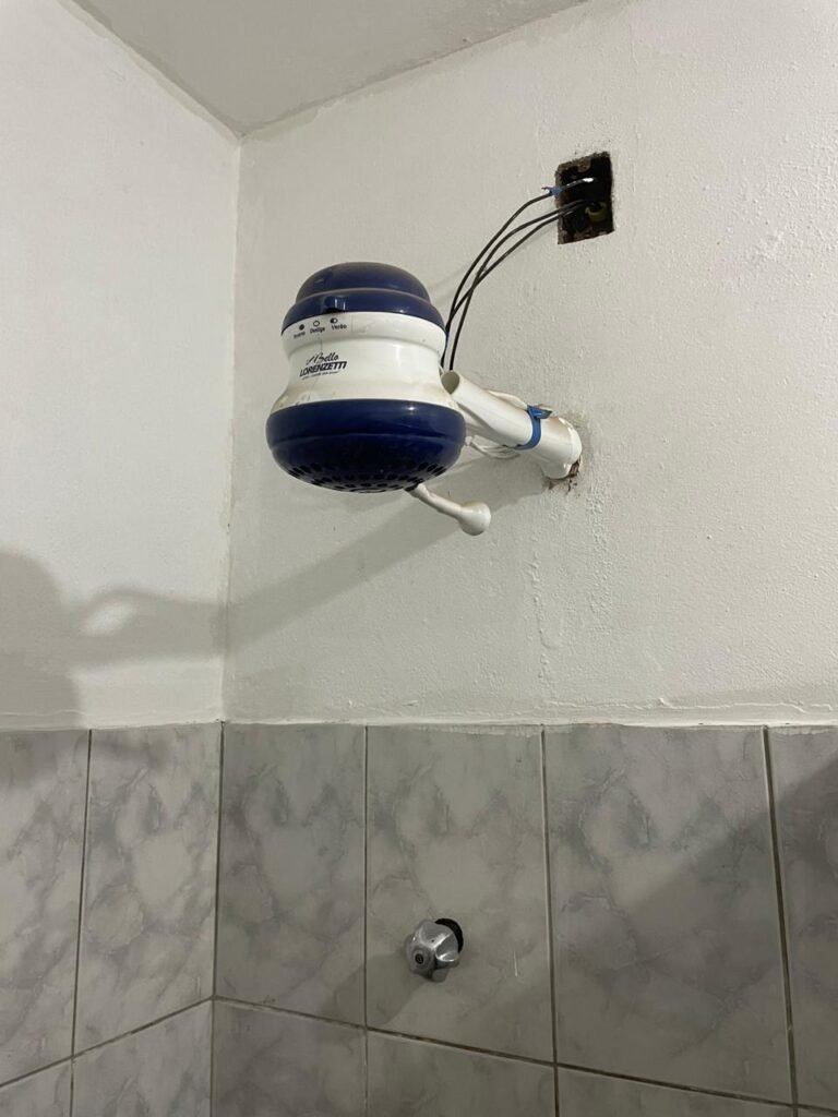 HALL MEZANINO-: 01 Porta de madeira, 01 interruptor e 01 tomada, piso de concreto, zero duas lâmpadas Led sendo que apenas 01 delas está em ordem, paredes com pintura na cor azul com manchas pela extensão e restante em ordem, 01 caixa d’água marca Fortlev em ordem, 01 banheiro inacabado, 02 suporte de extintores de incêndio e fiação aparente.