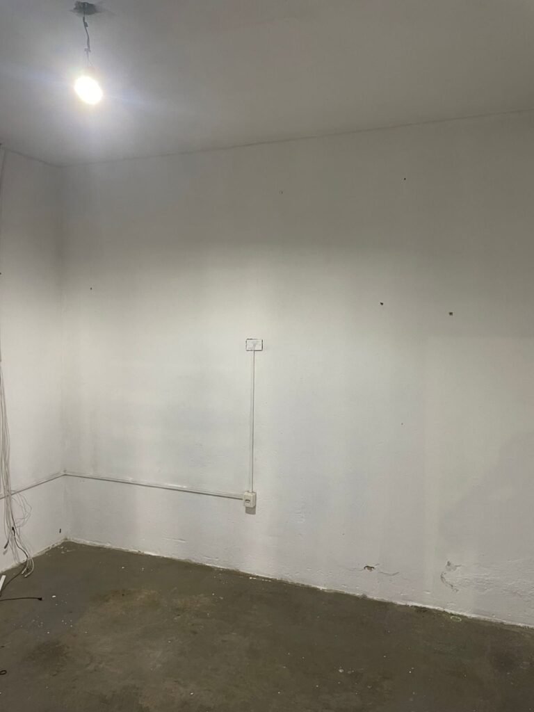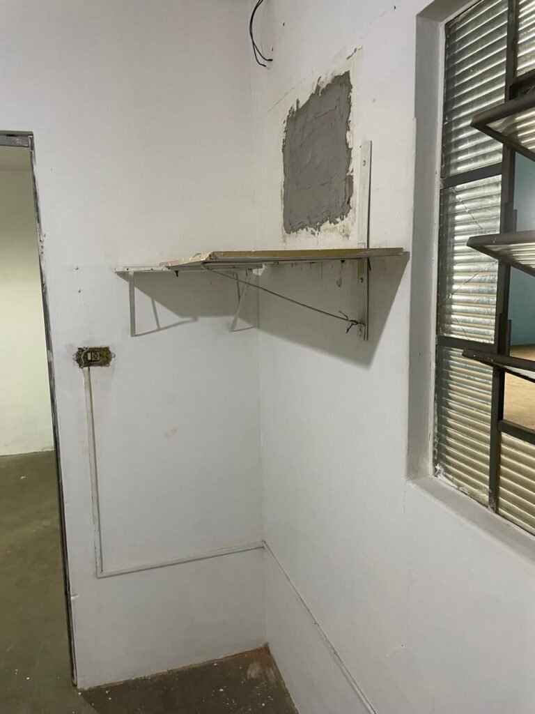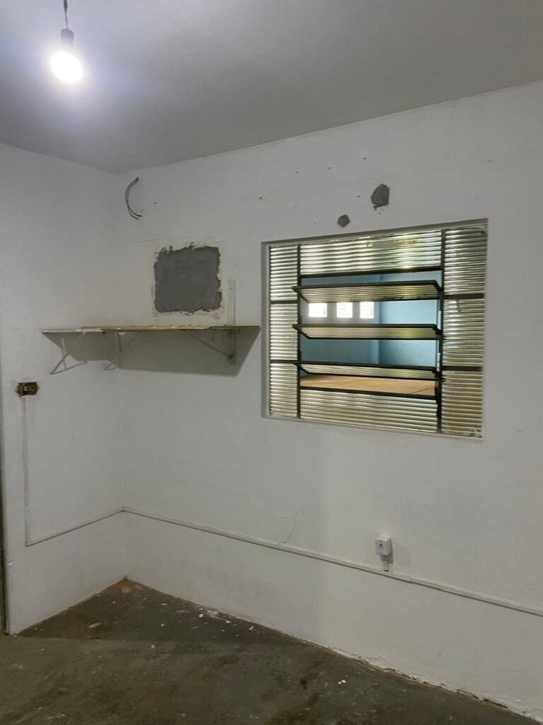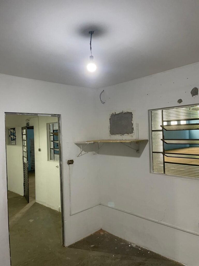 SALA 03-: Piso de concreto buzinado com manchas pela extensão e com desgastes natura, paredes com pintura na cor branco neve com manchas, com descasques e restante em ordem, 05 tomadas e 01 interruptor, 01 bancada de madeira fixa na parede, 01 remendo visível na parede, 01 vitro basculante com esquadrias de ferro em ordem, com 01 fechadura alavanca em ordem e com 11 vidros canelados com manchas de tinta, com desgastes naturais e 01 deles trincados, 01 uma lâmpada led em ordem.