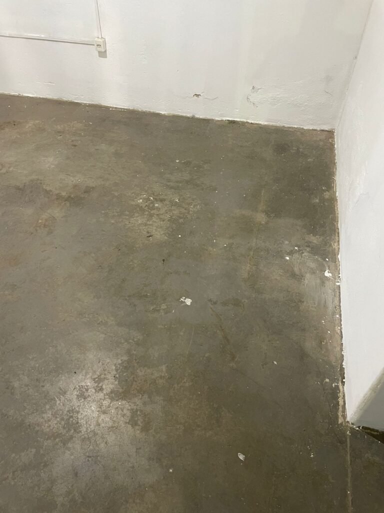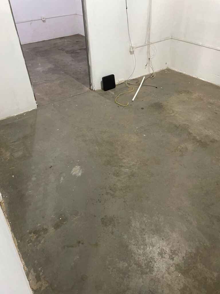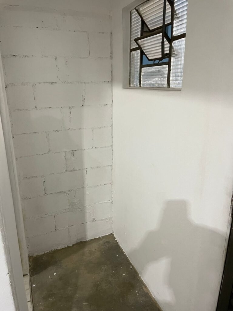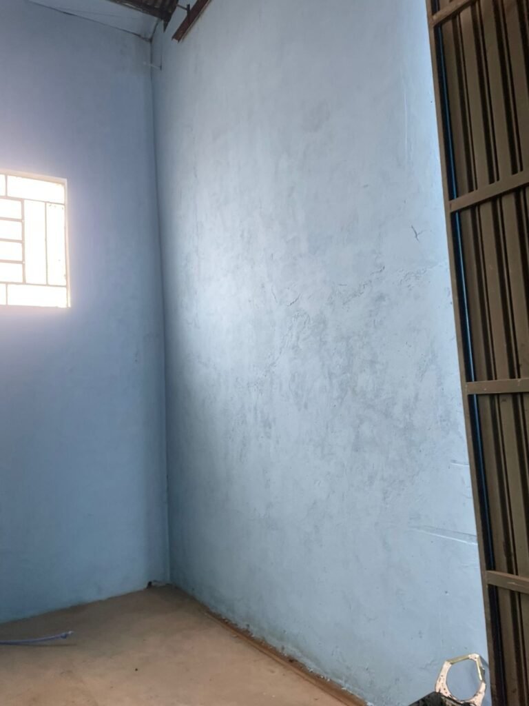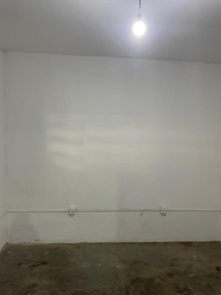 SALA 03-: Piso de concreto buzinado com manchas pela extensão e com desgastes natura, paredes com pintura na cor branco neve com manchas, com descasques e restante em ordem, 05 tomadas e 01 interruptor, 01 bancada de madeira fixa na parede, 01 remendo visível na parede, 01 vitro basculante com esquadrias de ferro em ordem, com 01 fechadura alavanca em ordem e com 11 vidros canelados com manchas de tinta, com desgastes naturais e 01 deles trincados, 01 uma lâmpada led em ordem.