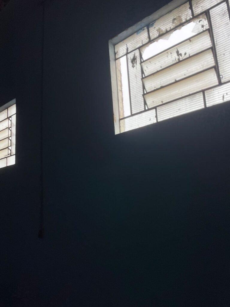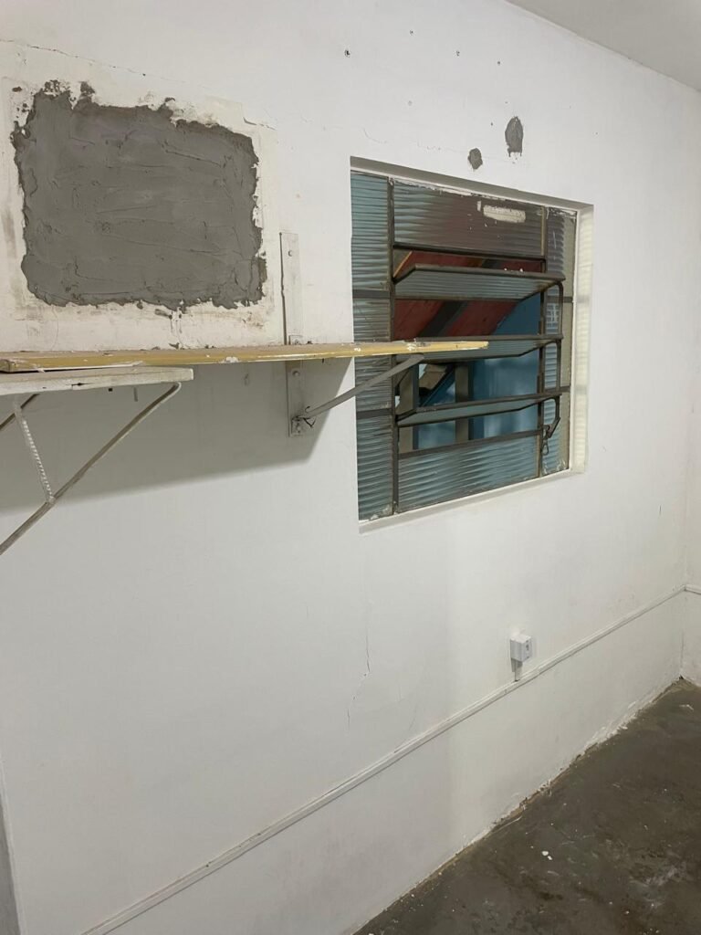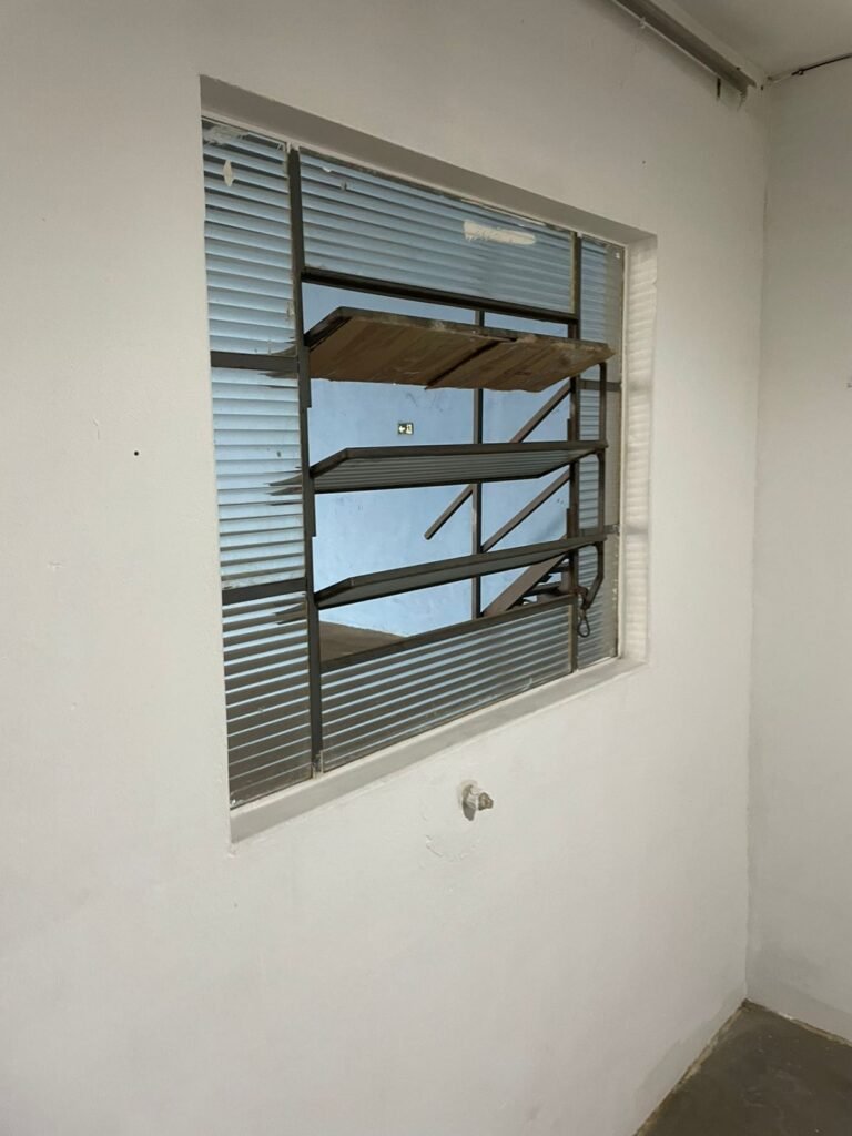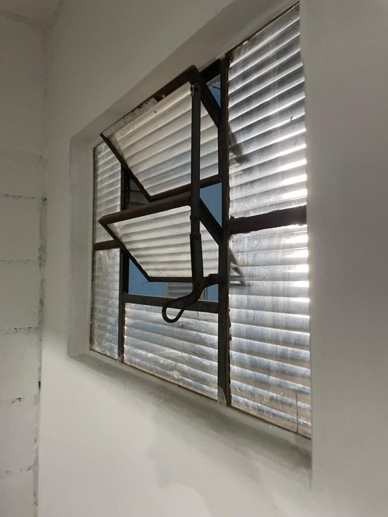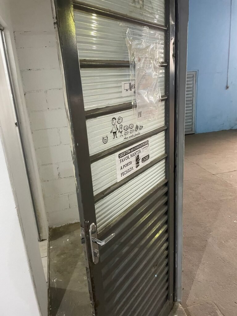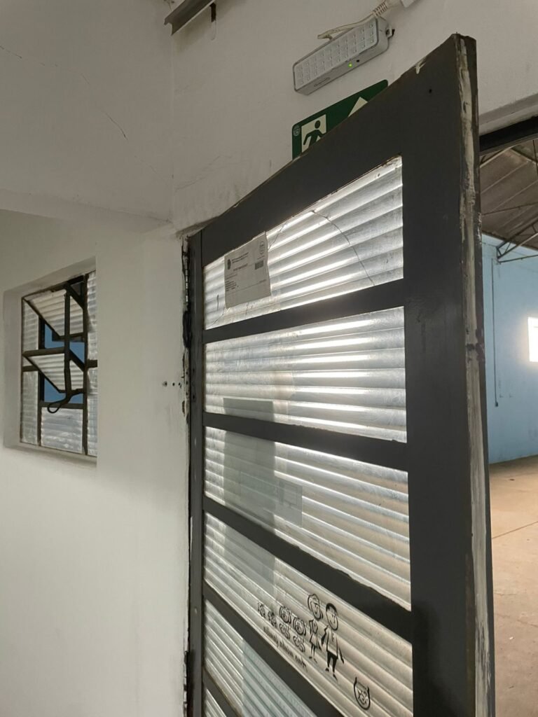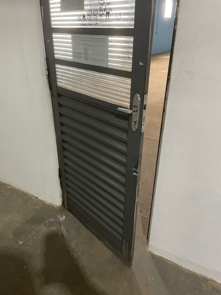 SALA 02-: 01 Porta veneziana de aço com pintura na cor cinza com desgastes naturais, com maçaneta em inox em ordem, com 01 fechadura marca Stam em ordem, com 06 vidros canelados com adesivos, com manchas e com 01 deles trincados. Piso de concreto uzinado com desgastes naturais e manchas de tinta, paredes e teto com pintura na cor branco neve com algumas manchas, descasques e restante em ordem, pontos com fiação aparente, 04 tomadas e 01 interruptor, 01 luminária de emergência marca Segurimax em ordem, 02 vitrôs basculantes com esquadrias de ferro em ordem, com 01 fechadura alavanca em ordem em cada, 01 vitrô com 11 vidros canelados com manchas de tinta, desgastes naturais e 02 vidros trincados e o outro vitro com 07 vidros canelados com desgastes naturais e com manchas de tinta, 01 vidro trincado.