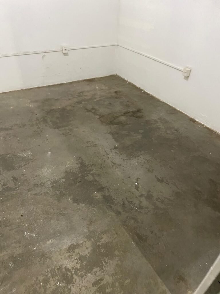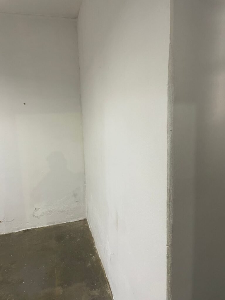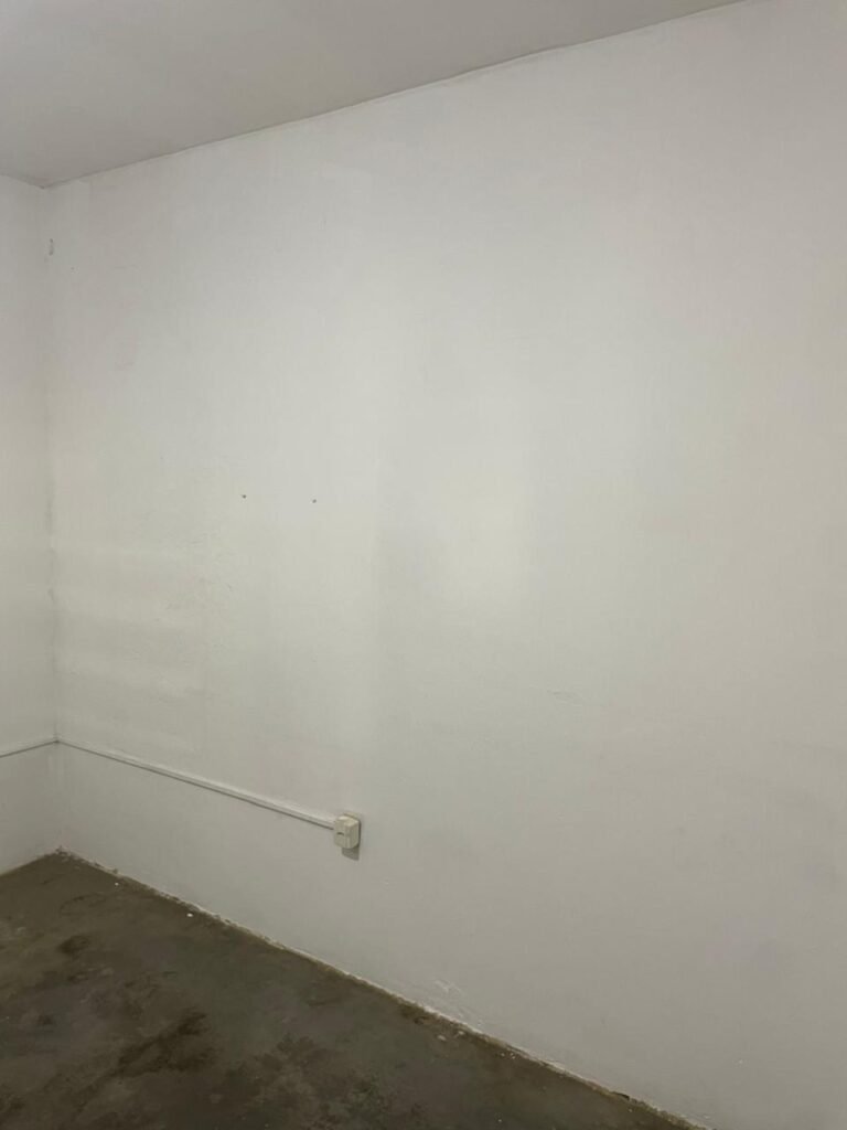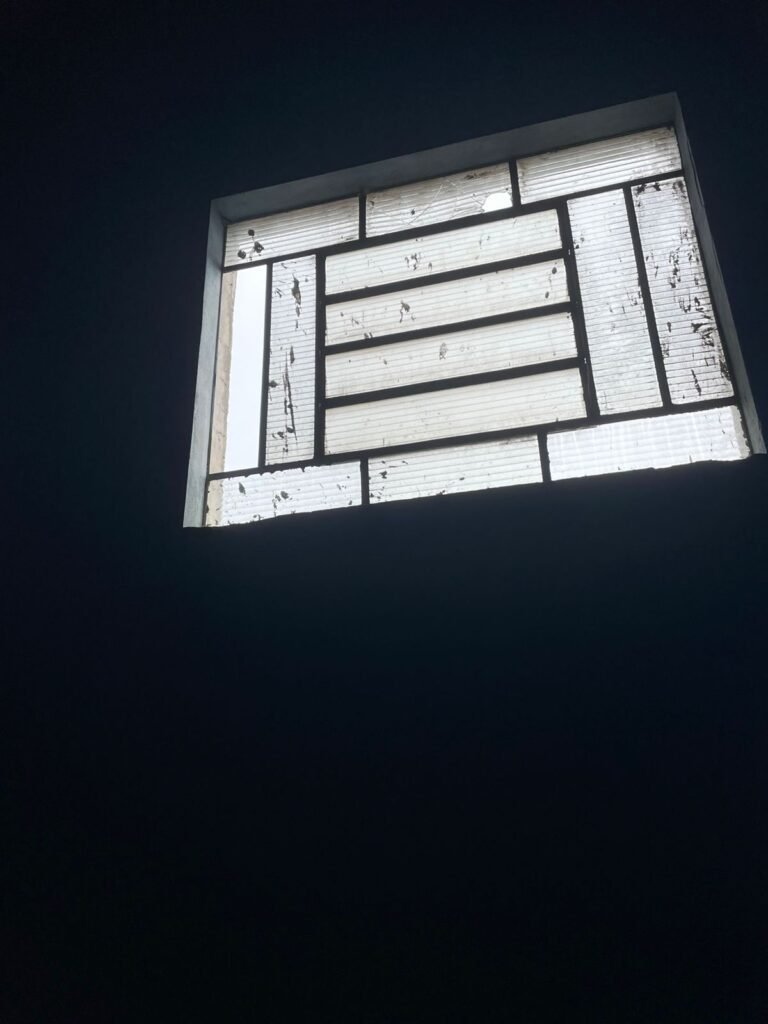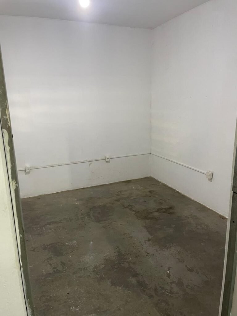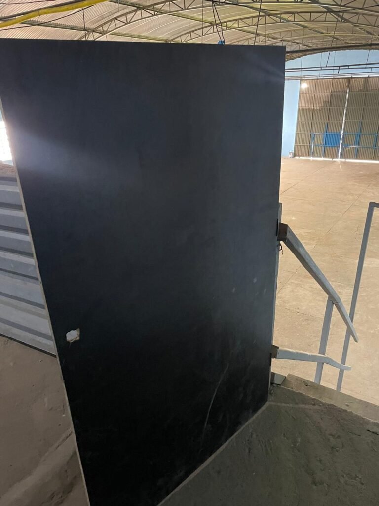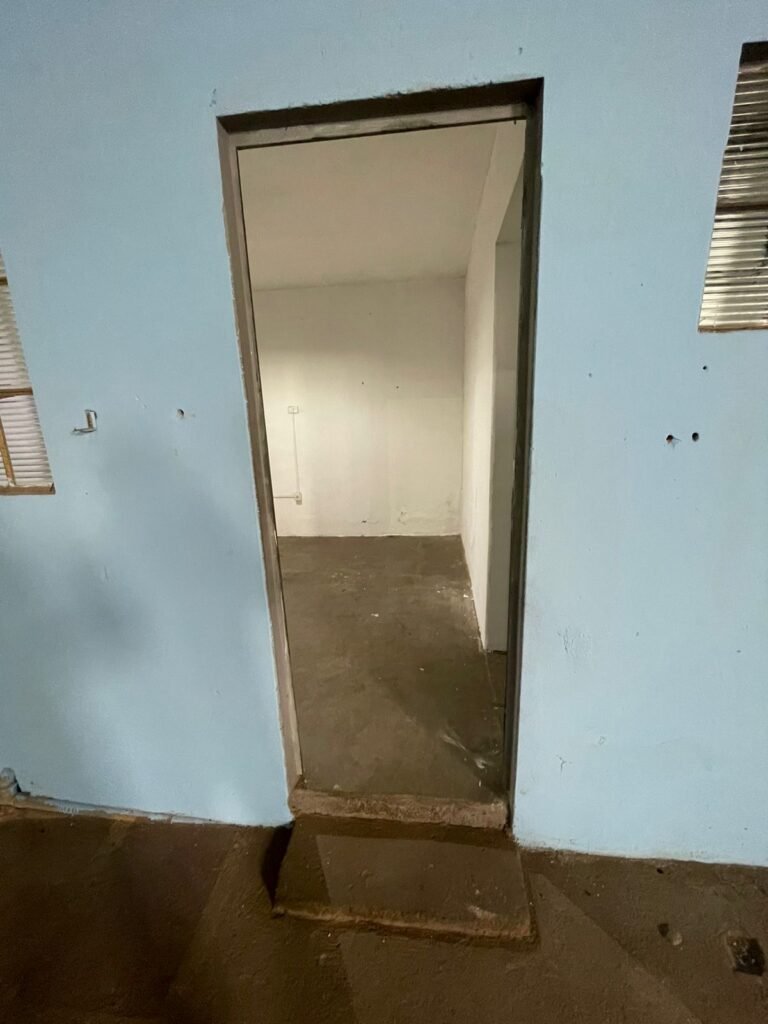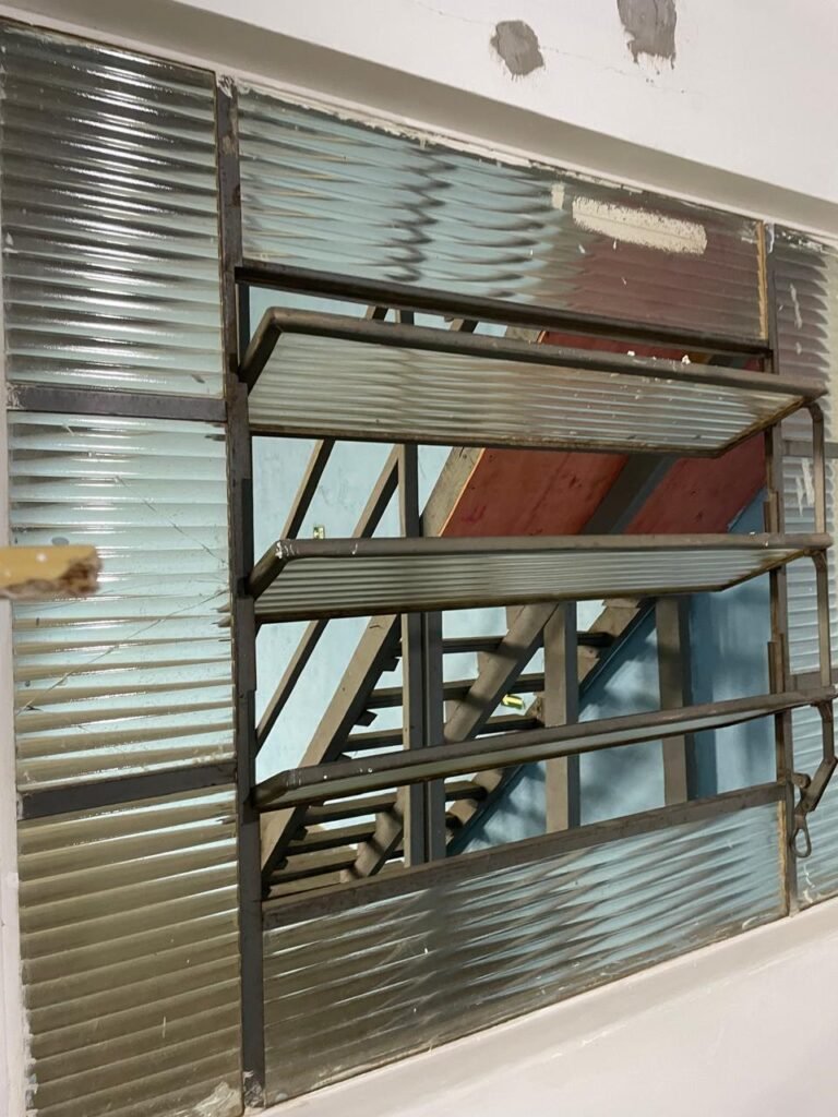 SALA 02-: 01 Porta veneziana de aço com pintura na cor cinza com desgastes naturais, com maçaneta em inox em ordem, com 01 fechadura marca Stam em ordem, com 06 vidros canelados com adesivos, com manchas e com 01 deles trincados. Piso de concreto uzinado com desgastes naturais e manchas de tinta, paredes e teto com pintura na cor branco neve com algumas manchas, descasques e restante em ordem, pontos com fiação aparente, 04 tomadas e 01 interruptor, 01 luminária de emergência marca Segurimax em ordem, 02 vitrôs basculantes com esquadrias de ferro em ordem, com 01 fechadura alavanca em ordem em cada, 01 vitrô com 11 vidros canelados com manchas de tinta, desgastes naturais e 02 vidros trincados e o outro vitro com 07 vidros canelados com desgastes naturais e com manchas de tinta, 01 vidro trincado.
