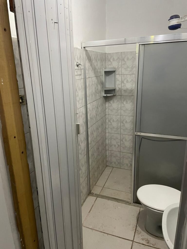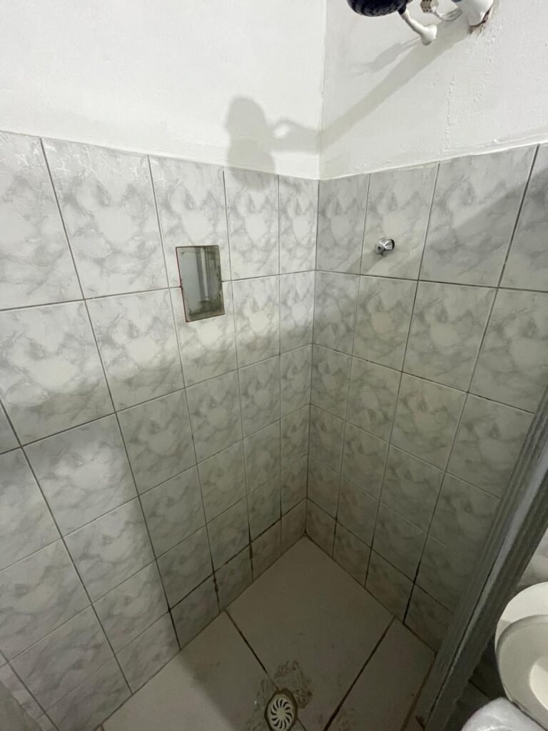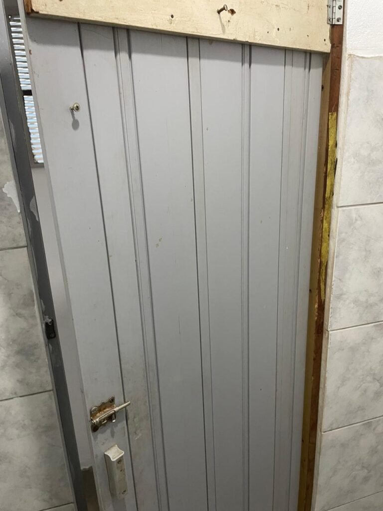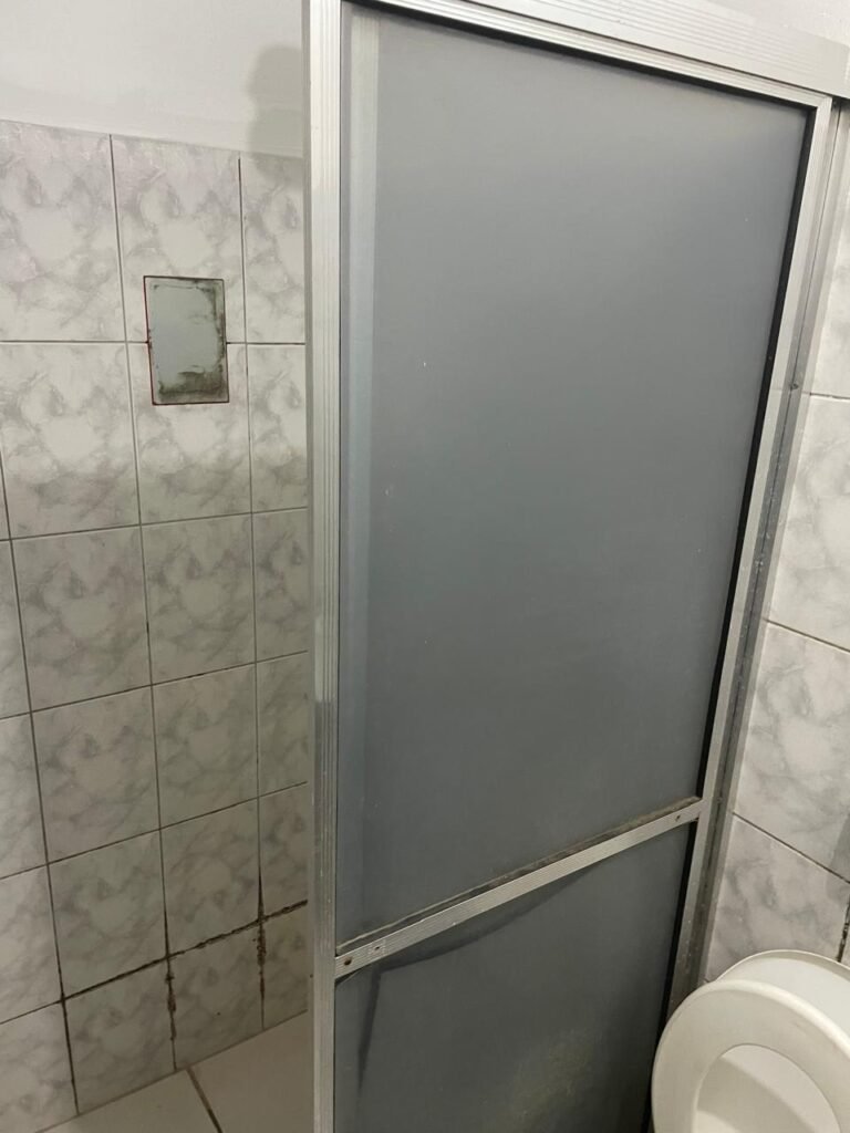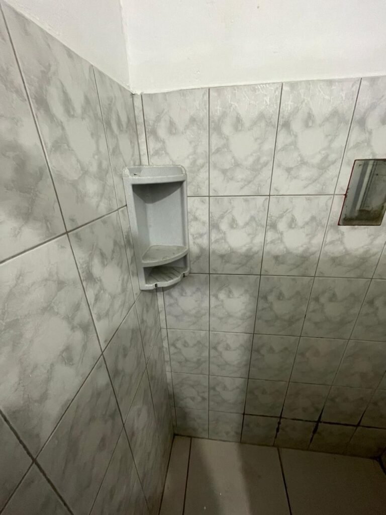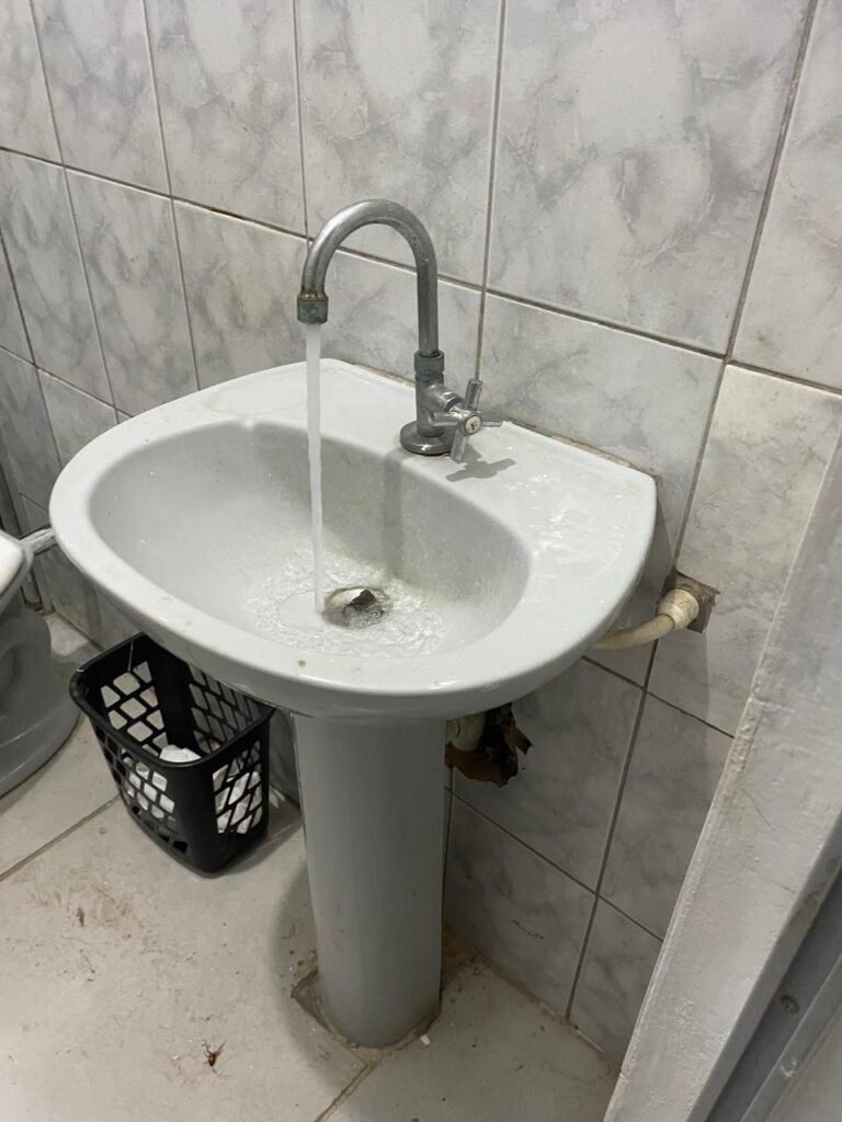 W.C SALA 02-: 01 Porta de pvc com desgastes naturais e com furos pela extensão, com 02 puxadores em ordem, piso revestido de piso frio cerâmico com desgastes naturais e com manchas pretensão, paredes 1/2 revestidas com pisos frios cerâmicos com desgastes natura, com buracos de instalações pela extensão, restante das paredes e teto com pintura na cor branco neve com manchas de infiltração pela extensão, com 02 suportes de inox, com 01 suporte de plástico, com 01 suporte de papel higiênico com desgastes naturais, 01 conjunto lavatório de cerâmica cor cinza com desgastes naturais, sifão em ordem, parte da instalação da parede quebrada, 01 torneira de inox com desgastes naturais e restante em ordem, 01 conjunto sanitário com vaso de cerâmica cor cinza em ordem, com tampa e acento com desgastes naturais e restante, 01 descarga marca Hydra com válvula emperrando, 01 ralo de plástico cor branco em ordem, 01 box com esquadrias de alumínio e com 02 portas de correr, com desgastes naturais e partes soltando, 04 folhas de acrílico com desgastes naturais e restante em ordem, 01 suporte de plástico para cosméticos, 01 espelho de reflexo com desgastes naturais e com manchas, 01 válvula de inox do chuveiro, 01 chuveiro Loren Bello Lorenzetti queimado.