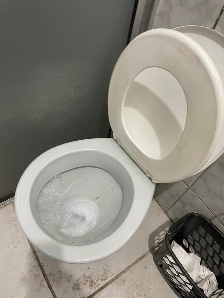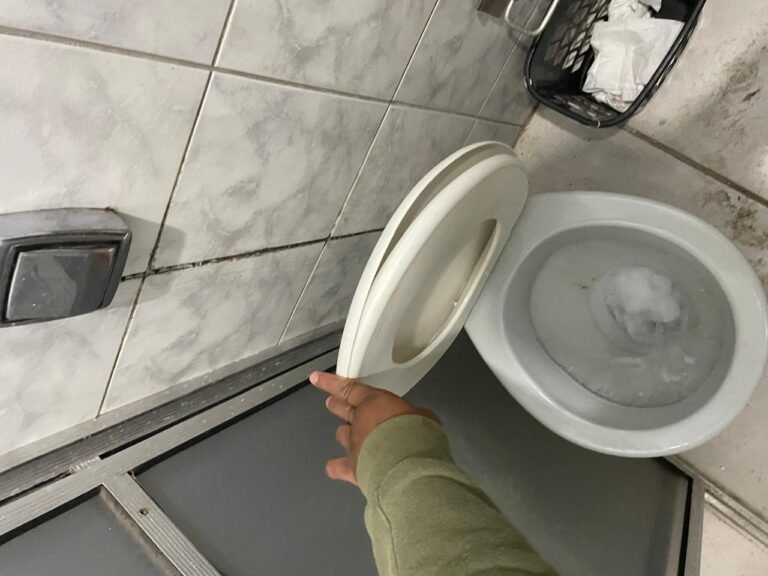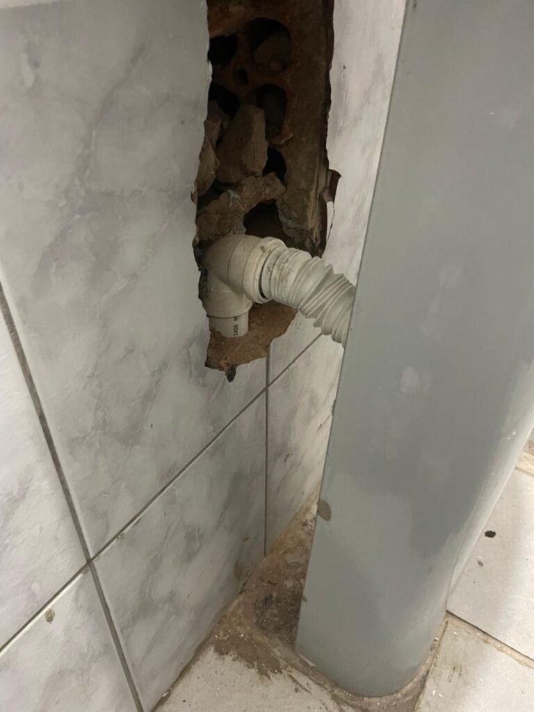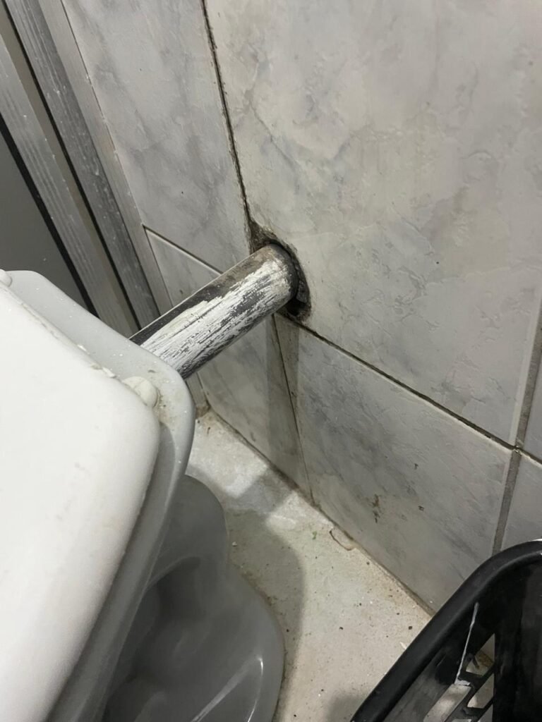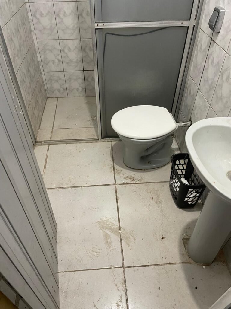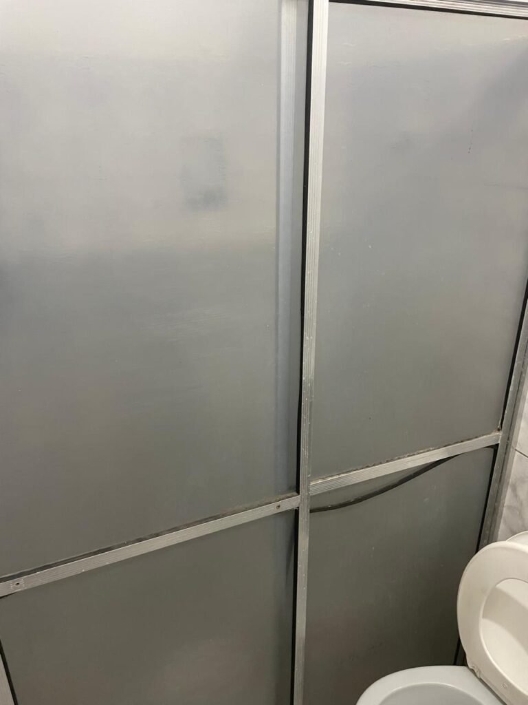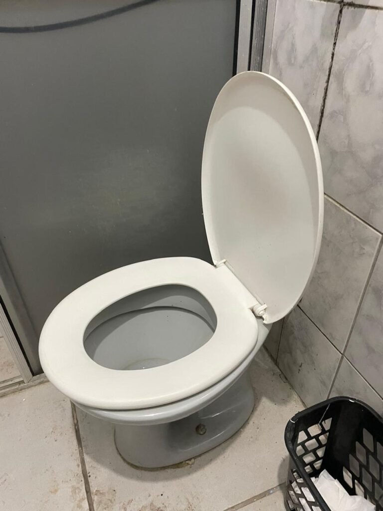 W.C SALA 02-: 01 Porta de pvc com desgastes naturais e com furos pela extensão, com 02 puxadores em ordem, piso revestido de piso frio cerâmico com desgastes naturais e com manchas pretensão, paredes 1/2 revestidas com pisos frios cerâmicos com desgastes natura, com buracos de instalações pela extensão, restante das paredes e teto com pintura na cor branco neve com manchas de infiltração pela extensão, com 02 suportes de inox, com 01 suporte de plástico, com 01 suporte de papel higiênico com desgastes naturais, 01 conjunto lavatório de cerâmica cor cinza com desgastes naturais, sifão em ordem, parte da instalação da parede quebrada, 01 torneira de inox com desgastes naturais e restante em ordem, 01 conjunto sanitário com vaso de cerâmica cor cinza em ordem, com tampa e acento com desgastes naturais e restante, 01 descarga marca Hydra com válvula emperrando, 01 ralo de plástico cor branco em ordem, 01 box com esquadrias de alumínio e com 02 portas de correr, com desgastes naturais e partes soltando, 04 folhas de acrílico com desgastes naturais e restante em ordem, 01 suporte de plástico para cosméticos, 01 espelho de reflexo com desgastes naturais e com manchas, 01 válvula de inox do chuveiro, 01 chuveiro Loren Bello Lorenzetti queimado.