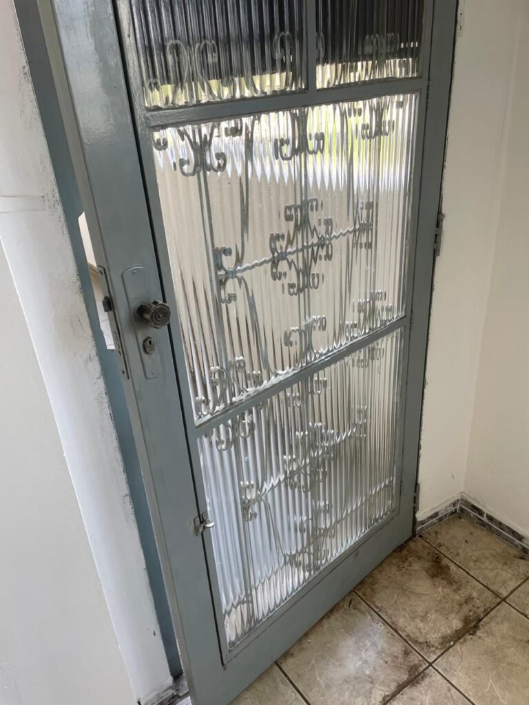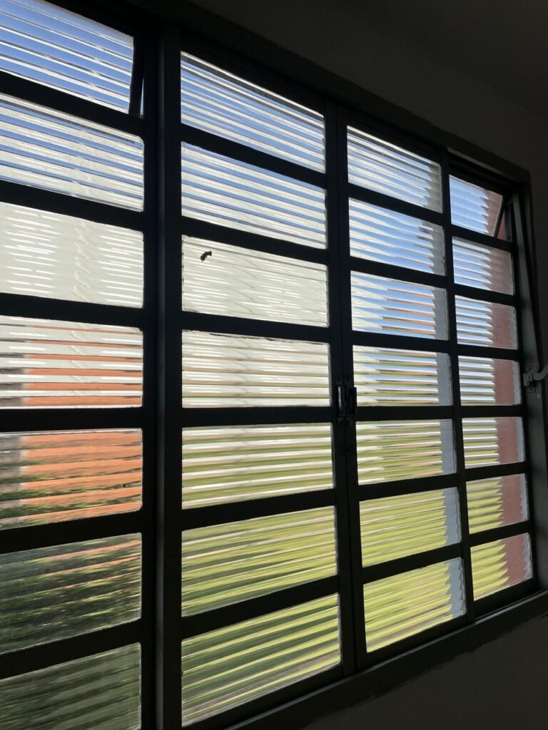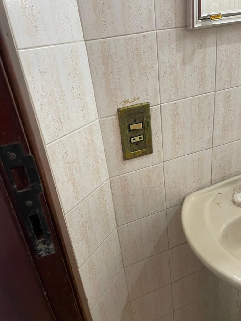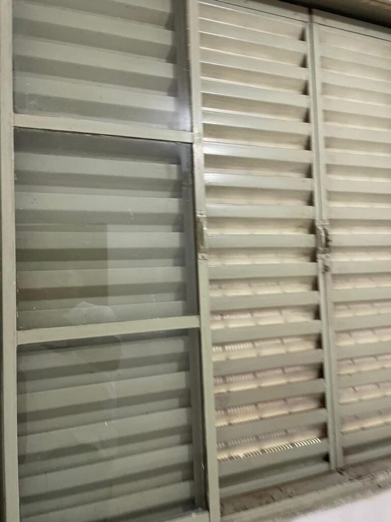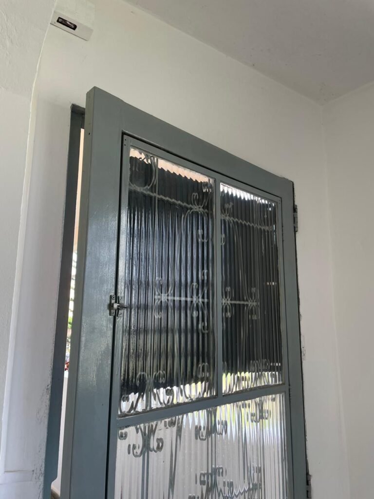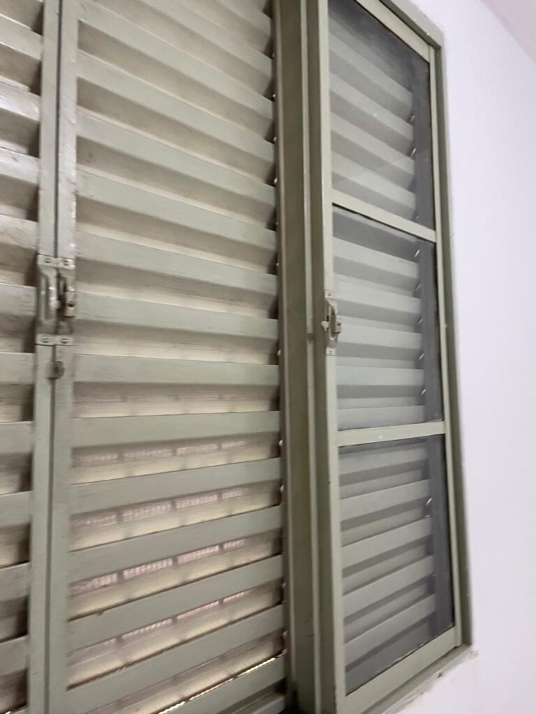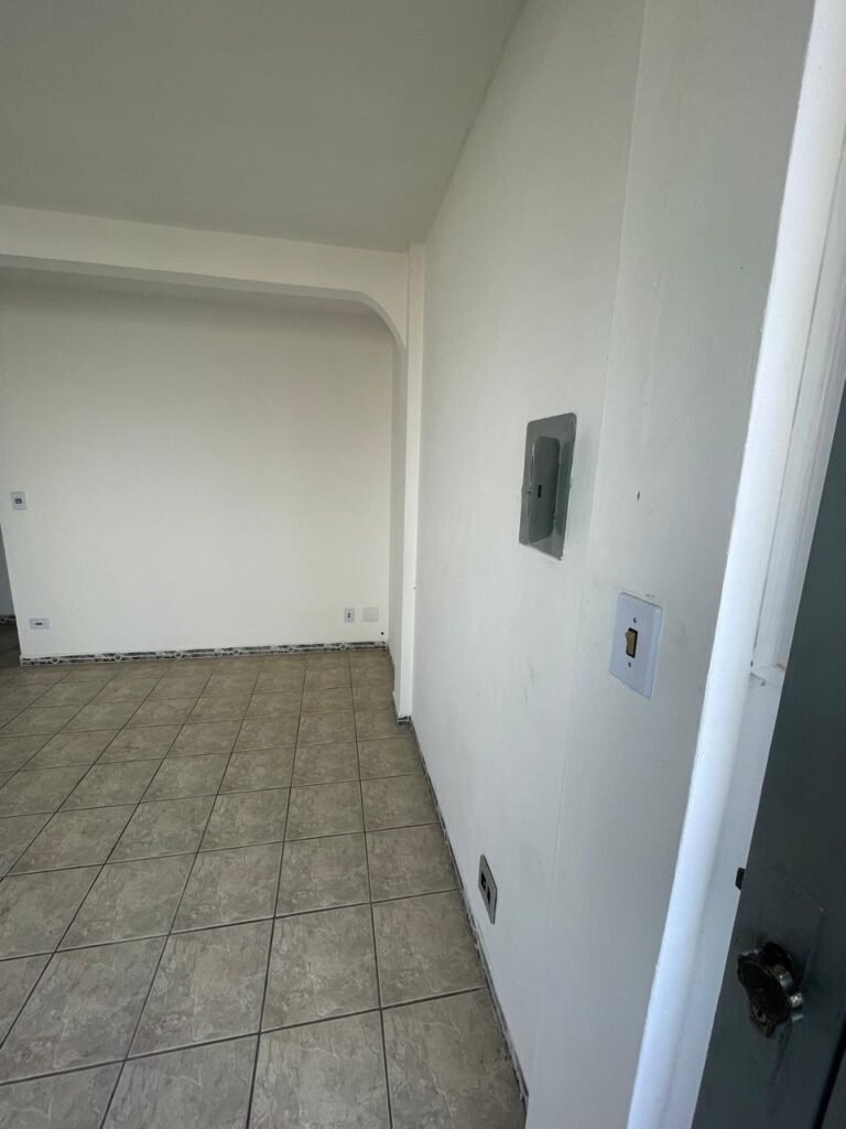 SALA-: 01 porta de ferro modelo imperial com pintura na cor cinza com desgastes naturais, com 04 vidros canelados em ordem com 02 travas em ordem, com maçaneta com desgastes naturais e restante em ordem, com fechadura marca Arouca em ordem com chaves, piso e rodapés revestidos de pisos frios cerâmicos com manchas de tintas e desgastes naturais, paredes e teto com pintura na cor branco neve em ordem e com manchas de infiltrações, 01 fonte de cerâmica com desenhos, 01 sifão em inox em ordem, 01 spot sem lâmpada, 01 suporte de toalha de rosto em ordem, 06 espelhos de luz sendo eles, 01 com 01 interruptor em ordem, 01 com 02 interruptores em ordem, 02 com 01 tomada em ordem, 01 com 04 tomadas em ordem e 01 espelho cego em ordem, 01 caixa de proteção com tampa de ferro em ordem dos disjuntores gerais, 04 disjuntores sendo eles 02 de 25 e 02 de 15 em ordem. Janela de ferro com esquadrias com pintura na cor cinza, com desgaste natural, contendo 28 vidros canelados em ordem, contendo 03 fechaduras e 01 trinco para por cadeado em ordem, 01 bocal de lâmpada.