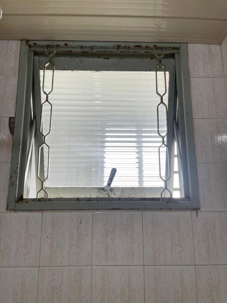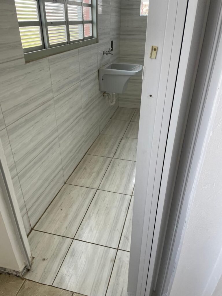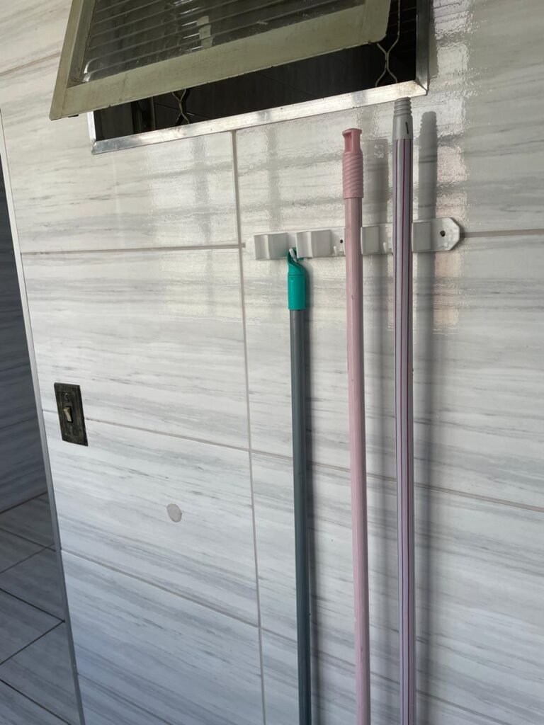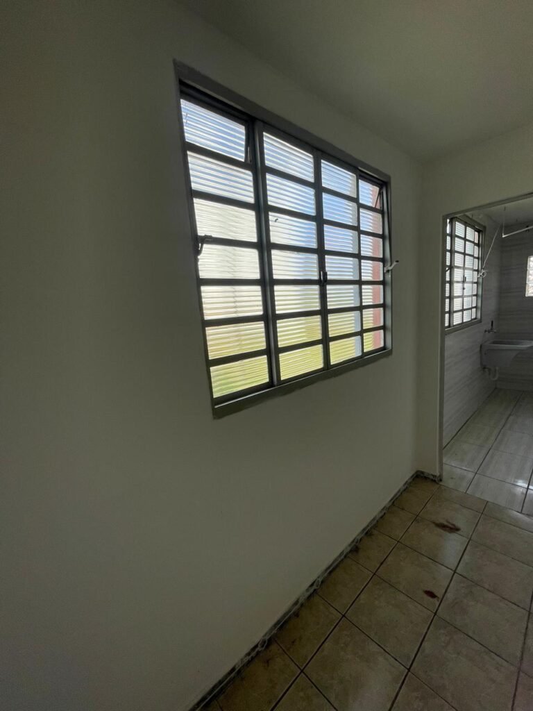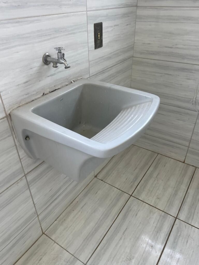 LAVANDERIA-: 01 porta sanfonada cor branco marca BCF, com 01 puxador em ordem e o outro faltando, piso e parede revestidas de pisos frios cerâmicos com desgastes naturais, furos com buchas e pregos, teto com pintura na cor branco neve com desgaste natural e restante em ordem, 01 janela de ferro com esquadrias com pintura na cor cinza com desgastes naturais, contendo 28 vidros canelados em ordem, contendo 03 fechaduras e 01 trinco para por cadeado em ordem, 01 suporte de vassouras parafusado na parede, 05 espelhos de luz com desgaste natural sendo eles, 04 tomadas em ordem e 01 interruptor em ordem, 01 espelho de luz com 02 tomadas em ordem, 01 tanque de cerâmica cor cinza com desgaste natural, marca Icasa, 01 torneira dupla em inox em ordem, marca Hidro Fix, 01 sifão sanfonado em ordem, 02 suportes de varão de plástico cor branco, 01 varal portátil parafusado no teto com cordas com desgaste natural, 09 blocos de vidro quadriculado em ordem, 01 bocal com 01 lâmpada Led em ordem, 01 espelho de bocal em ordem, pia com estrutura revestida pisos frios cerâmicos com 02 pedras de mármore em ordem, cuba de inox em ordem, com 01 sifão sanfonado em ordem, 01 torneira de inox pingando e restante em ordem, 01 suporte de inox de sabonete, 01 sifão sanfonado em ordem.