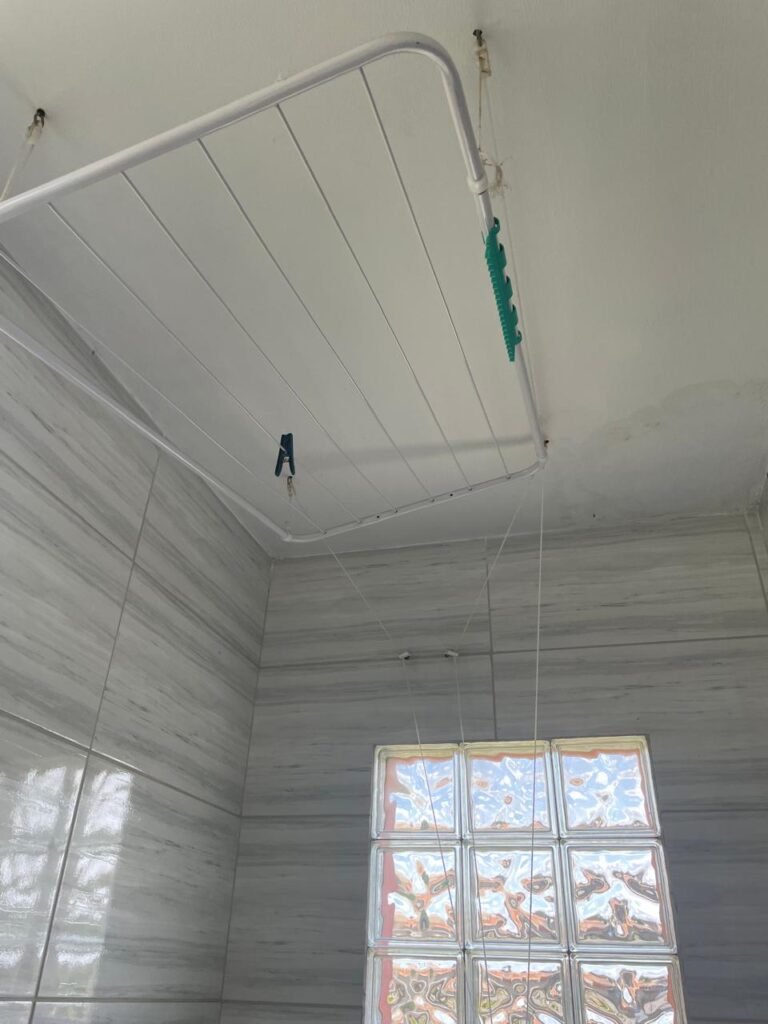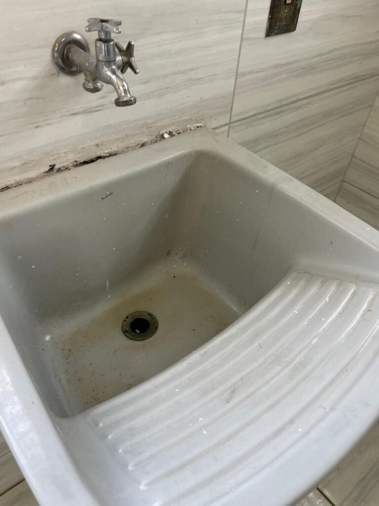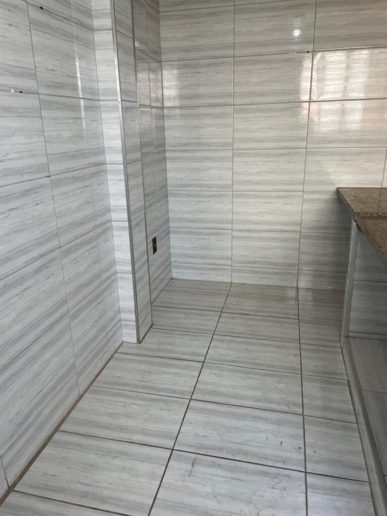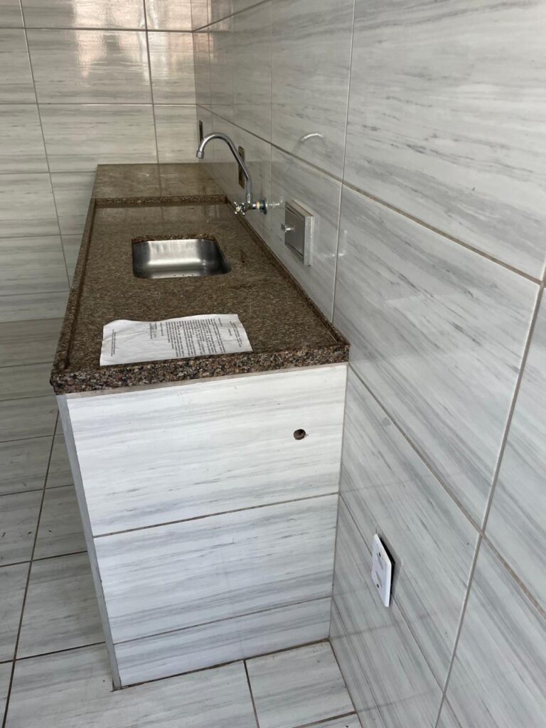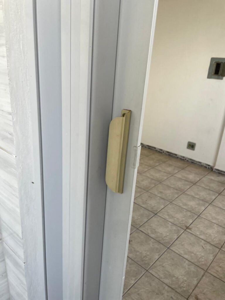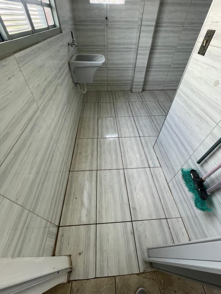 LAVANDERIA-: 01 porta sanfonada cor branco marca BCF, com 01 puxador em ordem e o outro faltando, piso e parede revestidas de pisos frios cerâmicos com desgastes naturais, furos com buchas e pregos, teto com pintura na cor branco neve com desgaste natural e restante em ordem, 01 janela de ferro com esquadrias com pintura na cor cinza com desgastes naturais, contendo 28 vidros canelados em ordem, contendo 03 fechaduras e 01 trinco para por cadeado em ordem, 01 suporte de vassouras parafusado na parede, 05 espelhos de luz com desgaste natural sendo eles, 04 tomadas em ordem e 01 interruptor em ordem, 01 espelho de luz com 02 tomadas em ordem, 01 tanque de cerâmica cor cinza com desgaste natural, marca Icasa, 01 torneira dupla em inox em ordem, marca Hidro Fix, 01 sifão sanfonado em ordem, 02 suportes de varão de plástico cor branco, 01 varal portátil parafusado no teto com cordas com desgaste natural, 09 blocos de vidro quadriculado em ordem, 01 bocal com 01 lâmpada Led em ordem, 01 espelho de bocal em ordem, pia com estrutura revestida pisos frios cerâmicos com 02 pedras de mármore em ordem, cuba de inox em ordem, com 01 sifão sanfonado em ordem, 01 torneira de inox pingando e restante em ordem, 01 suporte de inox de sabonete, 01 sifão sanfonado em ordem.