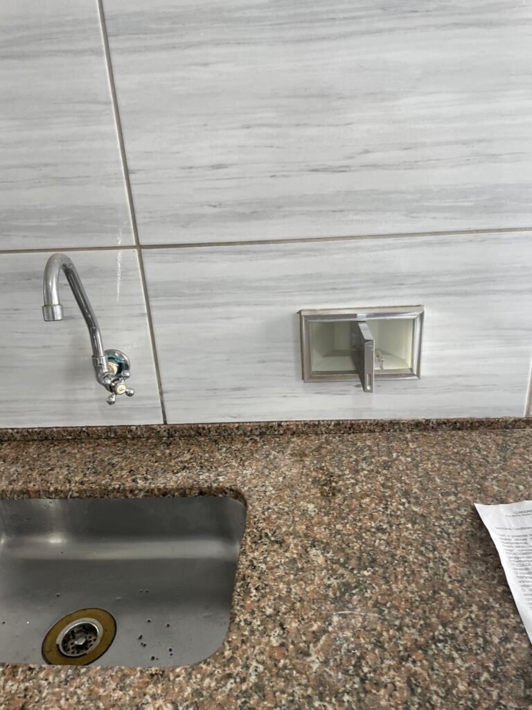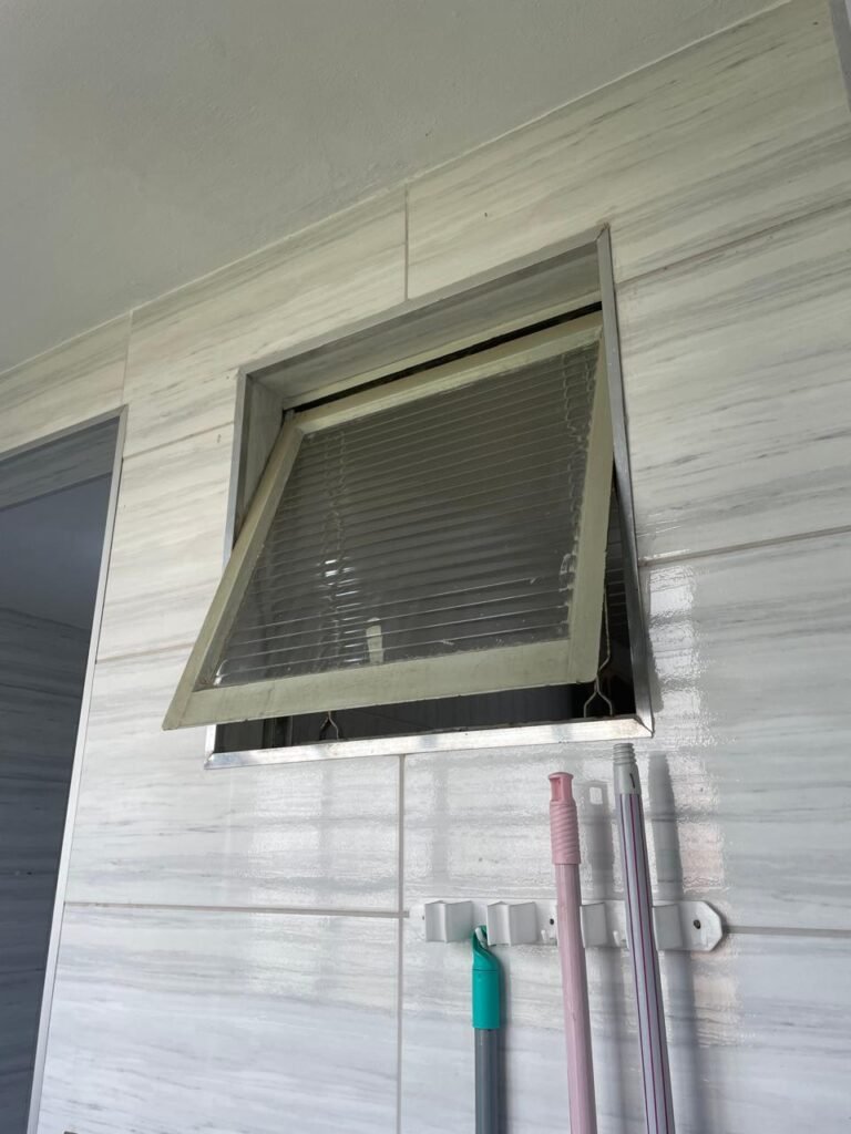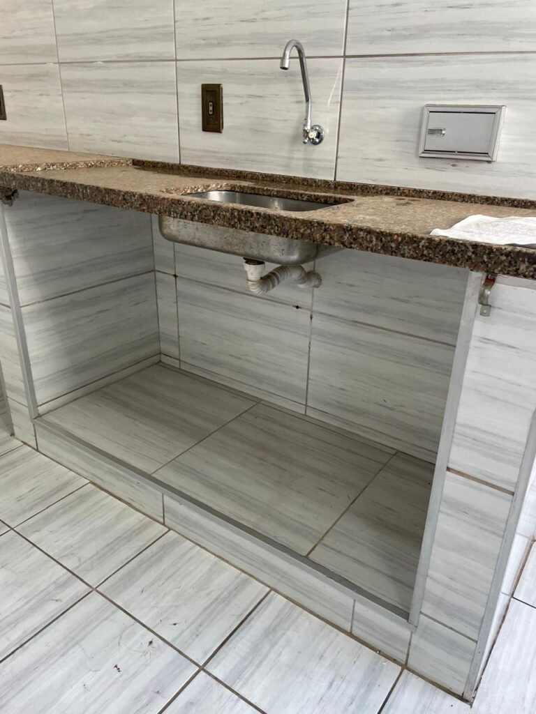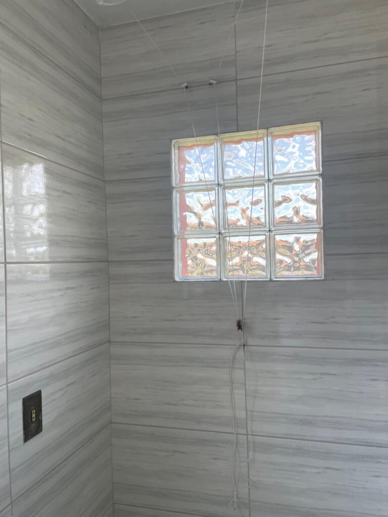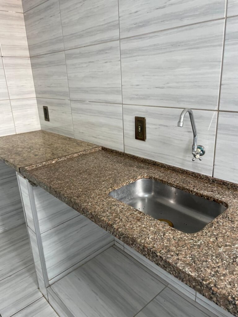 LAVANDERIA-: 01 porta sanfonada cor branco marca BCF, com 01 puxador em ordem e o outro faltando, piso e parede revestidas de pisos frios cerâmicos com desgastes naturais, furos com buchas e pregos, teto com pintura na cor branco neve com desgaste natural e restante em ordem, 01 janela de ferro com esquadrias com pintura na cor cinza com desgastes naturais, contendo 28 vidros canelados em ordem, contendo 03 fechaduras e 01 trinco para por cadeado em ordem, 01 suporte de vassouras parafusado na parede, 05 espelhos de luz com desgaste natural sendo eles, 04 tomadas em ordem e 01 interruptor em ordem, 01 espelho de luz com 02 tomadas em ordem, 01 tanque de cerâmica cor cinza com desgaste natural, marca Icasa, 01 torneira dupla em inox em ordem, marca Hidro Fix, 01 sifão sanfonado em ordem, 02 suportes de varão de plástico cor branco, 01 varal portátil parafusado no teto com cordas com desgaste natural, 09 blocos de vidro quadriculado em ordem, 01 bocal com 01 lâmpada Led em ordem, 01 espelho de bocal em ordem, pia com estrutura revestida pisos frios cerâmicos com 02 pedras de mármore em ordem, cuba de inox em ordem, com 01 sifão sanfonado em ordem, 01 torneira de inox pingando e restante em ordem, 01 suporte de inox de sabonete, 01 sifão sanfonado em ordem.