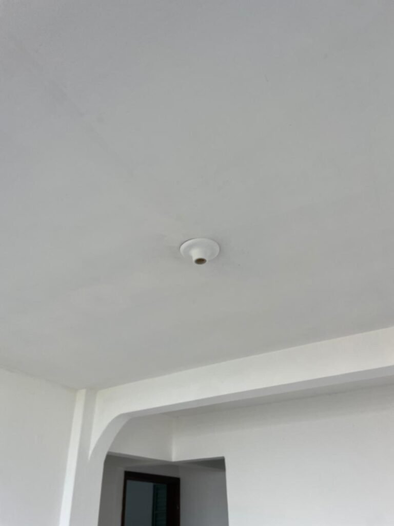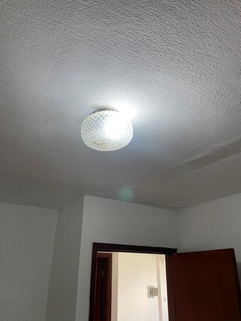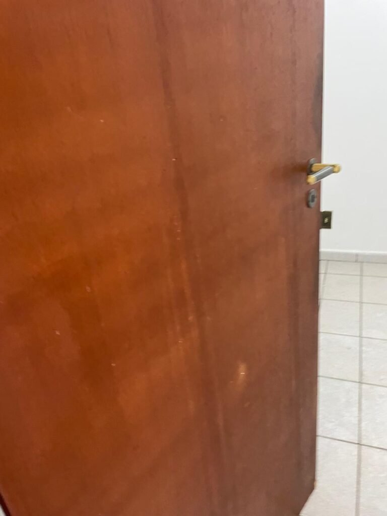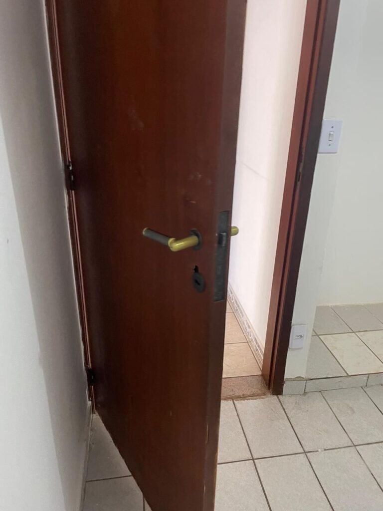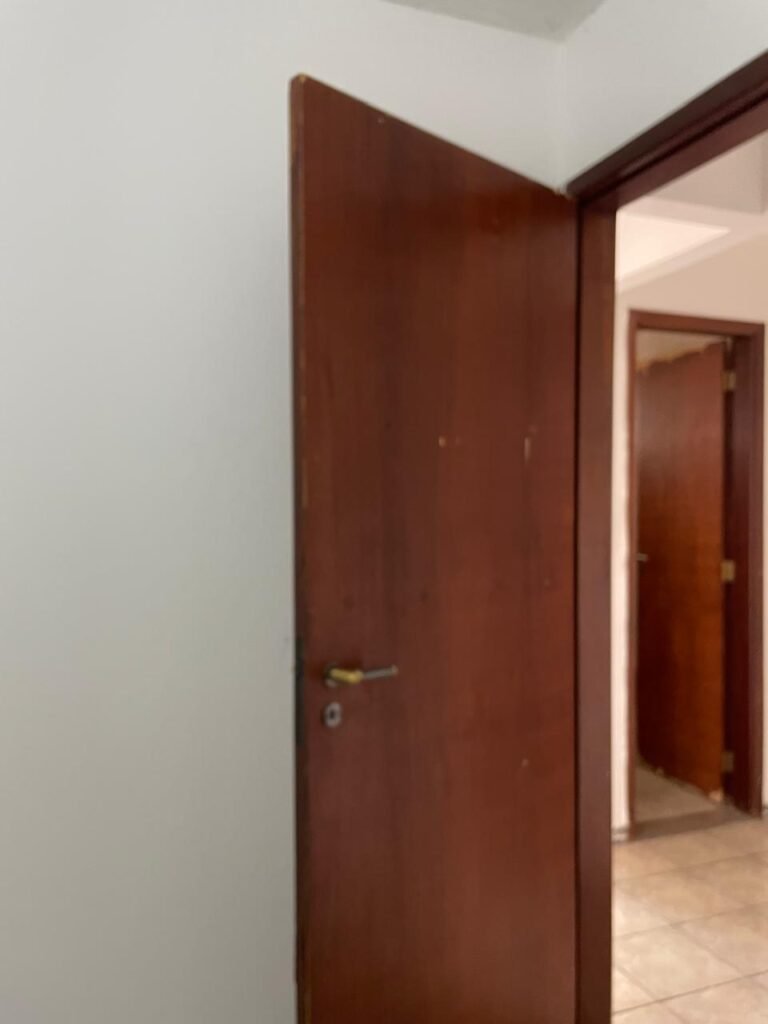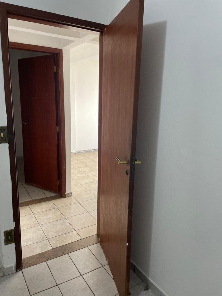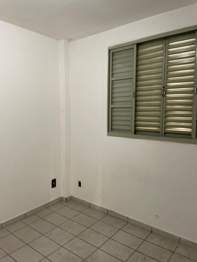 QUARTO 02-: 01 porta de madeira com batente de madeira, com maçaneta em ordem, emperrando no chão, com fechadura em ordem, com 01 pistão pneumático em ordem, piso e rodapés revestidos de pisos frios cerâmicos com desgastes naturais, teto com pintura na cor branco neve com manchas de infiltrações, desgastes naturais e restante em ordem, 01 bocal com 01 lâmpada Led em ordem, 01 janela com 06 vidros lisos, com desgastes naturais, com 02 fechaduras e 01 trancas para cadeado, 06 espelhos de luz sendo eles, 02 interruptores em ordem, 03 com 01 tomada em ordem, 01 lustre com vidro com desgaste natural e restante em ordem, e 01 pré instalação de fio aparente.
