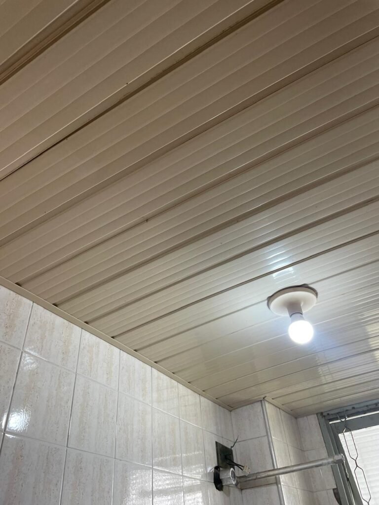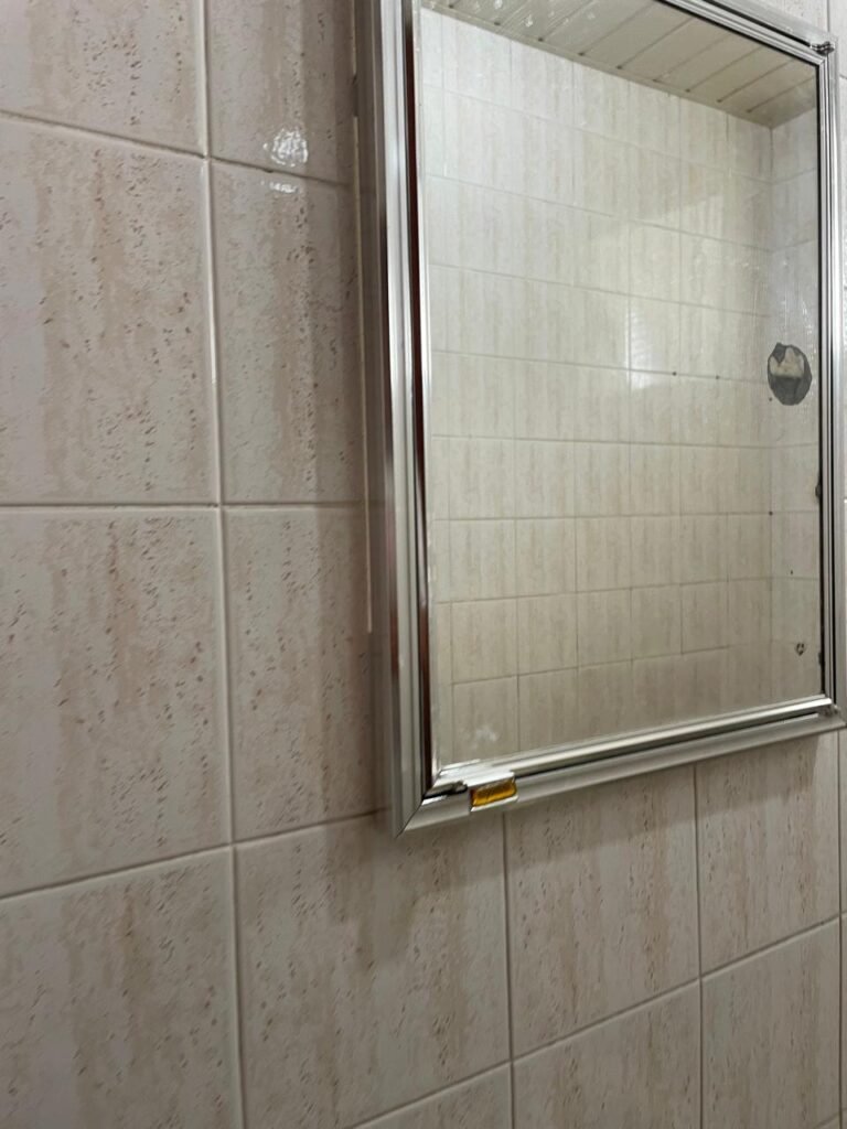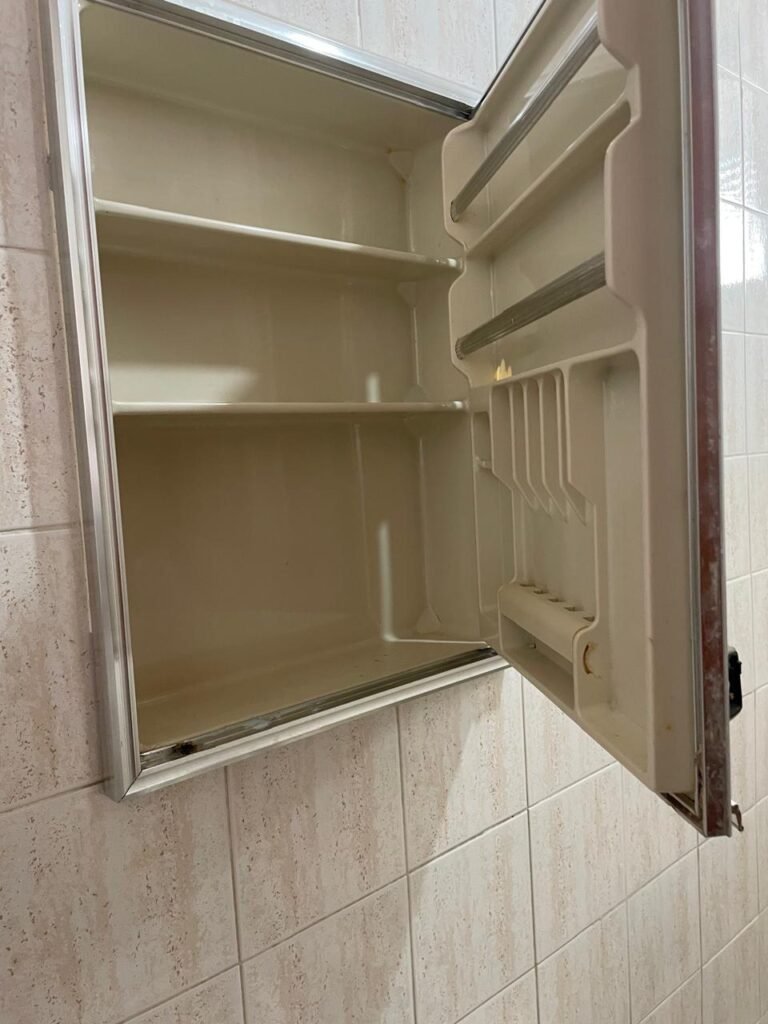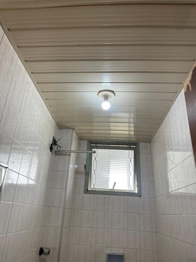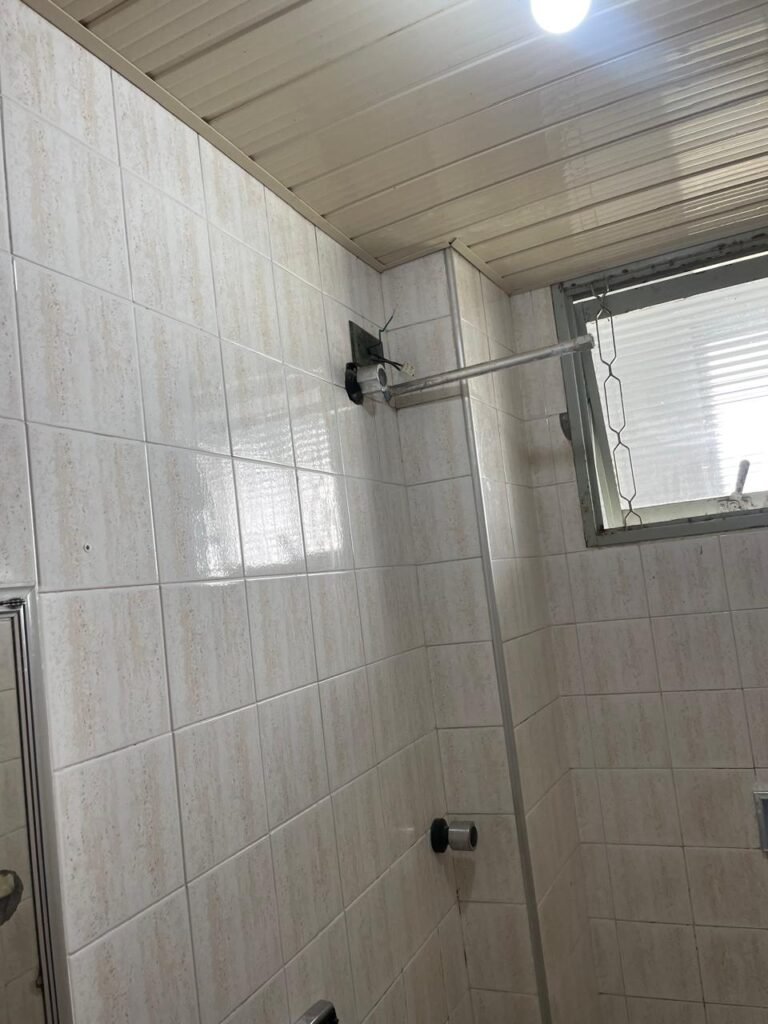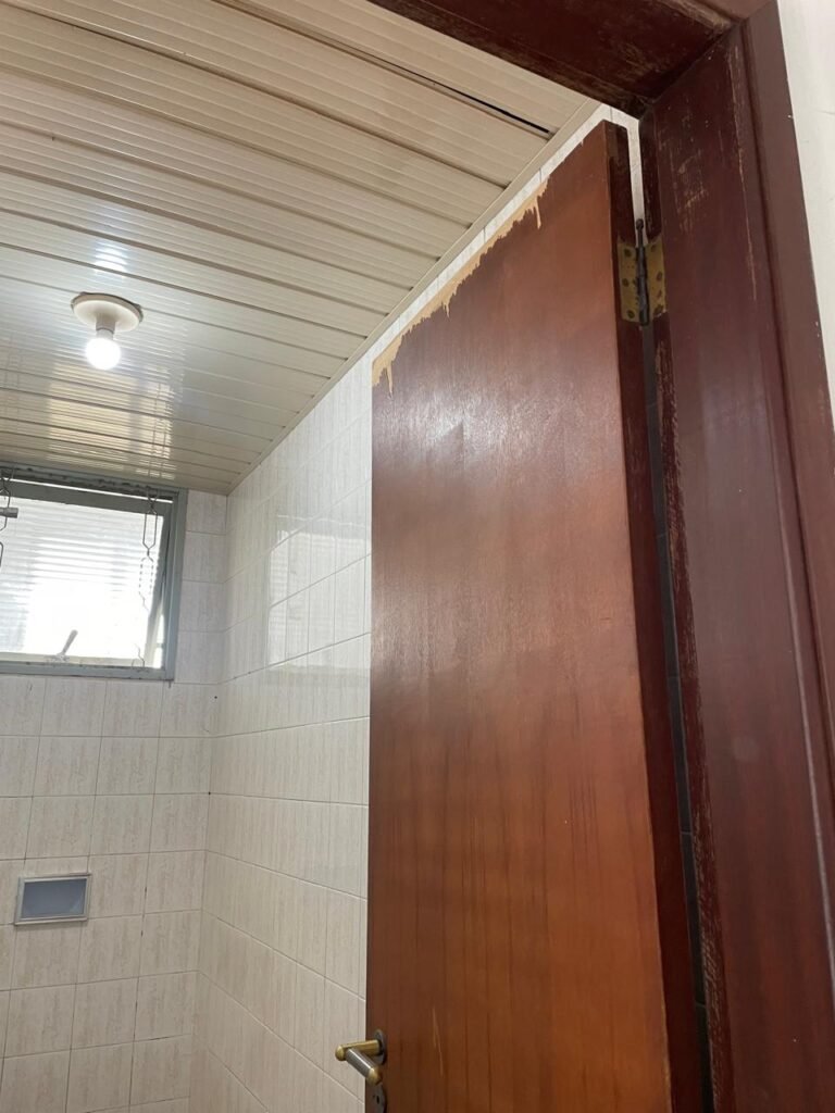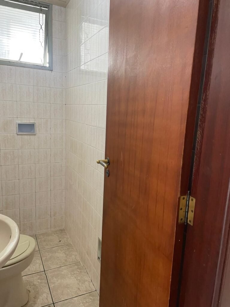 BANHEIRO-: 01 porta de madeira com batentes de madeira saindo lascas, com maçaneta com desgastes naturais e restante em ordem, com fechadura e chave embutida em ordem, piso revestido de pisos frios cerâmicos antiderrapantes, com desgaste natural e restante em ordem, paredes revestidas de pisos frios cerâmicos com buracos com buchas, alguns trincados e restante em ordem, teto com forro de pvc com desgastes naturais e restante em ordem, 01 suporte de papel higiênico embutido no banheiro, 01 armário com espelho de reflexo com desgaste natural marca Expambox, 01 bocal com 01 lâmpada Led em ordem, 01 pia com coluna de cerâmica cor creme com desgastes naturais e restante em ordem, com 01 torneira em inox pingando e restante em ordem, 01 vaso sanitário com tampa e acento cor creme, com desgastes naturais, válvula de descarga sem acabamento, descarga em ordem, 01 sifão sanfonado entupido, 02 canoplas em inox em ordem, 01 pré-instalação de chuveiro, 01 espelho de luz com fiação de chuveiro aparente, 01 suporte de sabonete em inox embutido, 01 vitrô basculante com esquadrias com pintura na cor cinza, com desgastes naturais, com 01 vidro canelado, com desgastes naturais e com 01 fechadura em ordem, 01 ralo em inox em ordem, 01 espelho com 01 interruptor e 01 tomada em ordem, 02 suportes para toalhas em inox sendo que 01 deles está com parte quebrada, 01 suporte com 05 ganchos de ferro na porta.