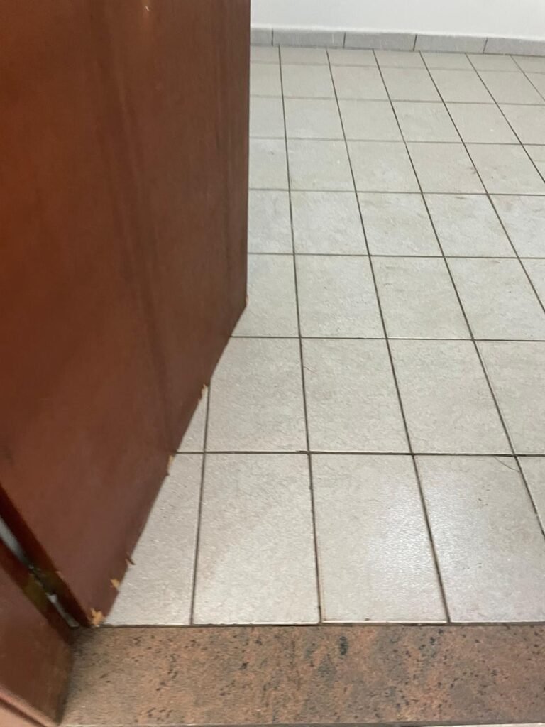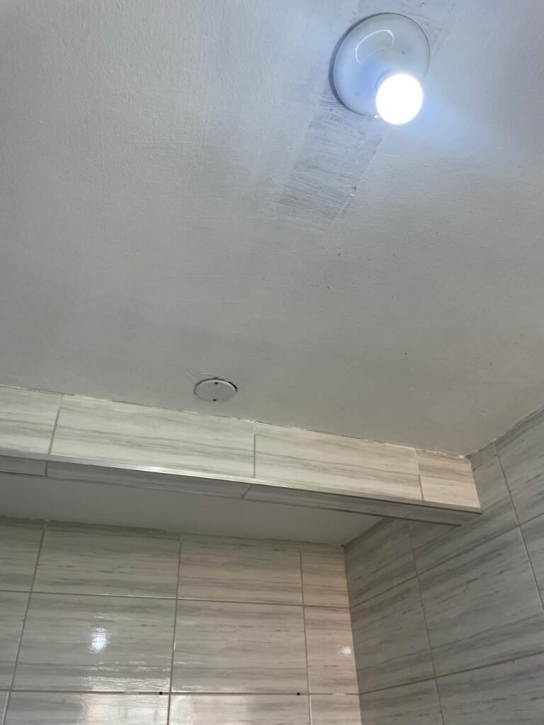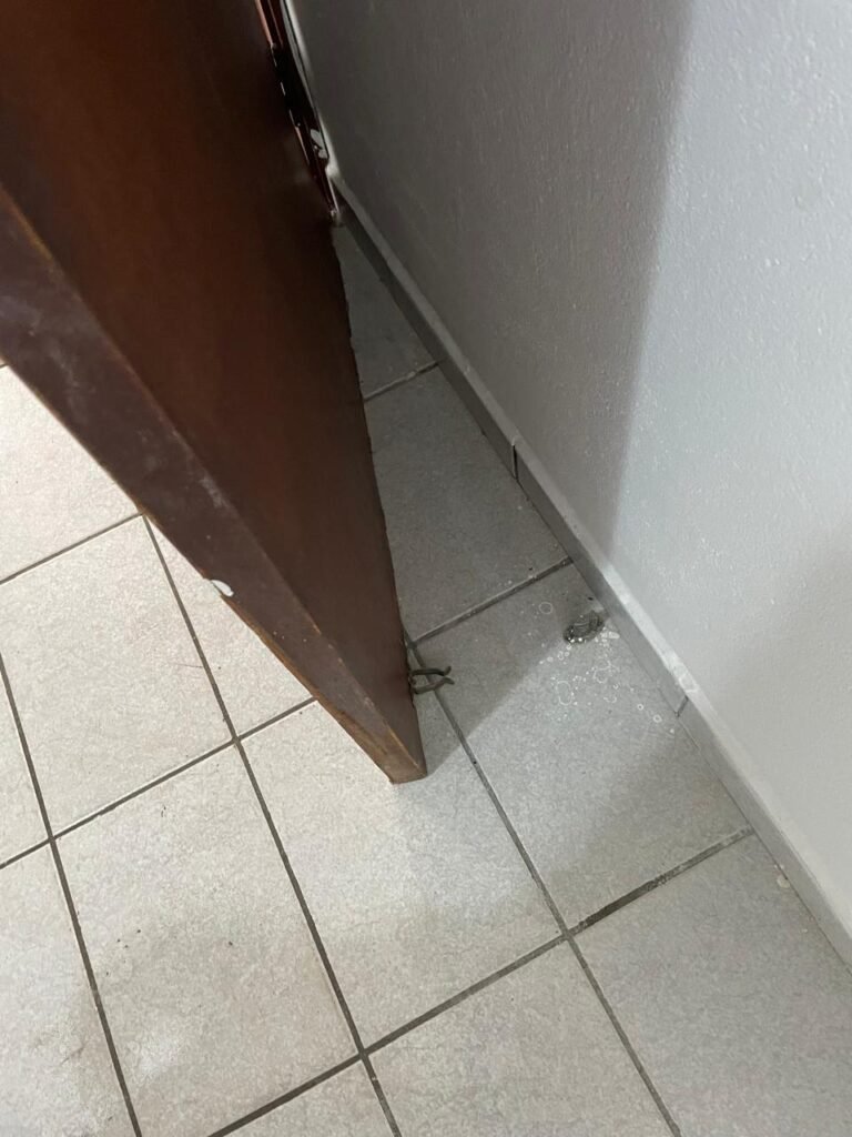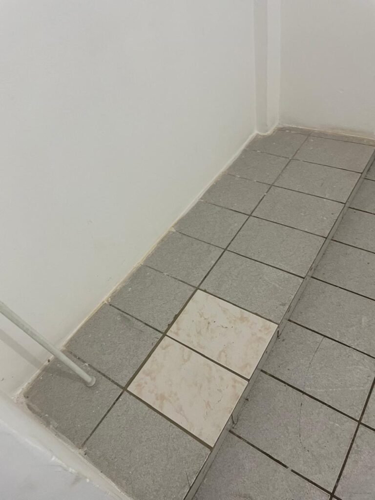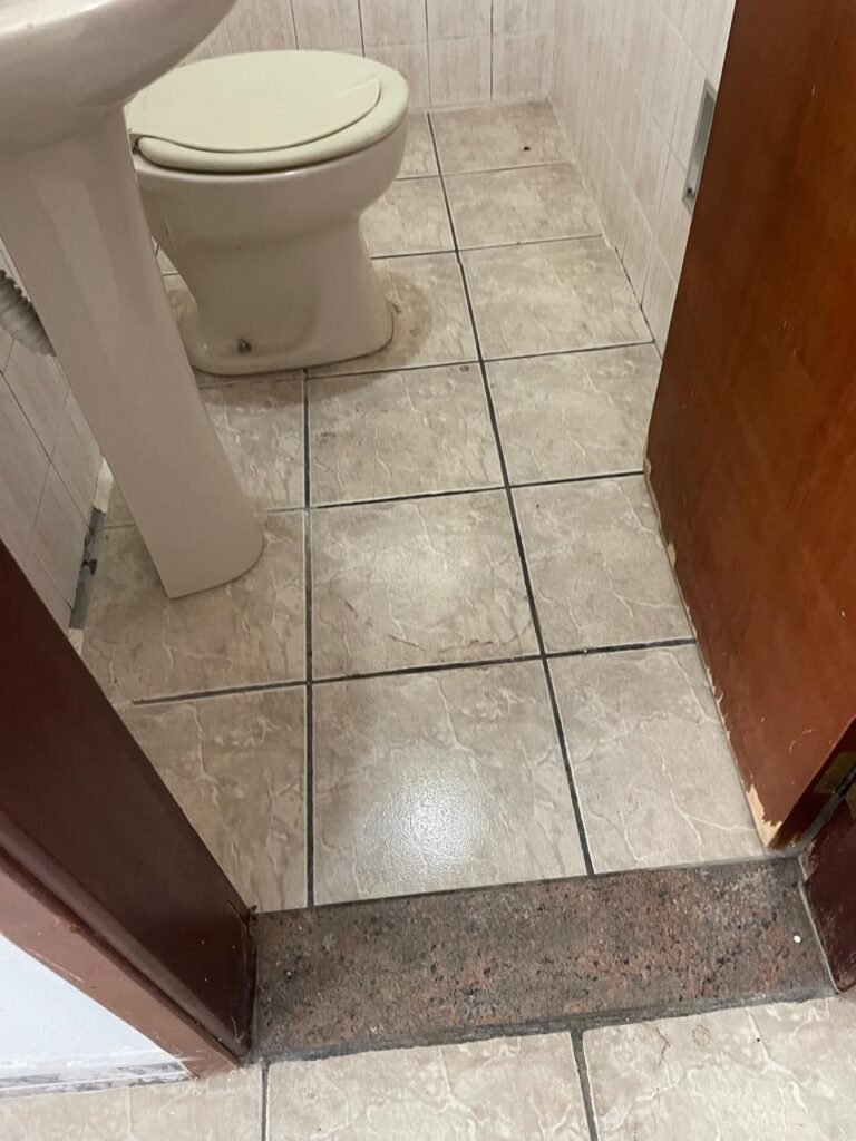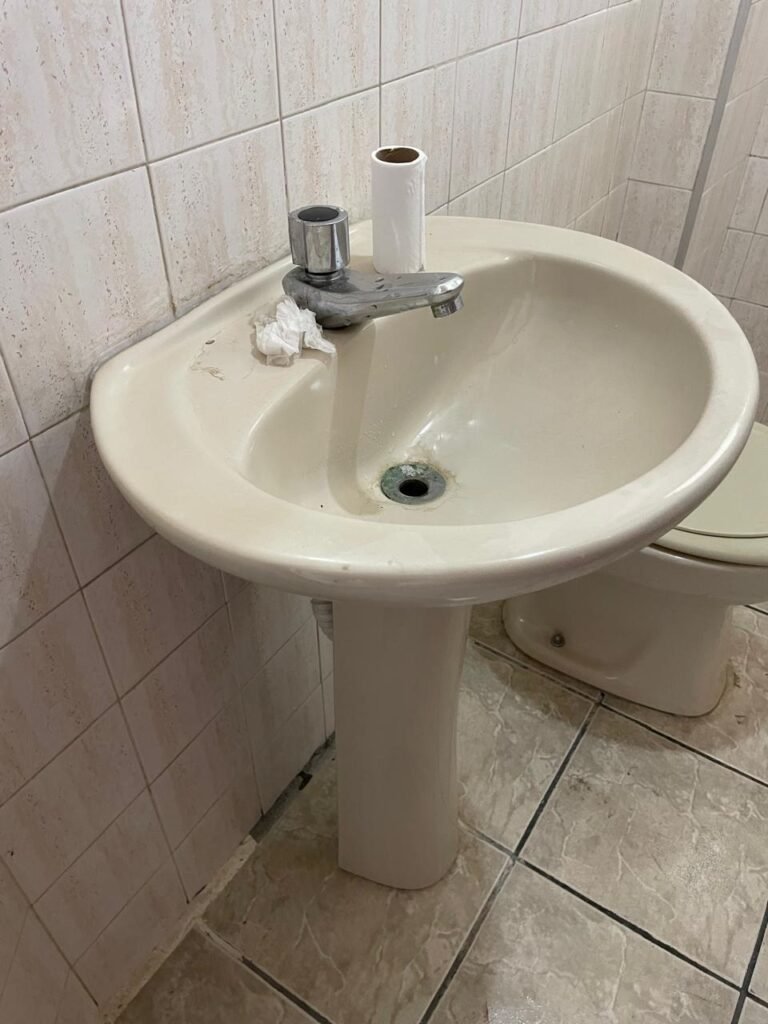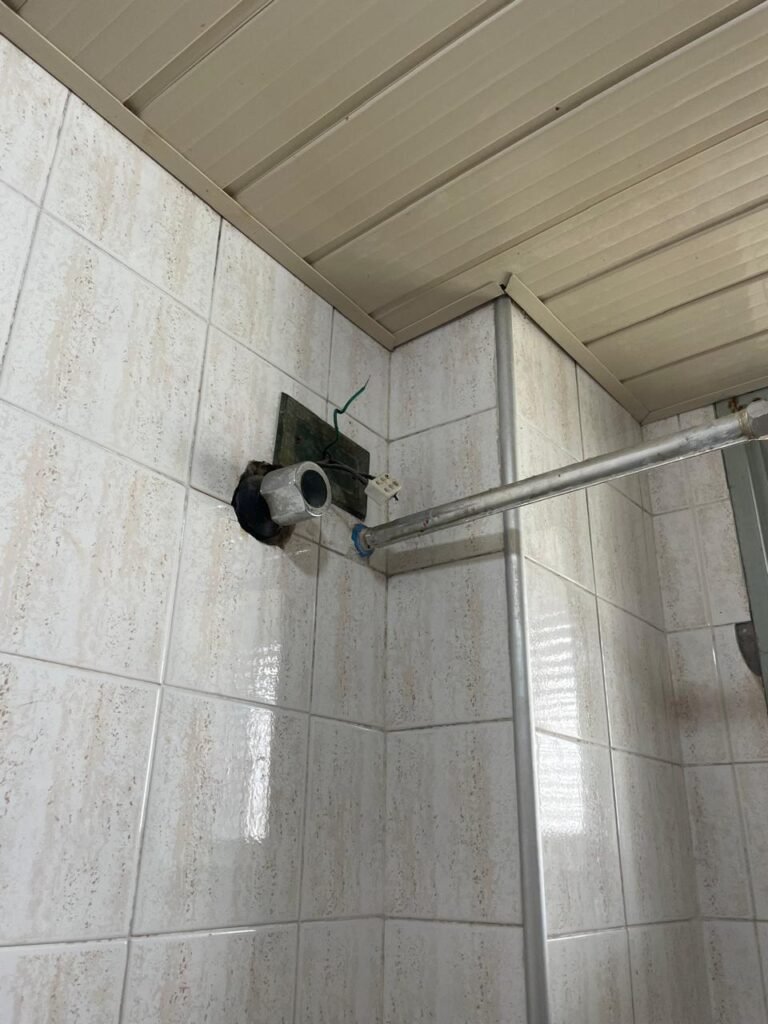 BANHEIRO-: 01 porta de madeira com batentes de madeira saindo lascas, com maçaneta com desgastes naturais e restante em ordem, com fechadura e chave embutida em ordem, piso revestido de pisos frios cerâmicos antiderrapantes, com desgaste natural e restante em ordem, paredes revestidas de pisos frios cerâmicos com buracos com buchas, alguns trincados e restante em ordem, teto com forro de pvc com desgastes naturais e restante em ordem, 01 suporte de papel higiênico embutido no banheiro, 01 armário com espelho de reflexo com desgaste natural marca Expambox, 01 bocal com 01 lâmpada Led em ordem, 01 pia com coluna de cerâmica cor creme com desgastes naturais e restante em ordem, com 01 torneira em inox pingando e restante em ordem, 01 vaso sanitário com tampa e acento cor creme, com desgastes naturais, válvula de descarga sem acabamento, descarga em ordem, 01 sifão sanfonado entupido, 02 canoplas em inox em ordem, 01 pré-instalação de chuveiro, 01 espelho de luz com fiação de chuveiro aparente, 01 suporte de sabonete em inox embutido, 01 vitrô basculante com esquadrias com pintura na cor cinza, com desgastes naturais, com 01 vidro canelado, com desgastes naturais e com 01 fechadura em ordem, 01 ralo em inox em ordem, 01 espelho com 01 interruptor e 01 tomada em ordem, 02 suportes para toalhas em inox sendo que 01 deles está com parte quebrada, 01 suporte com 05 ganchos de ferro na porta.