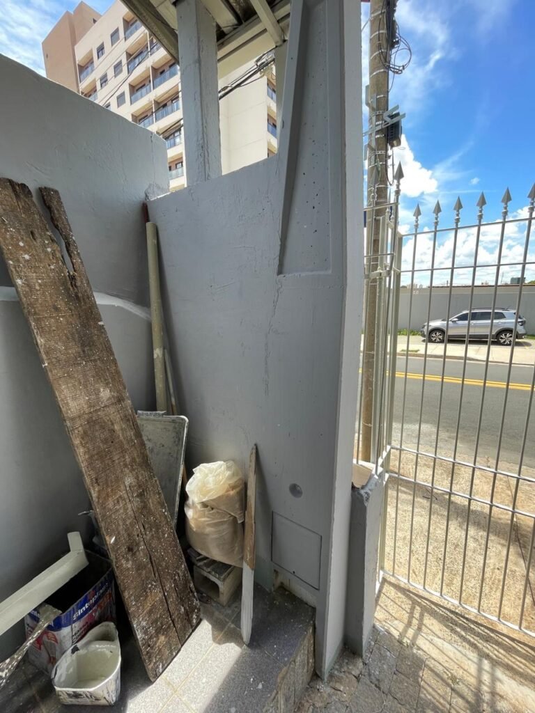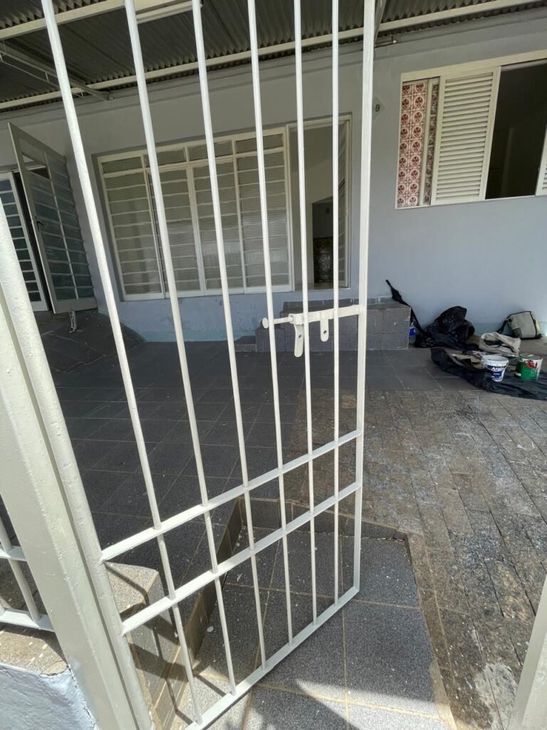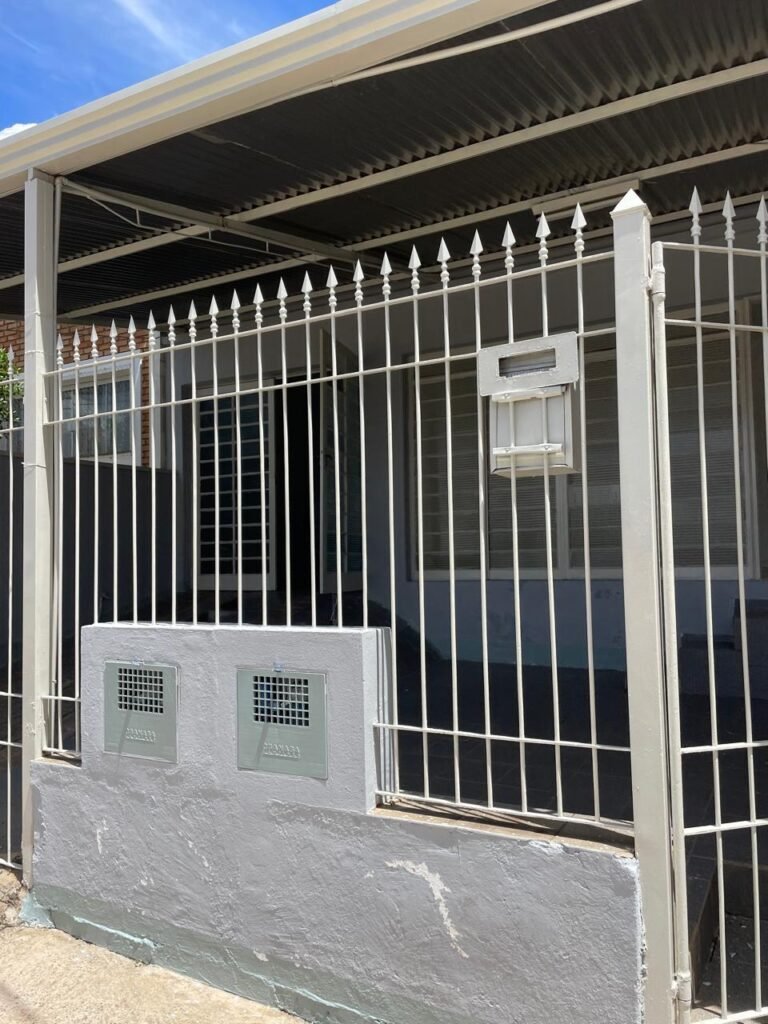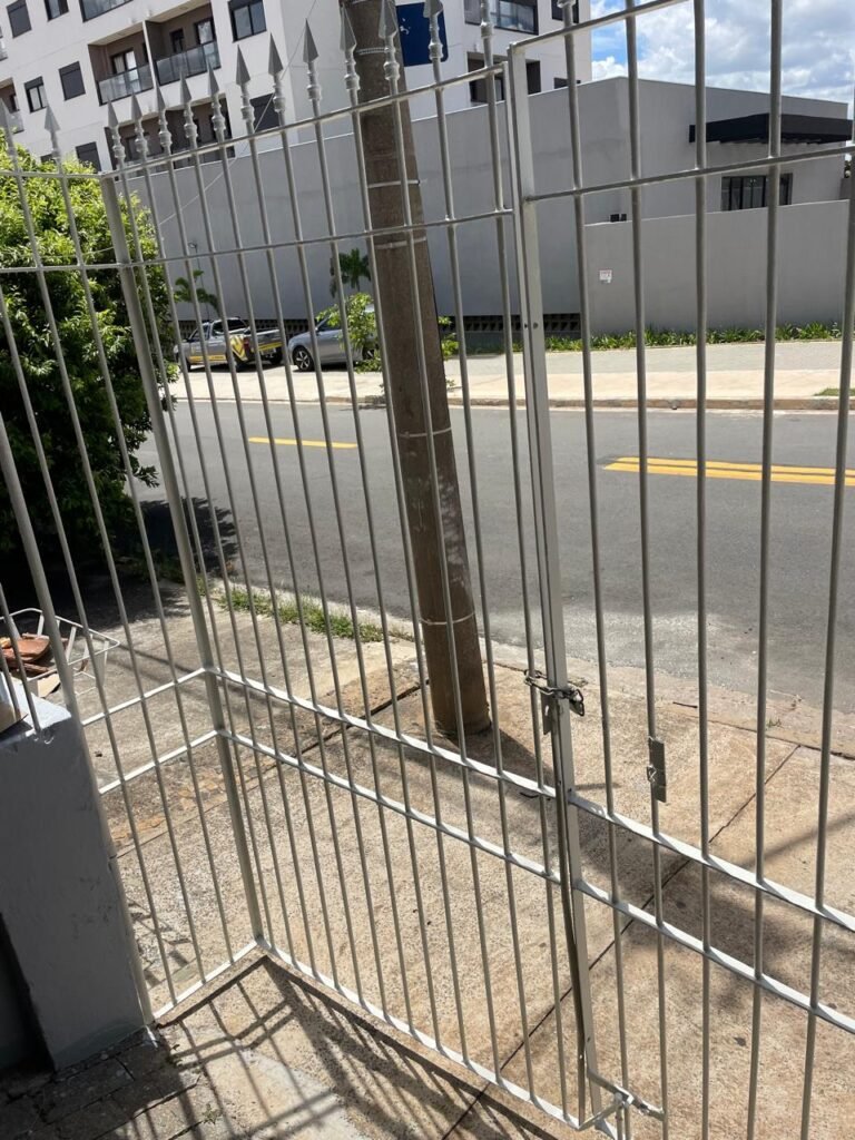 FACHADA-:Calçada concretada com desgastes naturais e restante em ordem, 01 lixeira de ferro com pintura cor branco em ordem, muro com pintura nova nas cores cinza granizo e cinza médio em ordem, 02 caixas com tampa de proteção padrão Sanasa, 02 hidrômetros em ordem, 02 portões de ferro com pintura na cor branco em ordem, sendo 01 deles com fechadura em ordem e o outro com corrente e cadeado marca Papaiz em ordem, 01 portão de ferro social com pintura na cor branco nova e em ordem, com fechadura em ordem, 01 caixa de correspondências de ferro com pintura nova na cor branco, com 01 porta em ordem e 01 puxador em ordem.