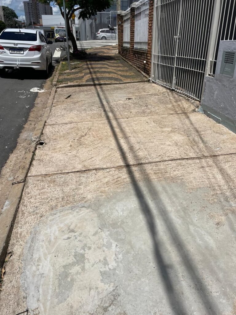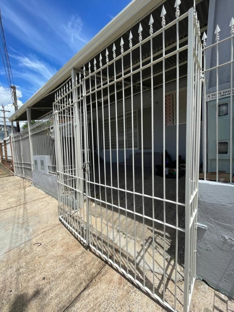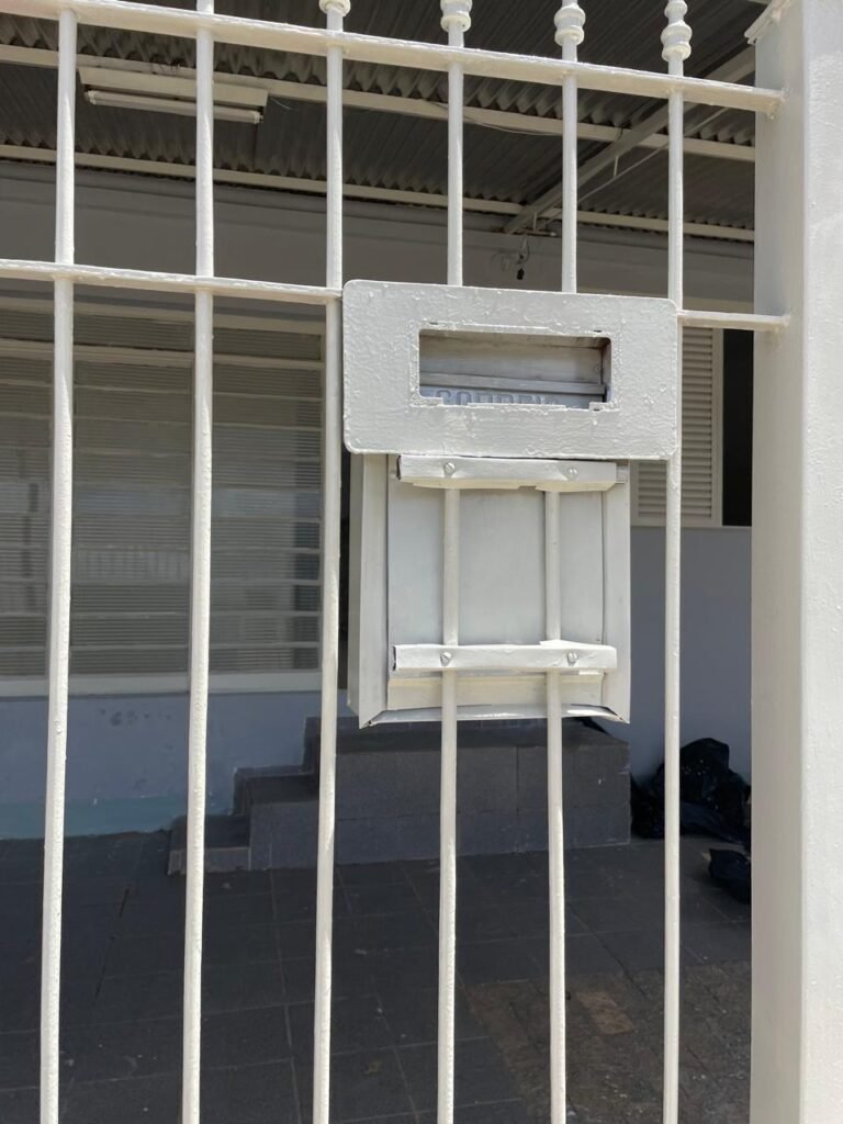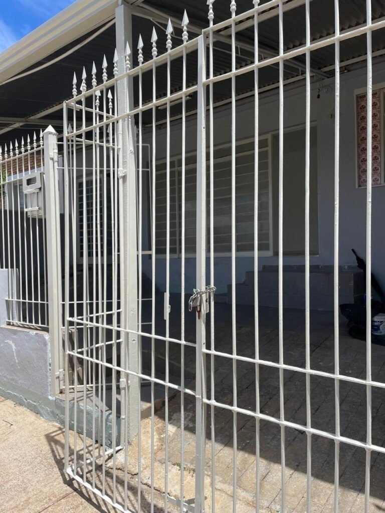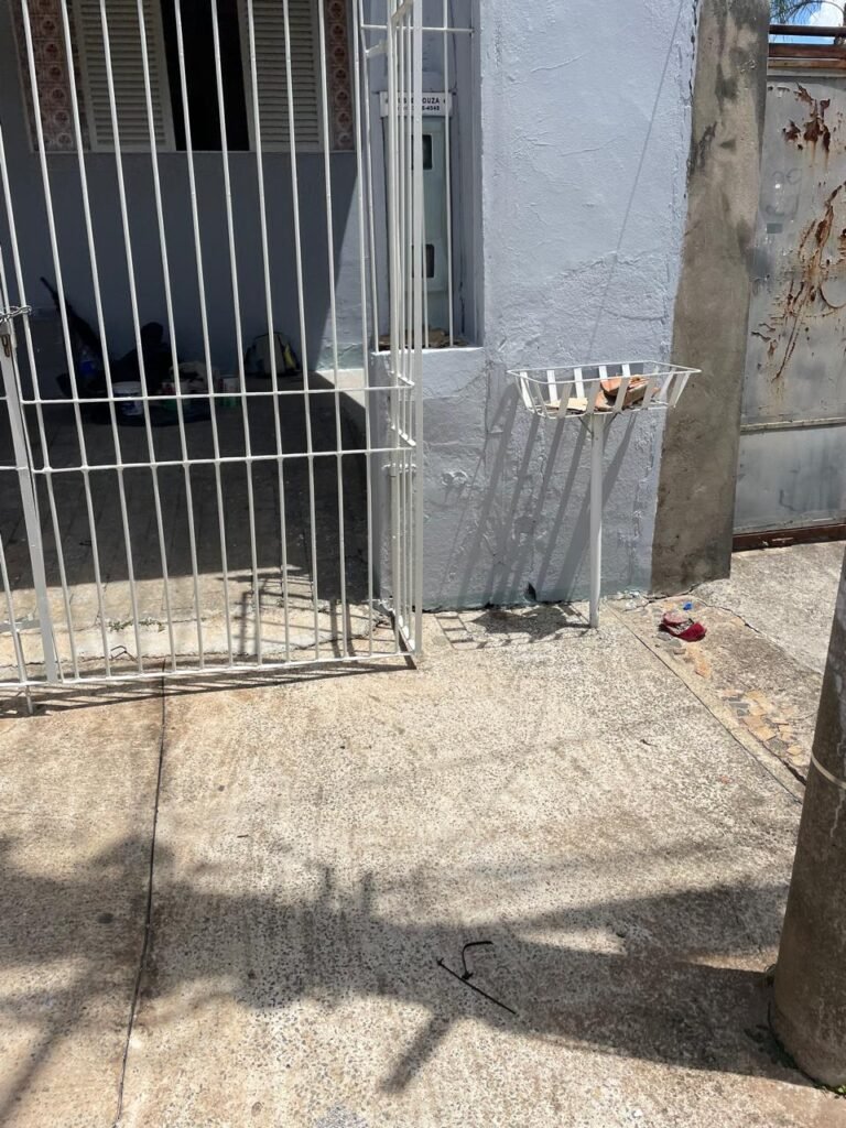FACHADA-:Calçada concretada com desgastes naturais e restante em ordem, 01 lixeira de ferro com pintura cor branco em ordem, muro com pintura nova nas cores cinza granizo e cinza médio em ordem, 02 caixas com tampa de proteção padrão Sanasa, 02 hidrômetros em ordem, 02 portões de ferro com pintura na cor branco em ordem, sendo 01 deles com fechadura em ordem e o outro com corrente e cadeado marca Papaiz em ordem, 01 portão de ferro social com pintura na cor branco nova e em ordem, com fechadura em ordem, 01 caixa de correspondências de ferro com pintura nova na cor branco, com 01 porta em ordem e 01 puxador em ordem.