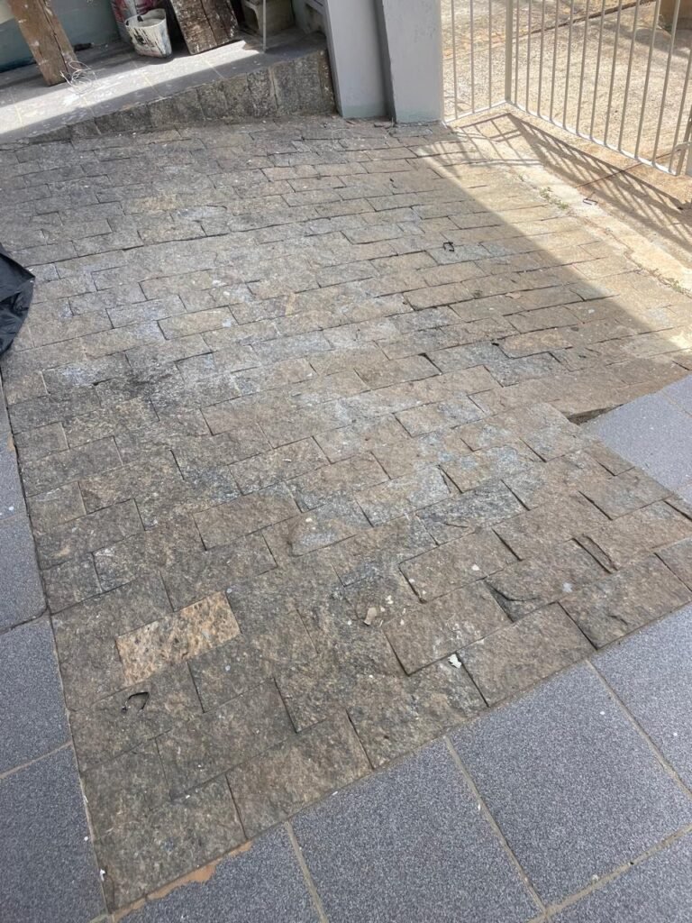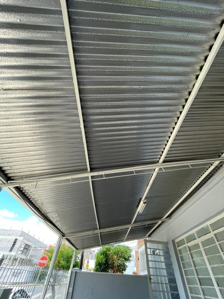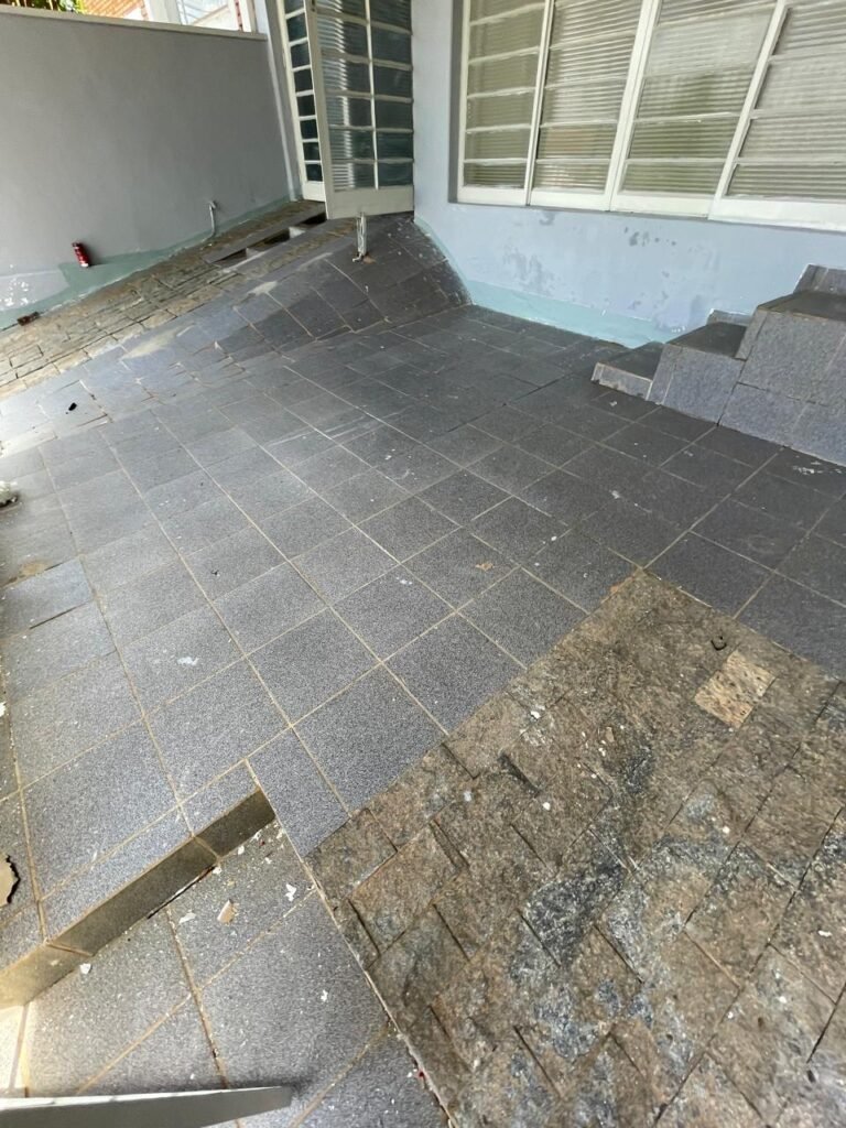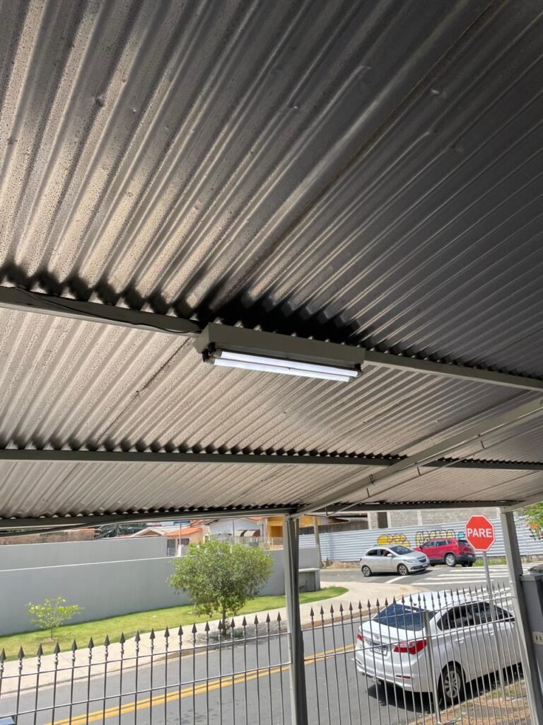 GARAGEM-: Piso frio cerâmico com desgaste natural e restante com partes em pedra Miracema em ordem, 01 poste padrão Concrefer, com tampa e medidor elétrico em ordem, 02 canoplas de registro em ordem, 01 torneira de jardim em ordem, paredes com pintura nova nas cores cinza granizo e cinza médio em ordem, telhado revestido de telhas galvanizadas em ordem, 01 luminária com 02 lâmpadas florescentes tubulares em ordem.