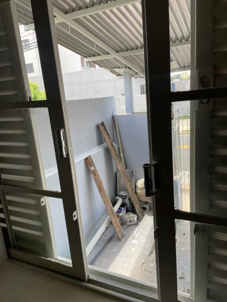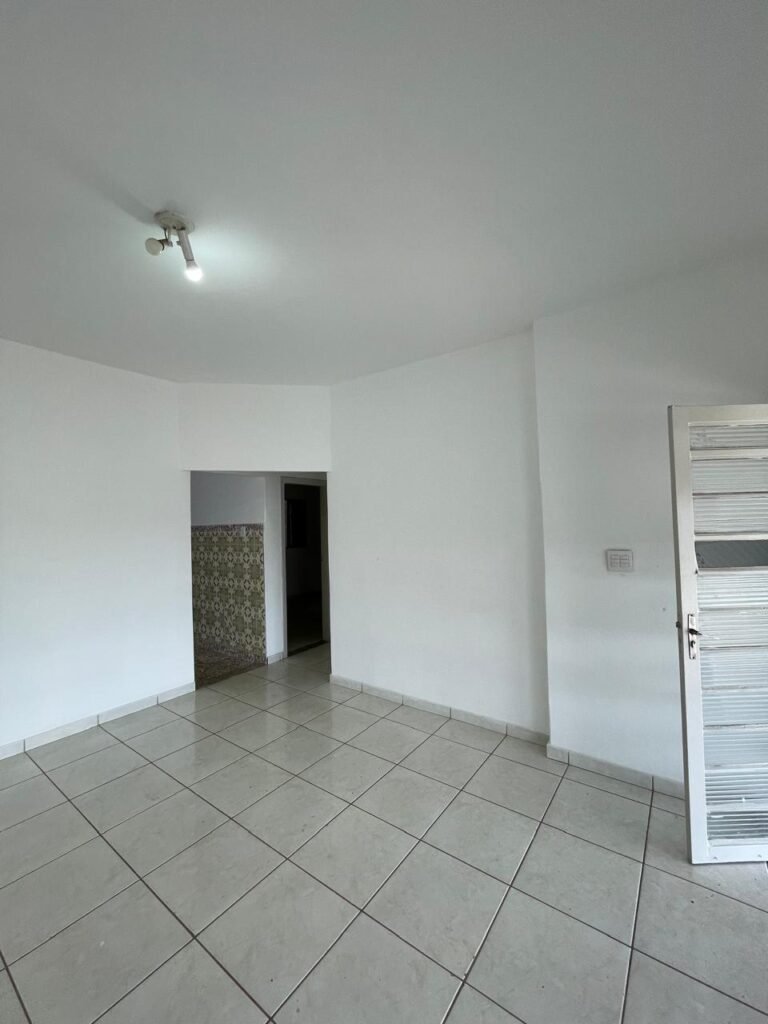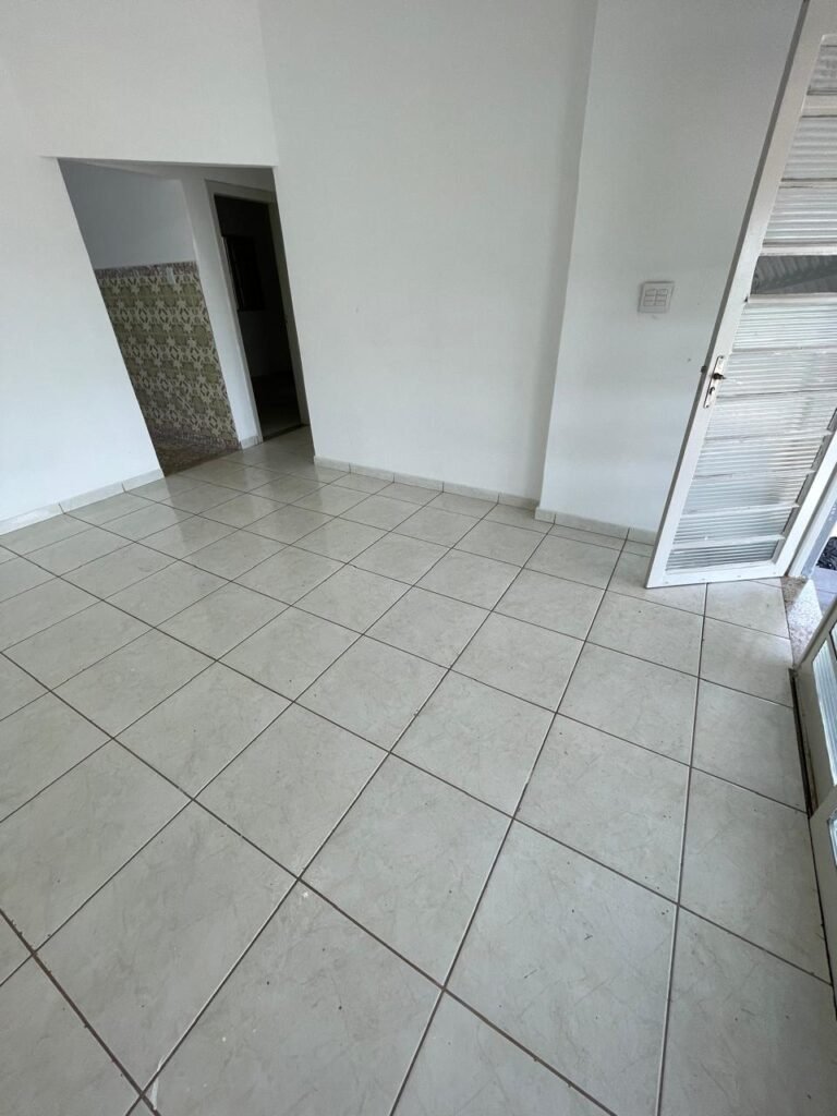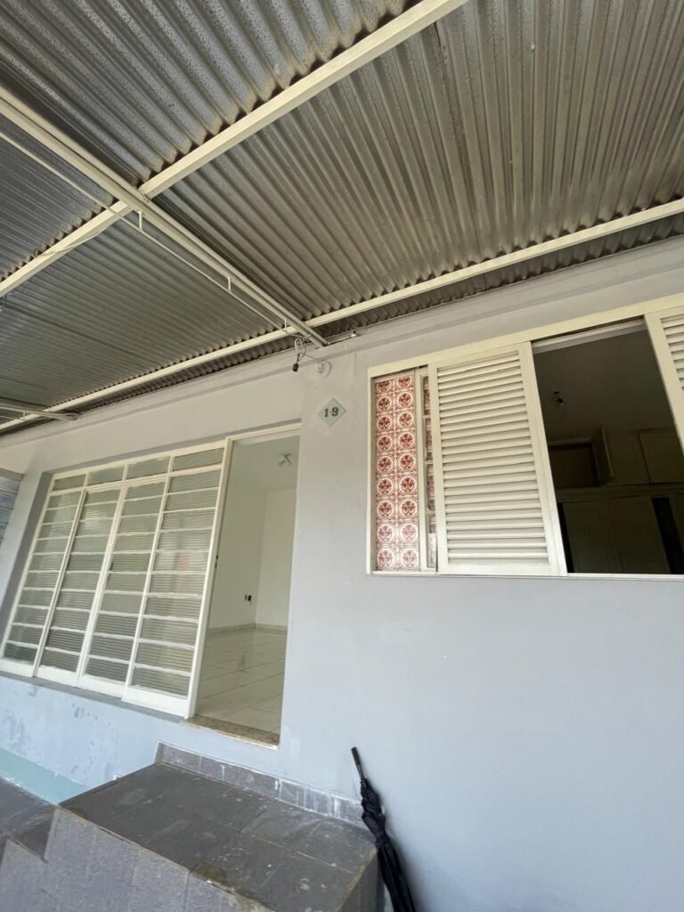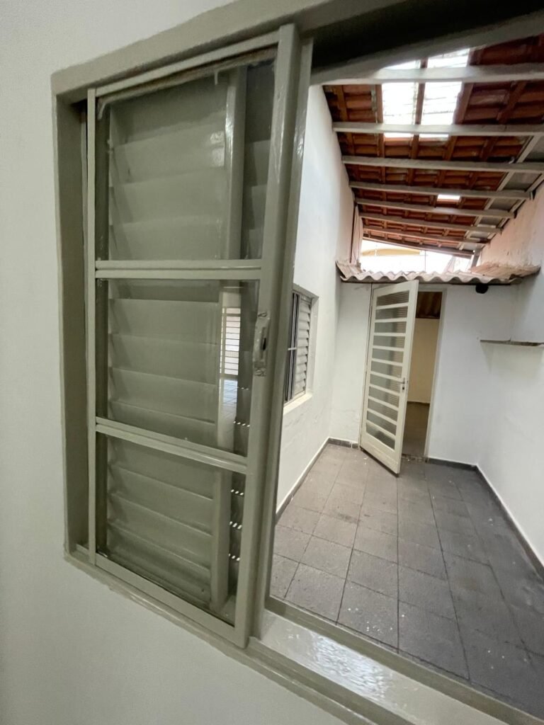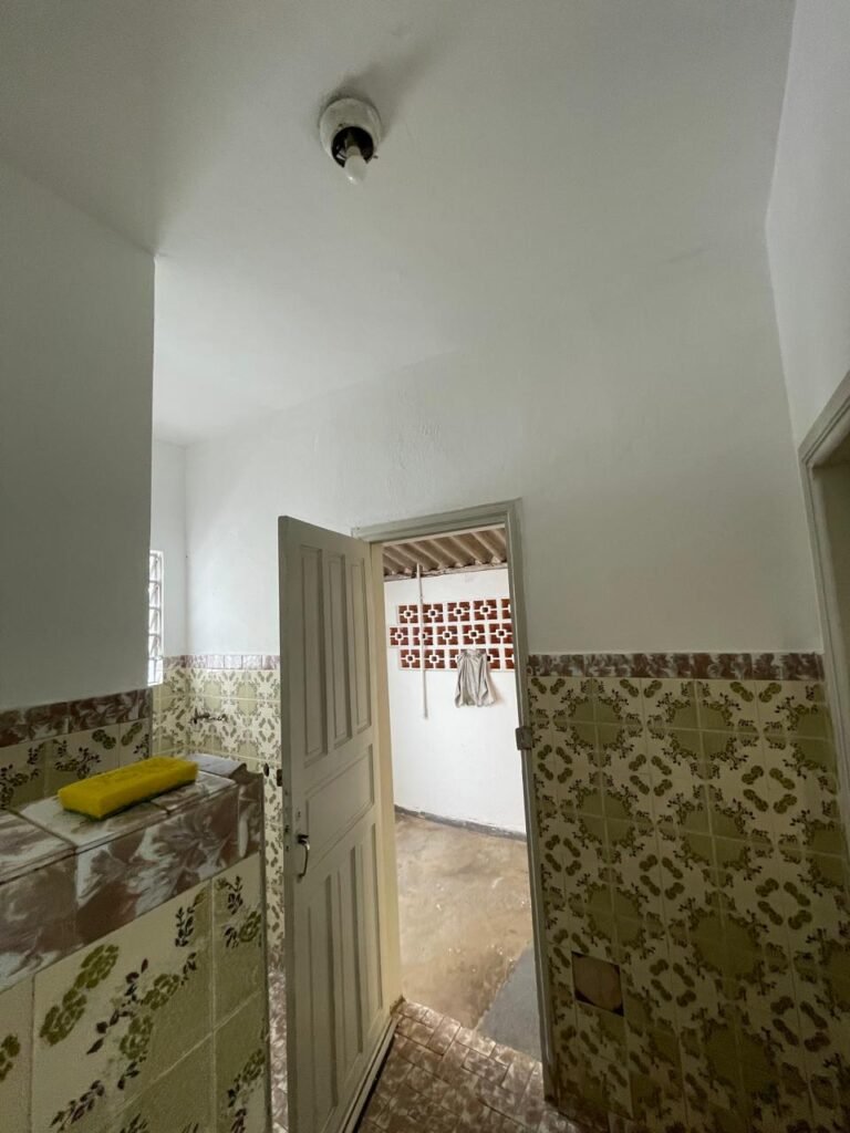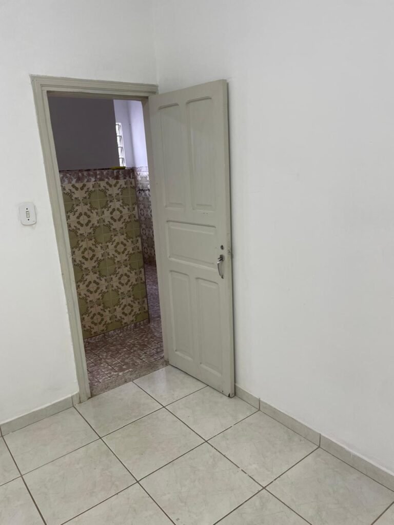 CÔMODO ABERTO-: 01 porta social com esquadrias de ferro com pintura na cor branco nove em ordem, com 11 vidros canelados com manchas de tinta e restante em ordem, com maçaneta em inox em ordem, com fechadura marca aliança em ordem, piso e rodapés revestidos de frio cerâmico em ordem, paredes com pintura na cor branco neve em ordem, 01 spot sem lâmpada 01, ralo grelha em ordem, telhado com telhas de cimento em ordem e com algumas telhas translúcidas.