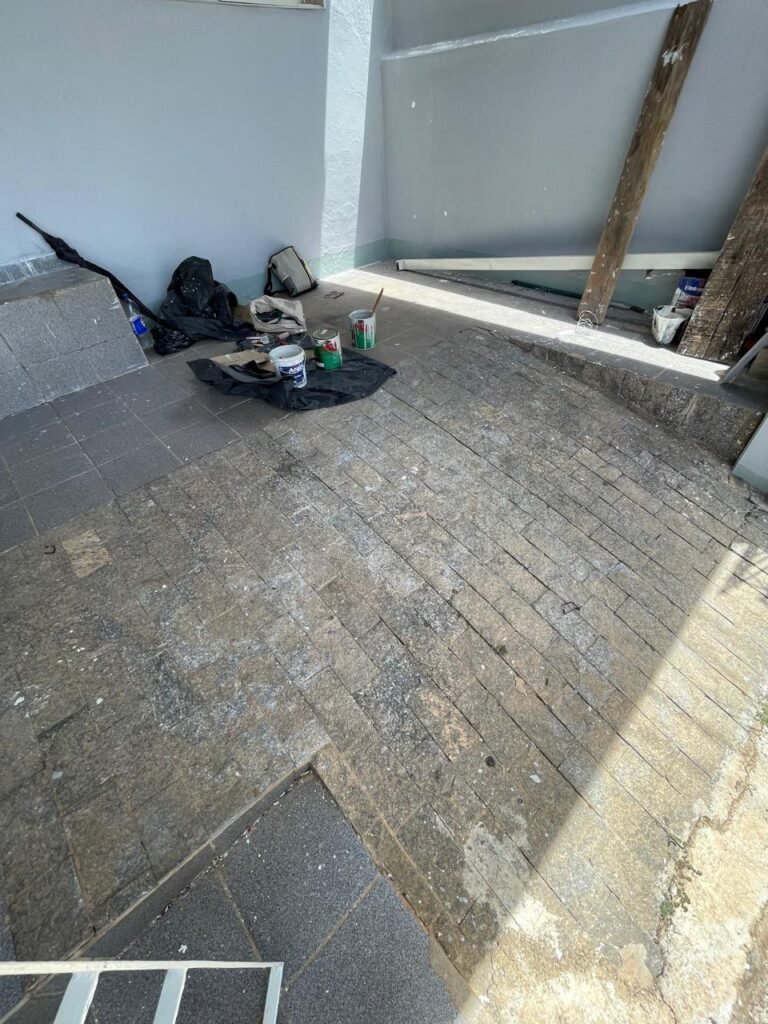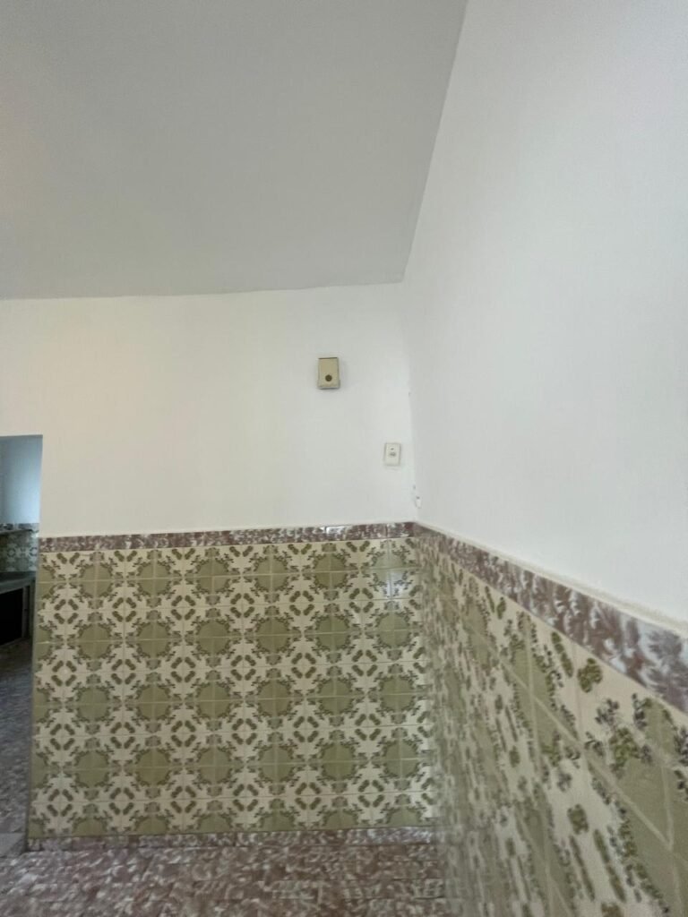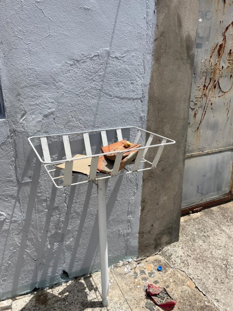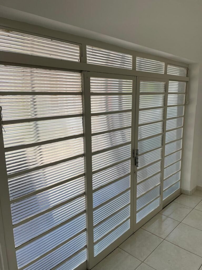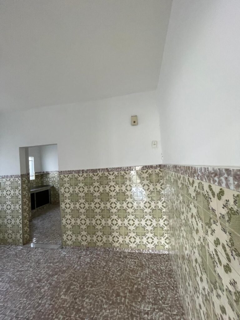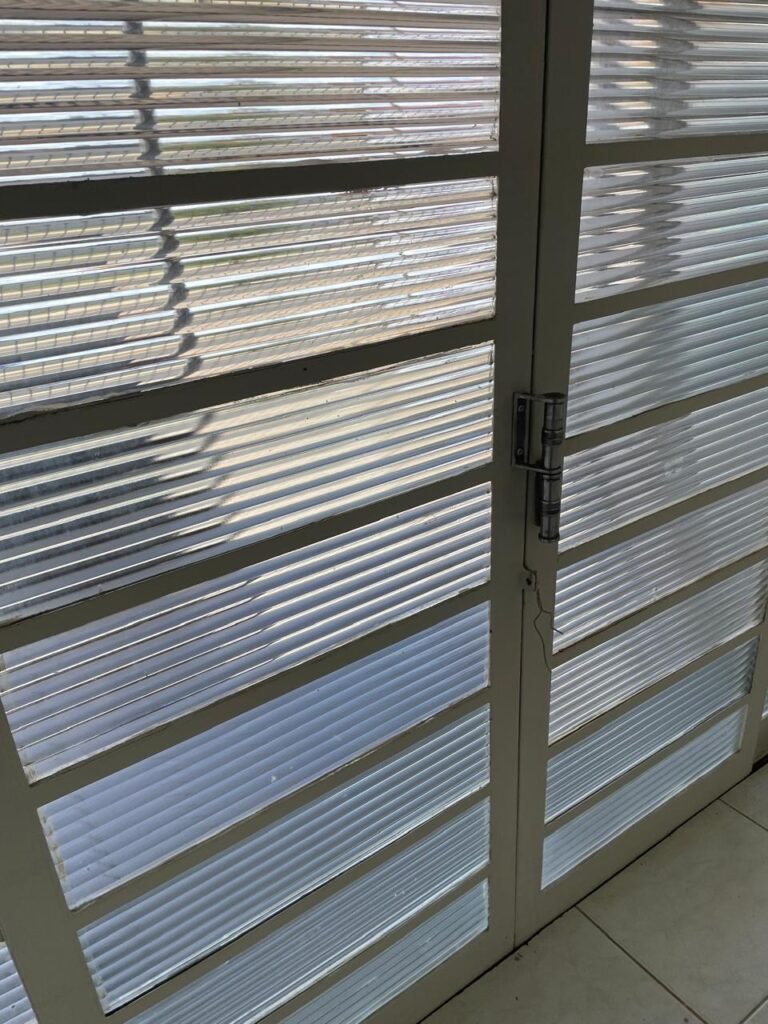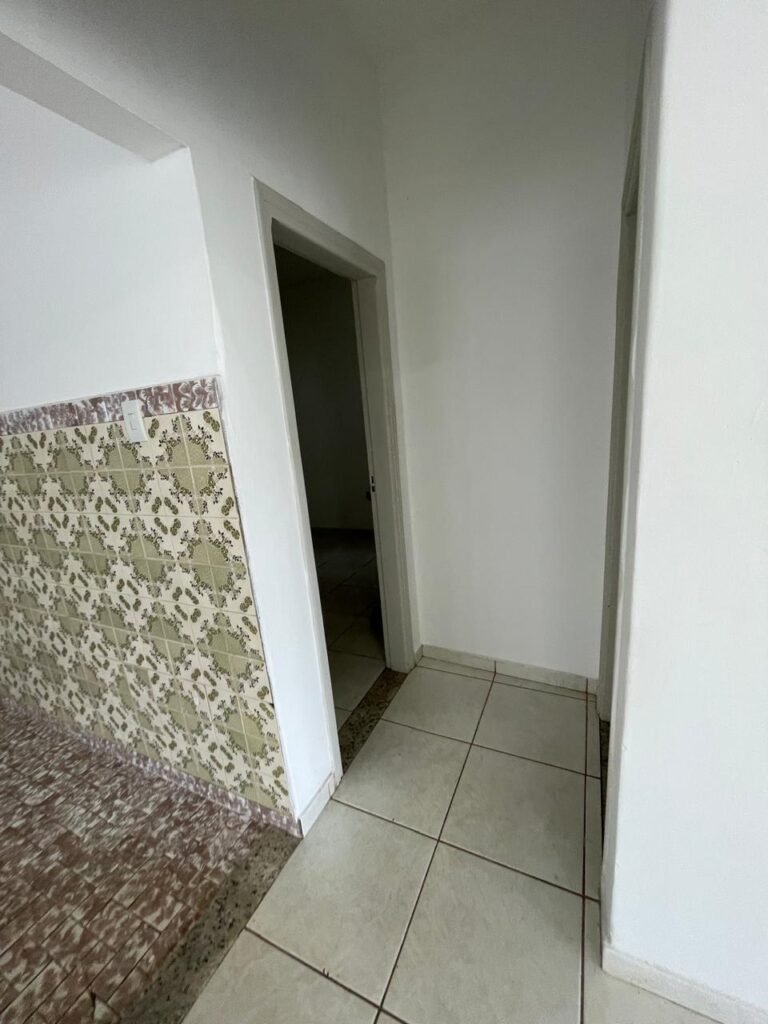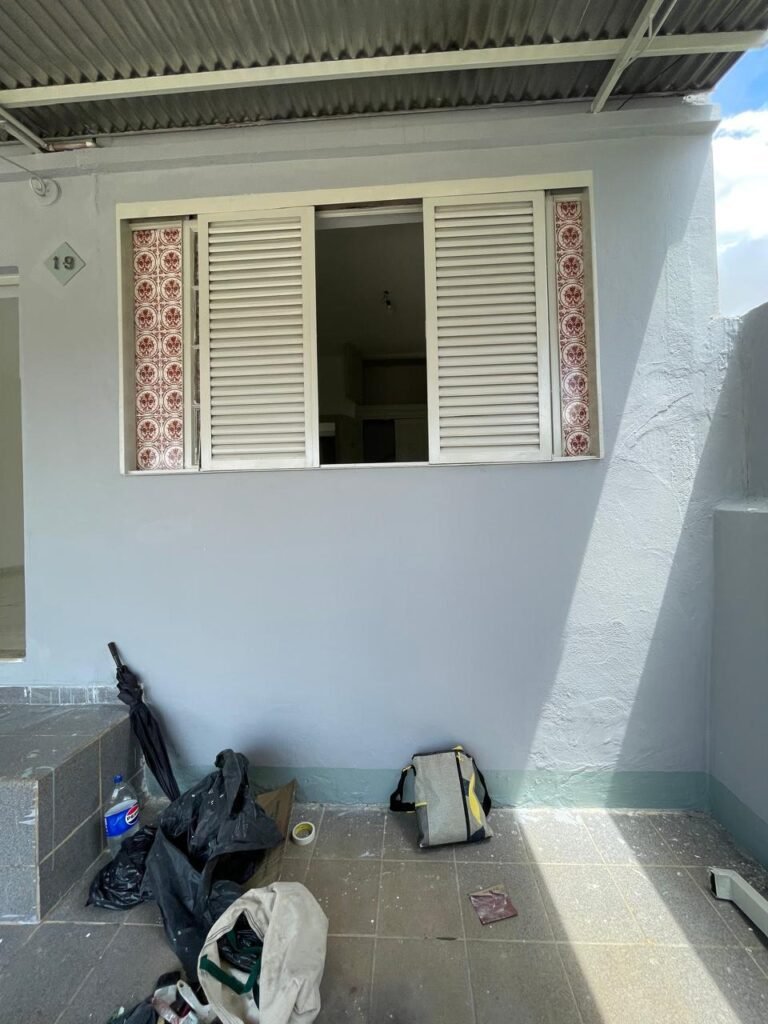 CÔMODO ABERTO-: 01 porta social com esquadrias de ferro com pintura na cor branco nove em ordem, com 11 vidros canelados com manchas de tinta e restante em ordem, com maçaneta em inox em ordem, com fechadura marca aliança em ordem, piso e rodapés revestidos de frio cerâmico em ordem, paredes com pintura na cor branco neve em ordem, 01 spot sem lâmpada 01, ralo grelha em ordem, telhado com telhas de cimento em ordem e com algumas telhas translúcidas.