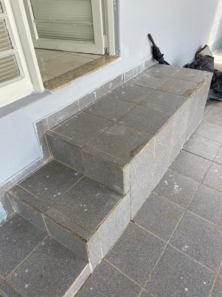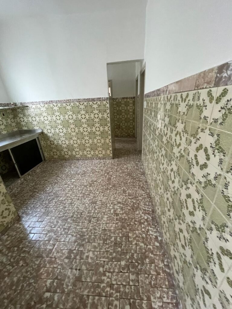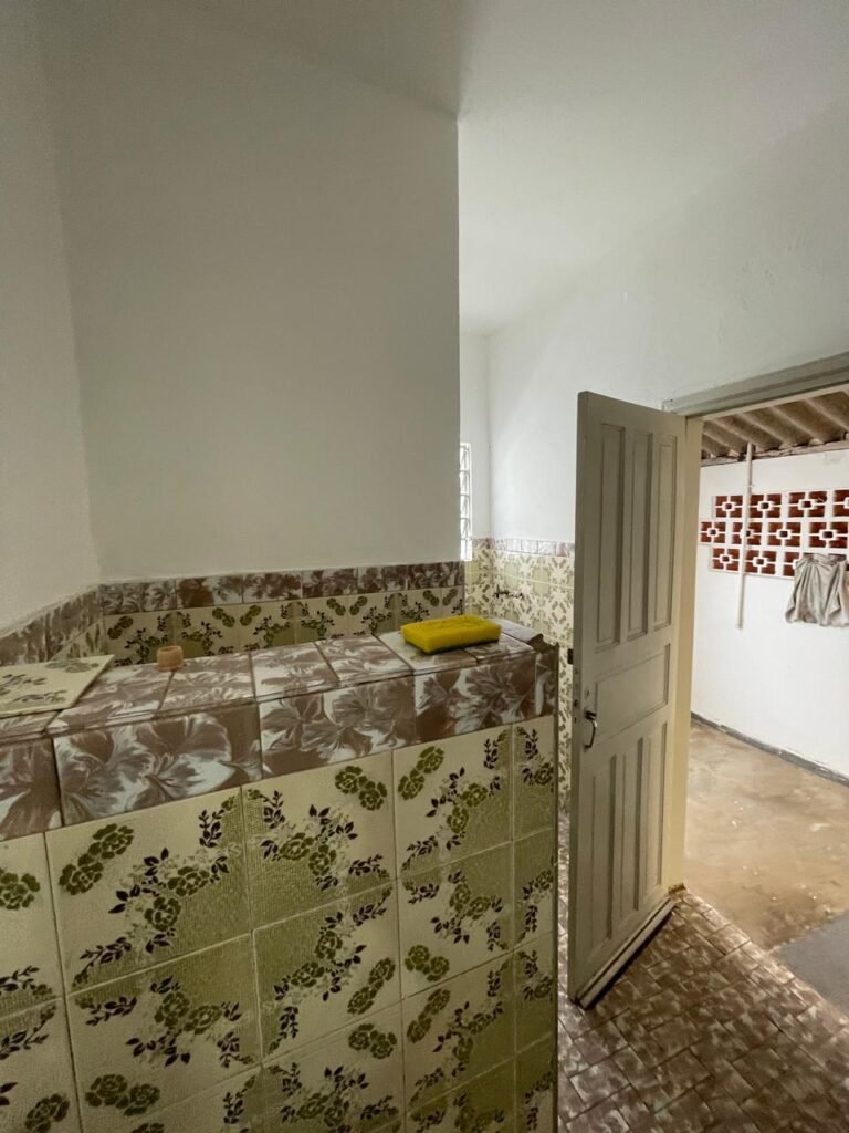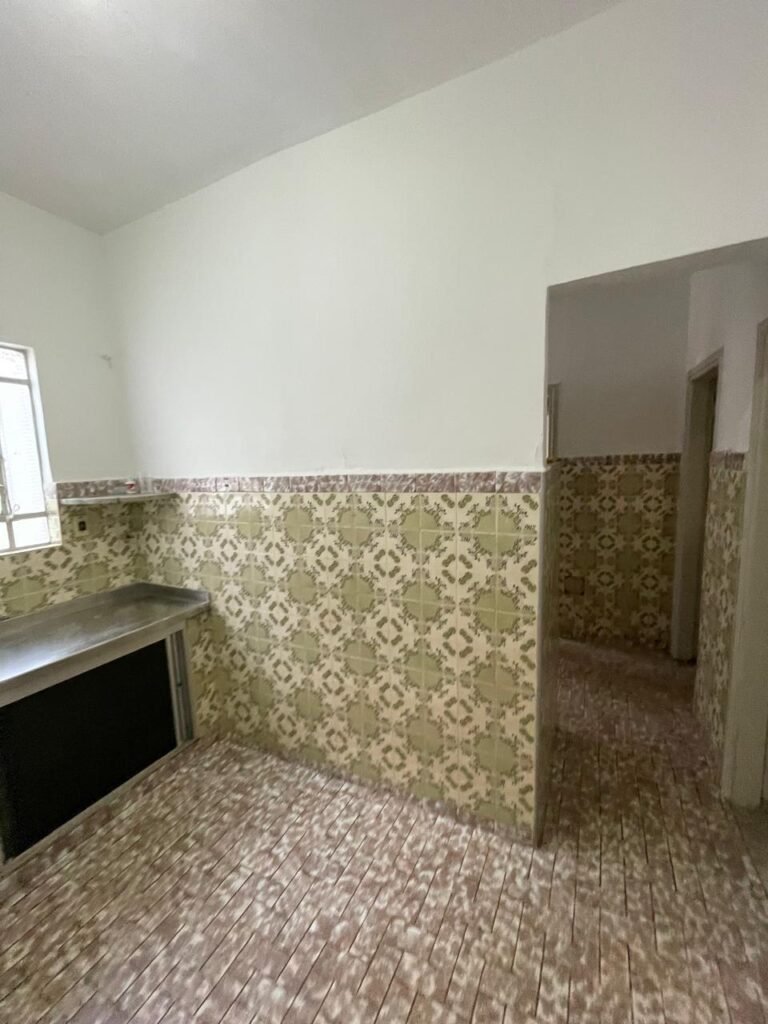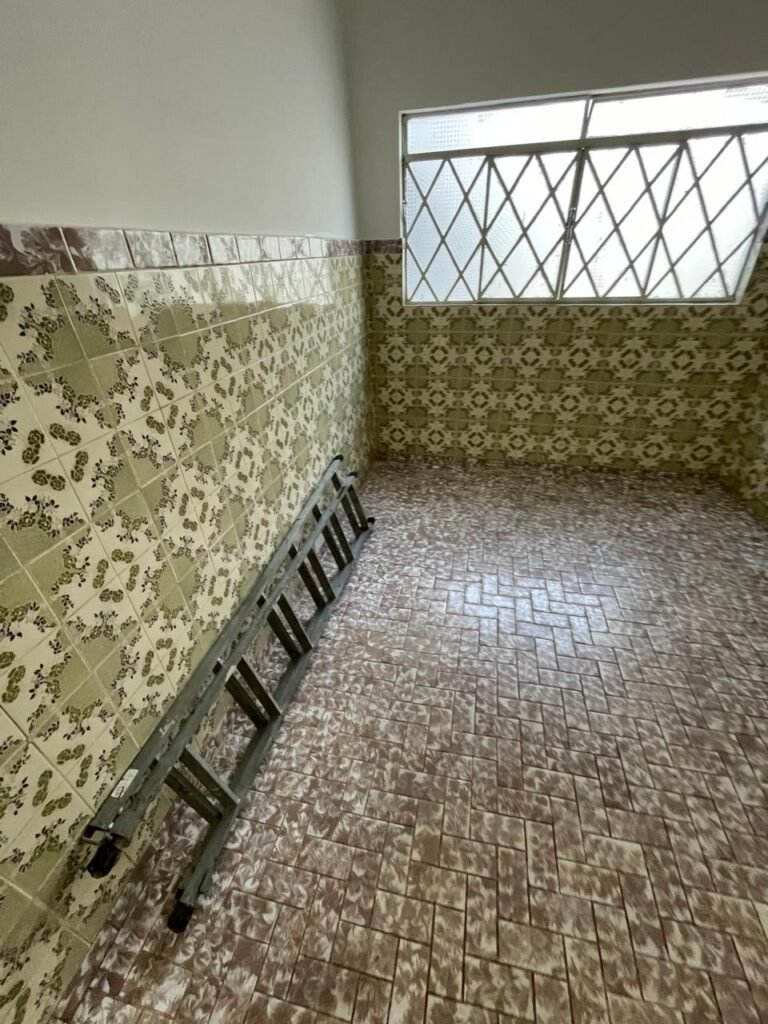 FUNDOS-: piso e rodapés revestidos de frio cerâmico com desgaste natural, manchas de tinta, trincos por extensão e restante em ordem, parte de concreto desempenado, 01 ralo de plástico na cor branco em ordem, 01 tampa de inspeção de ferro em ordem 01 ralo de ferro grelha em ordem, paredes com pintura na cor branco neve nove em ordem, 03 blocos aparente em ordem sendo que 01 deles está trincado ao meio, zero duas lâmpadas não testadas, 01 espelho com 01 tomada, 01 espelho circular com 01 interruptor, 01 armário de alvenaria, com 02 portas de madeira com pintura na cor branco com desgaste natural e restante em ordem.