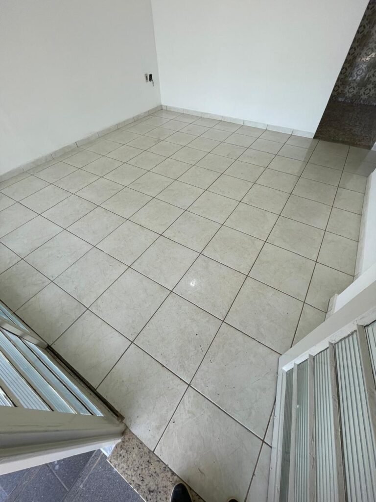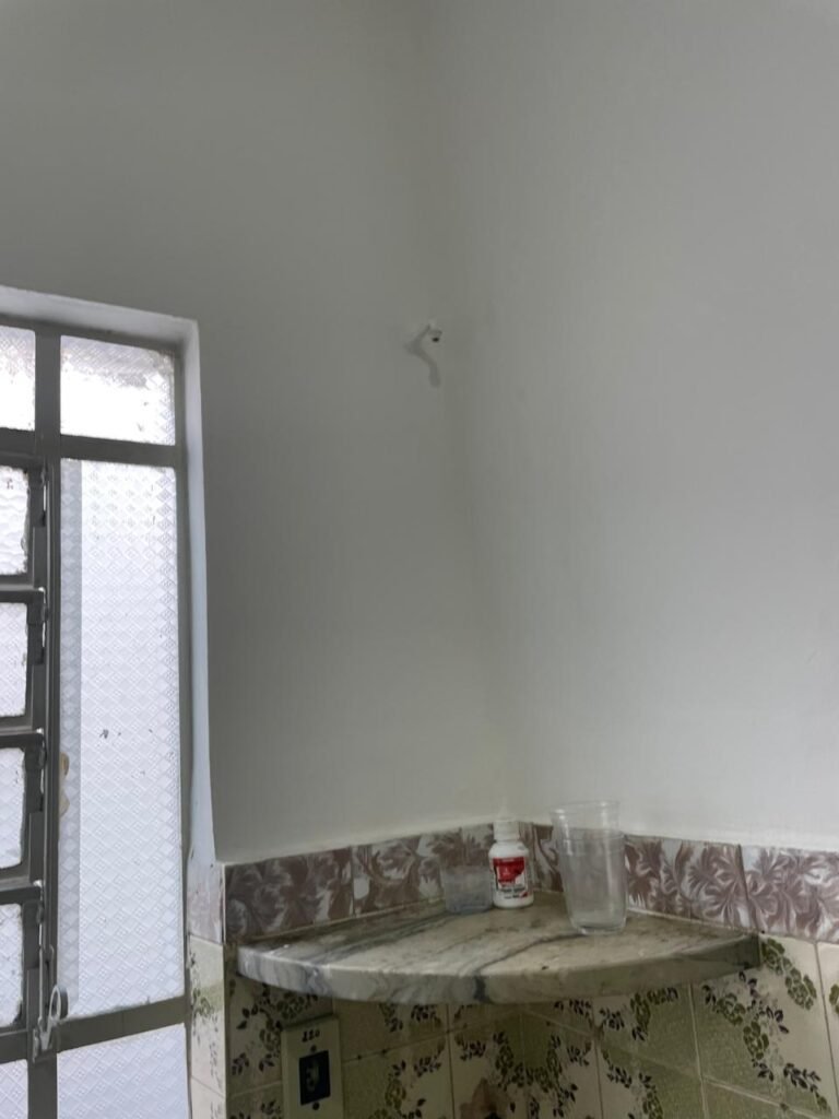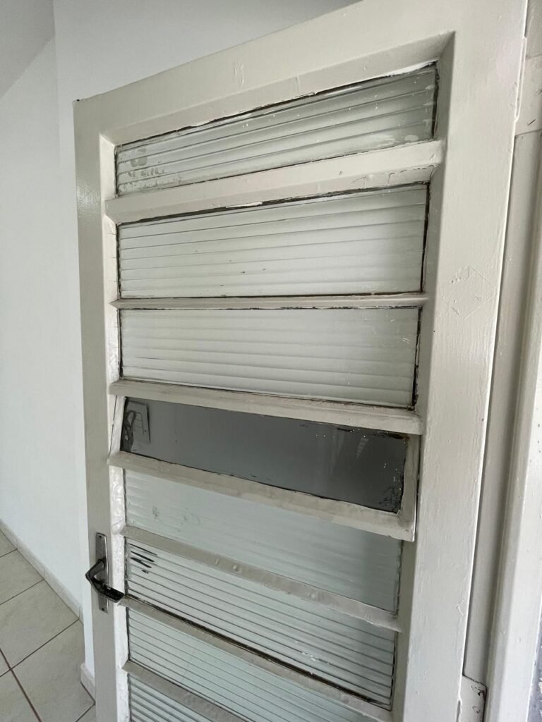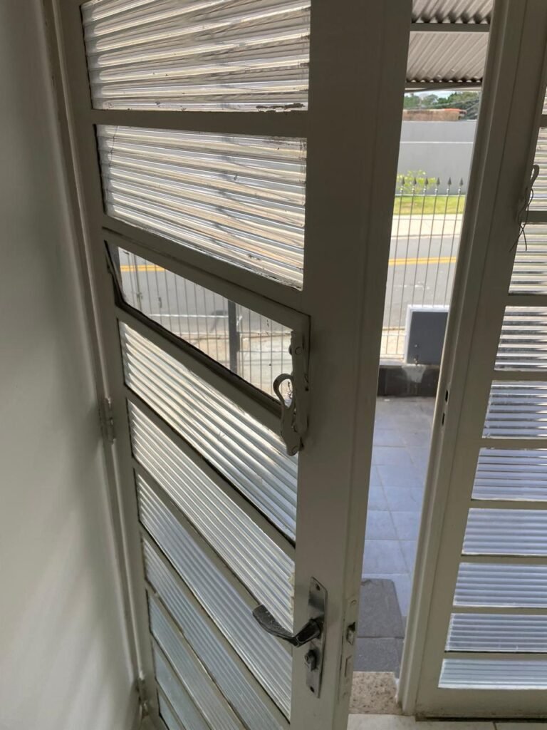 SALA-: 01 porta social de ferro com pintura na cor branco nova em ordem, com maçaneta em inox em ordem, fechadura marca Papaia em ordem e com chaves, 11 vidros sendo eles, 10 canelados e 01 liso, 01 vitrô com maçaneta em ordem, com manchas de tinta e restante em ordem, 01 porta de ferro deslizante com 40 vidros canelados com manchas de tinta e restante em ordem, com 02 fechaduras dos vitrôs, com trinco para cadeado em ordem e com fechadura em ordem, piso e rodapés revestidos de frio cerâmico na cor branco com desgaste natural e restante em ordem, 02 espelhos de luz em ordem, sendo eles, 01 espelho com 01 tomada e 01 espelho com 06 interruptores em ordem. 01 pré-instalação de espelho de luz com a fiação aparente, 01 bocal com 02 lâmpadas led, sendo que apenas 01 delas está em ordem, paredes e teto com pintura na cor branco neve nova e em ordem.
