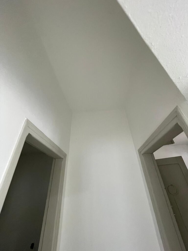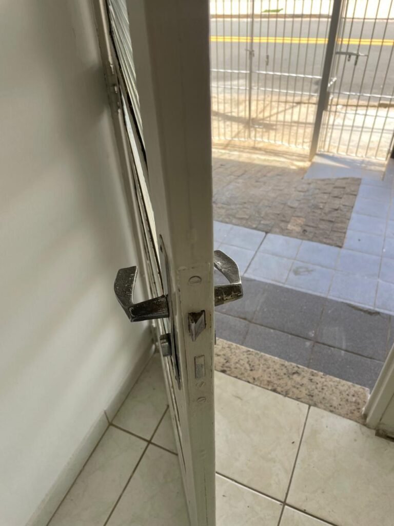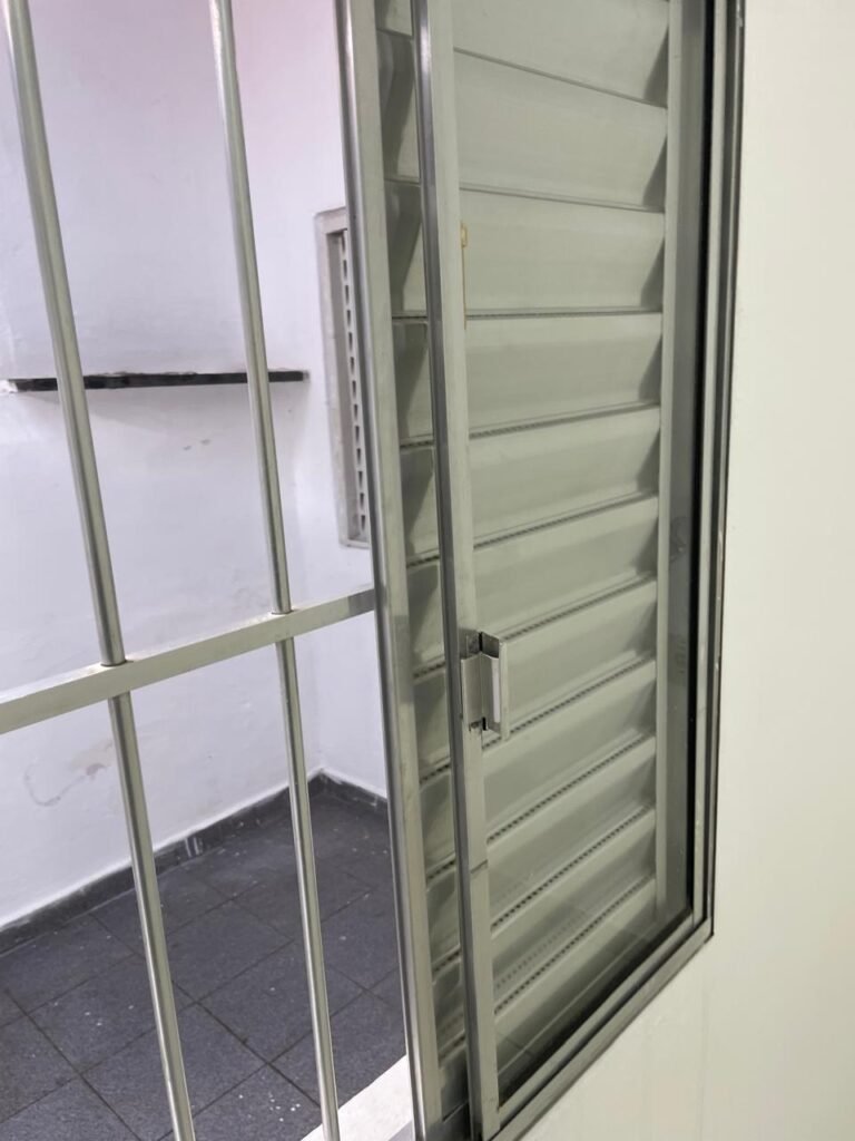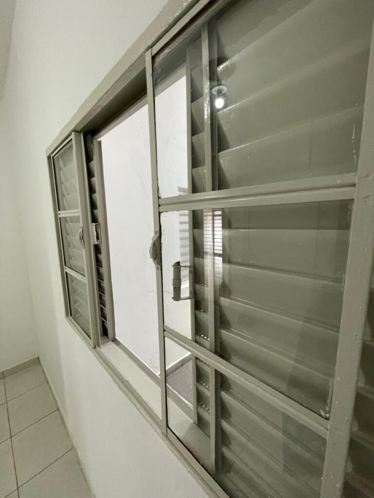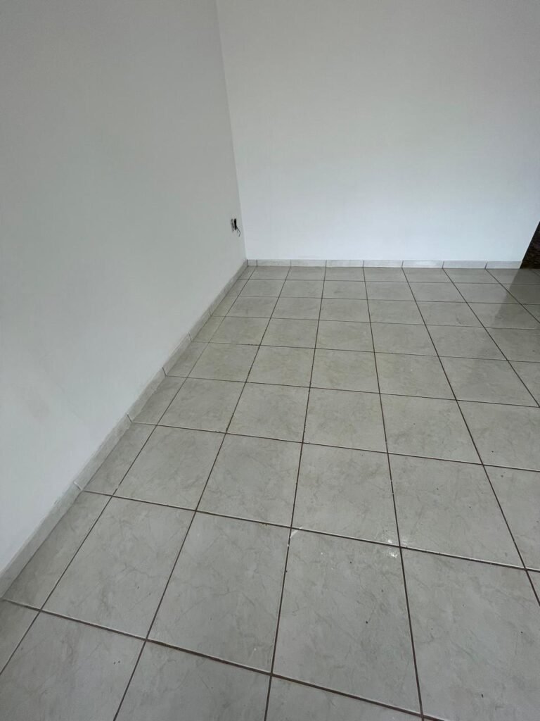 SALA-: 01 porta social de ferro com pintura na cor branco nova em ordem, com maçaneta em inox em ordem, fechadura marca Papaia em ordem e com chaves, 11 vidros sendo eles, 10 canelados e 01 liso, 01 vitrô com maçaneta em ordem, com manchas de tinta e restante em ordem, 01 porta de ferro deslizante com 40 vidros canelados com manchas de tinta e restante em ordem, com 02 fechaduras dos vitrôs, com trinco para cadeado em ordem e com fechadura em ordem, piso e rodapés revestidos de frio cerâmico na cor branco com desgaste natural e restante em ordem, 02 espelhos de luz em ordem, sendo eles, 01 espelho com 01 tomada e 01 espelho com 06 interruptores em ordem. 01 pré-instalação de espelho de luz com a fiação aparente, 01 bocal com 02 lâmpadas led, sendo que apenas 01 delas está em ordem, paredes e teto com pintura na cor branco neve nova e em ordem.