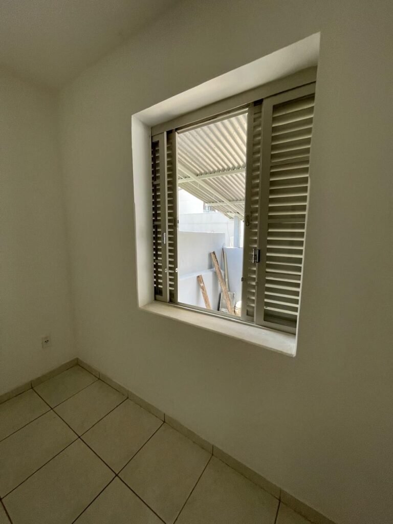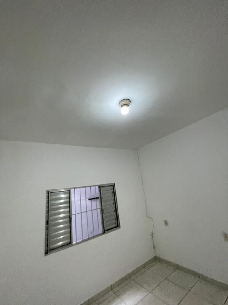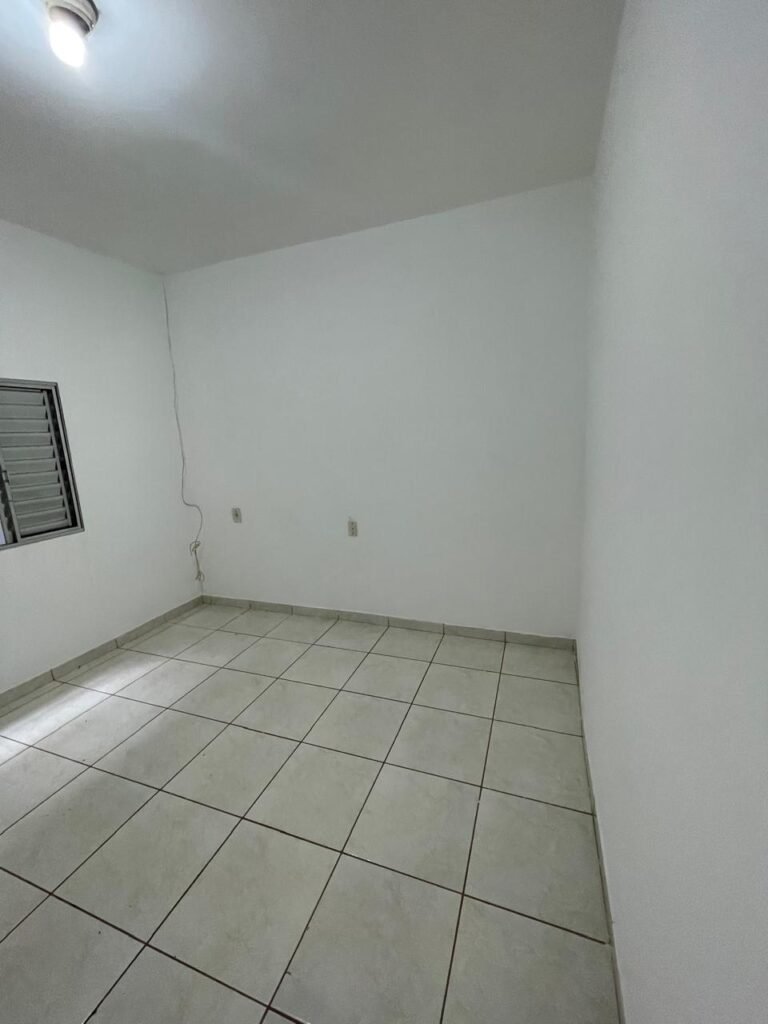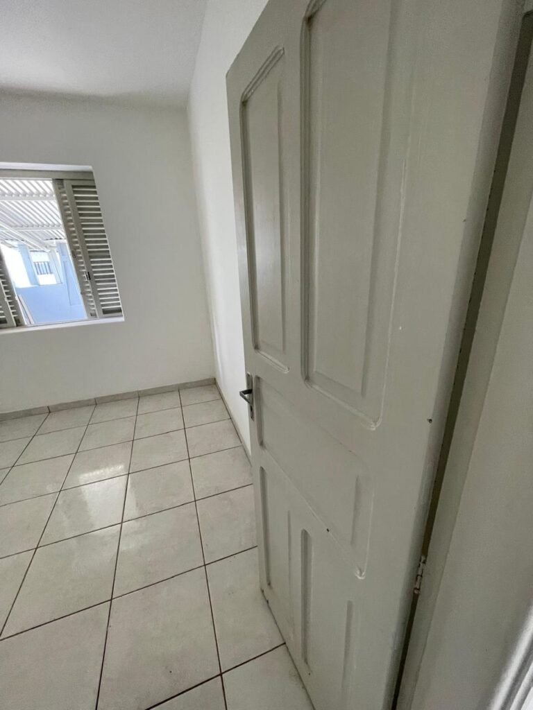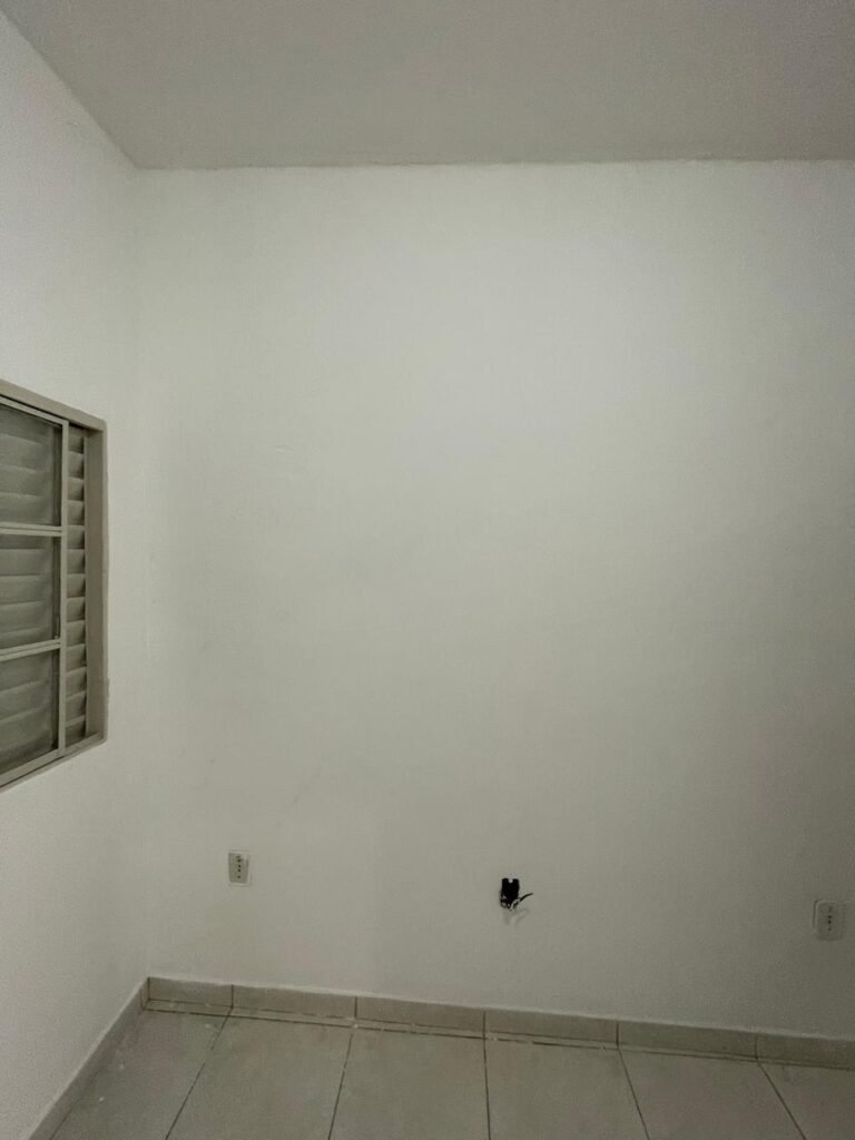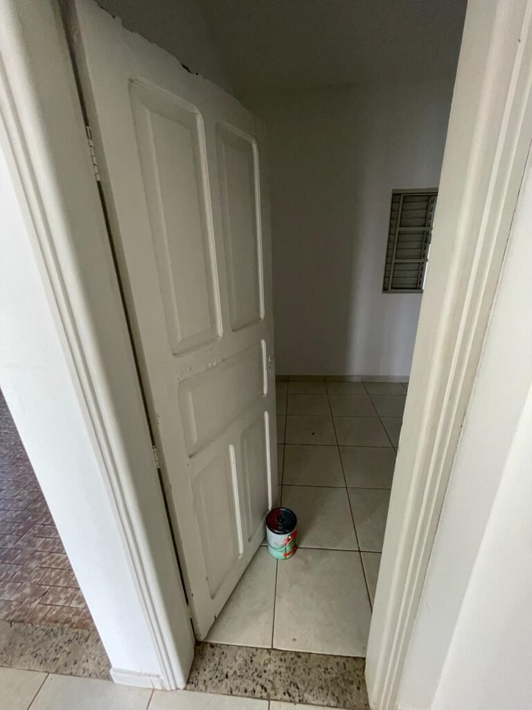 QUARTO 03-:01 porta social de madeira com pintura na cor branco com desgastes naturais e restante em ordem, puxador e maçaneta embutida em apenas 01 lado, com 01 trinco marca Aliança, piso e rodapés revestidos de frio cerâmico na cor branco com desgaste natural, manchas de tinta e trincados pela extensão, paredes com pintura na cor branco neve nova e em ordem, 01 janela deslizante com 02 folhas venezianas e com 01 fechadura em ordem, 02 folhas com 02 vidros lisos com manchas de tinta, com 02 fechadurasem inox em ordem e com 02 trincos para cadeado em ordem, grade de proteção em ordem. Paredes com pintura nova na cor branco neve em ordem, 01 guarda-roupa de madeira com pintura na cor branco, com desgastes naturais, porta com puxador e maçaneta embutida, guarda-roupa com 04 portas deslizantes, dois puxadores de inox em ordem, são dois espelhos com tomada e uma fiação aparente, janela com seis vidros e 02 fechaduras, teto com pintura nova na cor branco neve em ordem, 01 lâmpada em ordem.