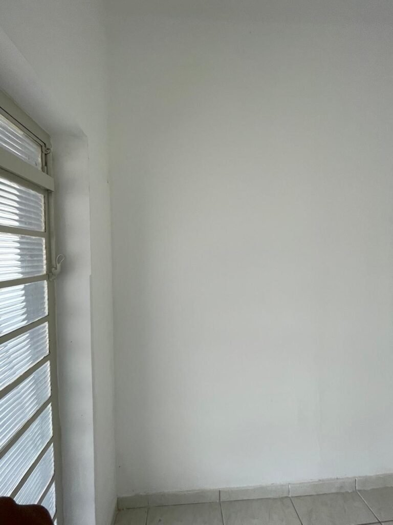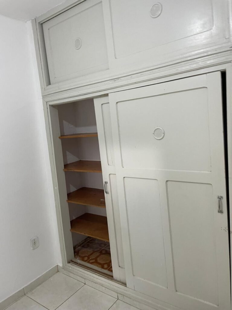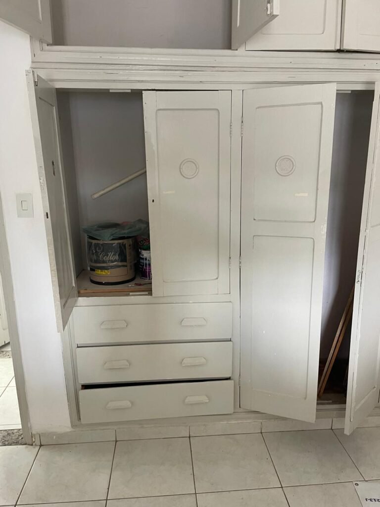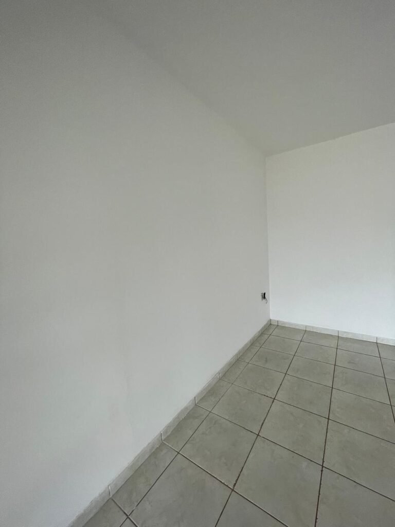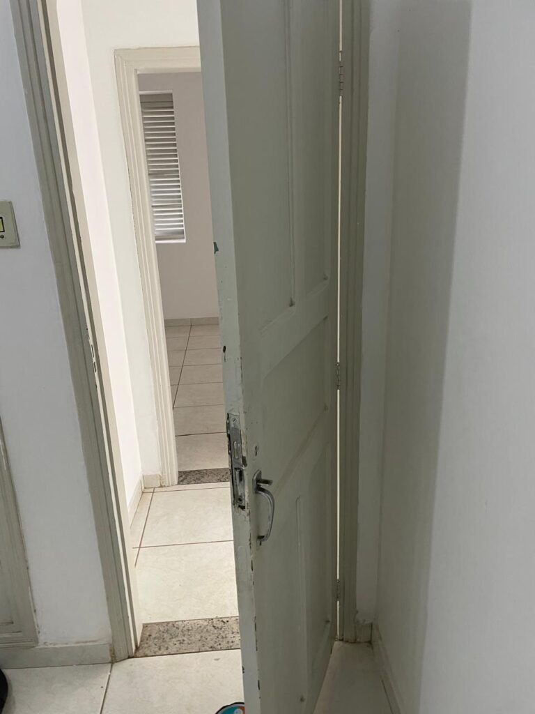 QUARTO 03-:01 porta social de madeira com pintura na cor branco com desgastes naturais e restante em ordem, puxador e maçaneta embutida em apenas 01 lado, com 01 trinco marca Aliança, piso e rodapés revestidos de frio cerâmico na cor branco com desgaste natural, manchas de tinta e trincados pela extensão, paredes com pintura na cor branco neve nova e em ordem, 01 janela deslizante com 02 folhas venezianas e com 01 fechadura em ordem, 02 folhas com 02 vidros lisos com manchas de tinta, com 02 fechadurasem inox em ordem e com 02 trincos para cadeado em ordem, grade de proteção em ordem. Paredes com pintura nova na cor branco neve em ordem, 01 guarda-roupa de madeira com pintura na cor branco, com desgastes naturais, porta com puxador e maçaneta embutida, guarda-roupa com 04 portas deslizantes, dois puxadores de inox em ordem, são dois espelhos com tomada e uma fiação aparente, janela com seis vidros e 02 fechaduras, teto com pintura nova na cor branco neve em ordem, 01 lâmpada em ordem.