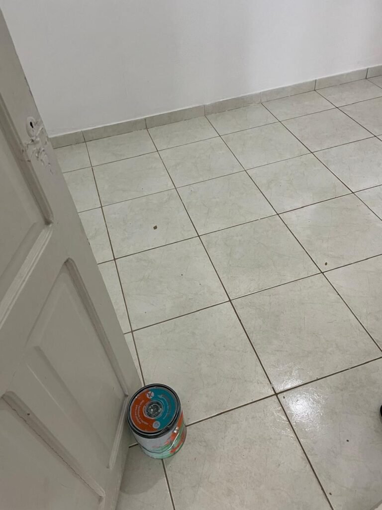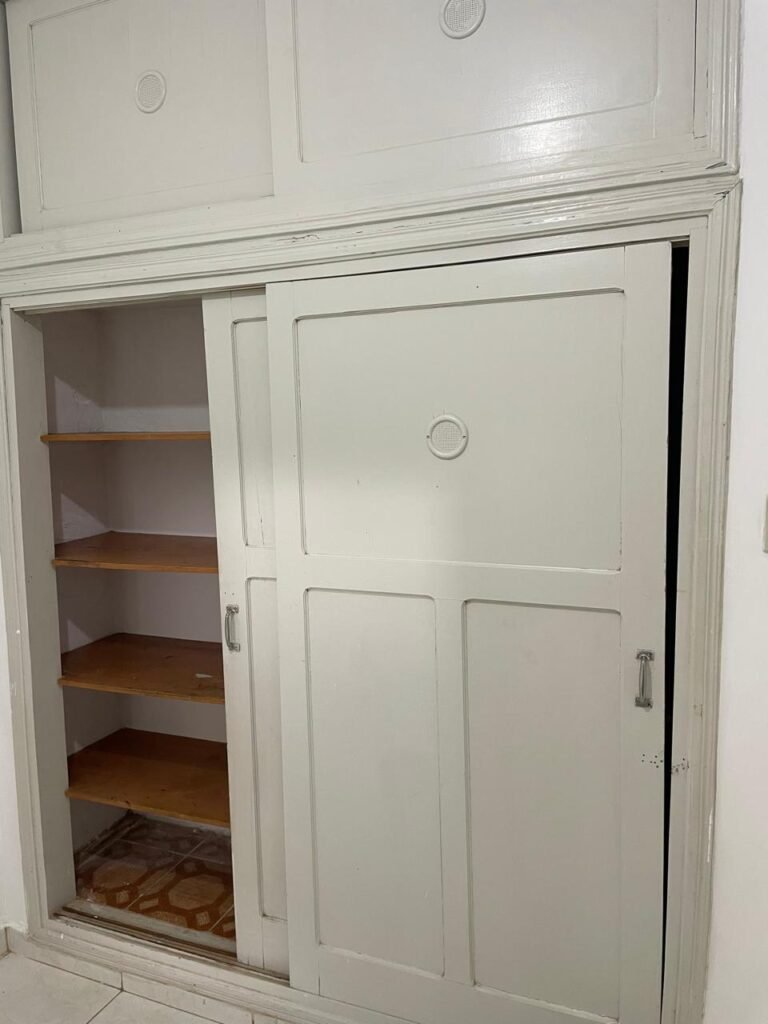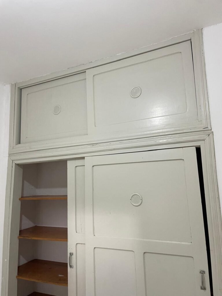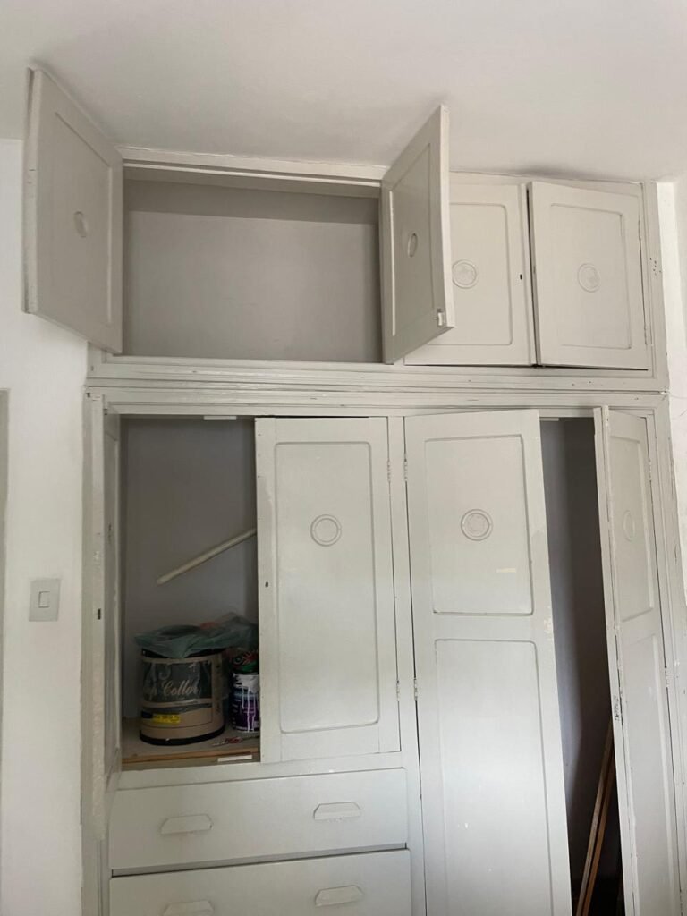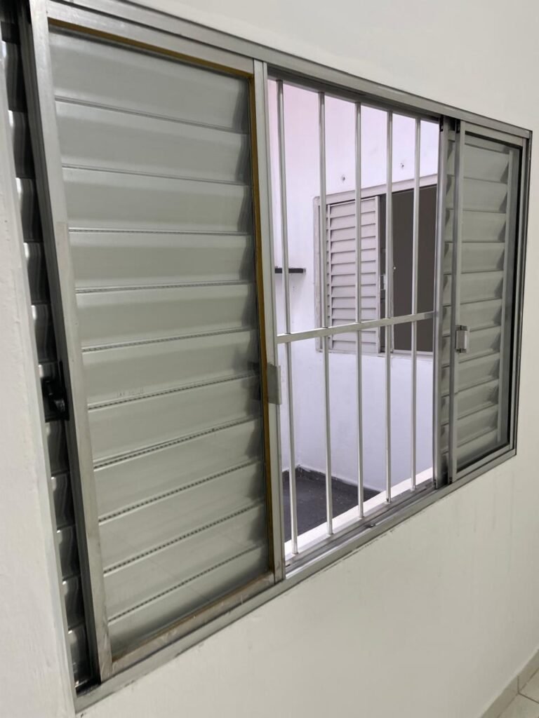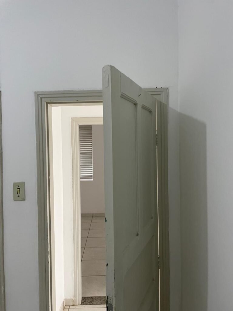 QUARTO 03-:01 porta social de madeira com pintura na cor branco com desgastes naturais e restante em ordem, puxador e maçaneta embutida em apenas 01 lado, com 01 trinco marca Aliança, piso e rodapés revestidos de frio cerâmico na cor branco com desgaste natural, manchas de tinta e trincados pela extensão, paredes com pintura na cor branco neve nova e em ordem, 01 janela deslizante com 02 folhas venezianas e com 01 fechadura em ordem, 02 folhas com 02 vidros lisos com manchas de tinta, com 02 fechadurasem inox em ordem e com 02 trincos para cadeado em ordem, grade de proteção em ordem. Paredes com pintura nova na cor branco neve em ordem, 01 guarda-roupa de madeira com pintura na cor branco, com desgastes naturais, porta com puxador e maçaneta embutida, guarda-roupa com 04 portas deslizantes, dois puxadores de inox em ordem, são dois espelhos com tomada e uma fiação aparente, janela com seis vidros e 02 fechaduras, teto com pintura nova na cor branco neve em ordem, 01 lâmpada em ordem.