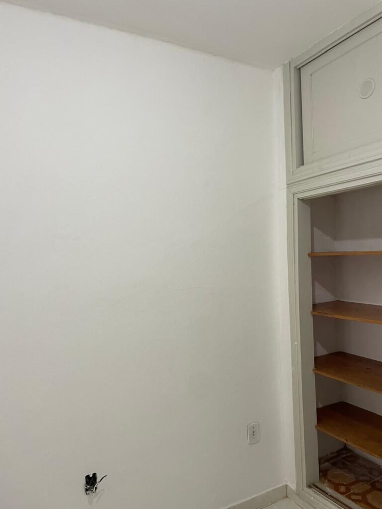 QUARTO 01-: 01 porta social de madeira com pintura na cor branco com desgaste natural e restante em ordem, maçaneta e fechadura em inox com desgastes naturais, parte danificada e restante em ordem, com 01 trinco marca Aliança em ordem, piso e rodapés revestidos de frio cerâmico na cor branco com desgaste natural, manchas de tinta e trincados pela extensão, paredes com pintura na cor branco neve nova e em ordem, 04 espelhos de luz sendo eles, 01 espelho com 01 interruptor, 03 espelhos com 01 tomada. 01 janela deslizante com 02 folhas venezianas e com 01 fechadura em ordem, 02 folhas com 04 vidros lisos com manchas de tinta, com 01 fechadura em inox em ordem e com 02 trincos para cadeado em ordem. Paredes com pintura nova na cor branco neve em ordem, 01 guarda-roupa de madeira com pintura na cor branco, com desgastes naturais, com 08 portas, com 02 trincos em ordem, com 03 gavetas em ordem e com 06 puxadores em ordem, teto com pintura nova na cor branco neve em ordem, 01 lâmpada com fiação aparente e Led danificado.