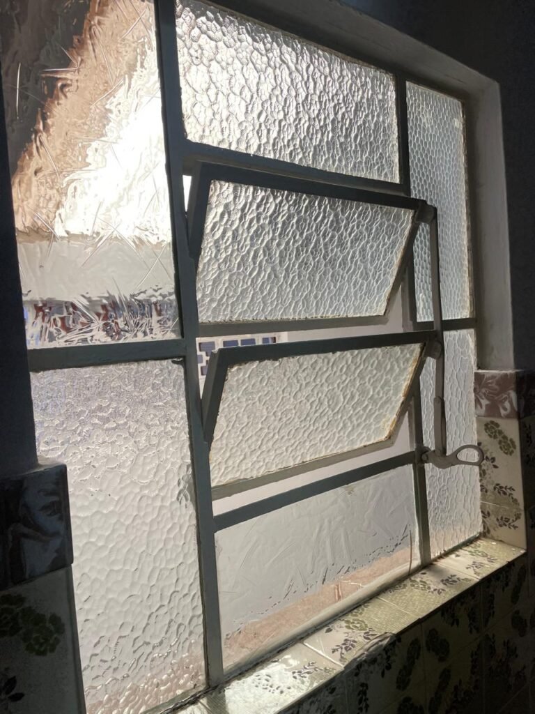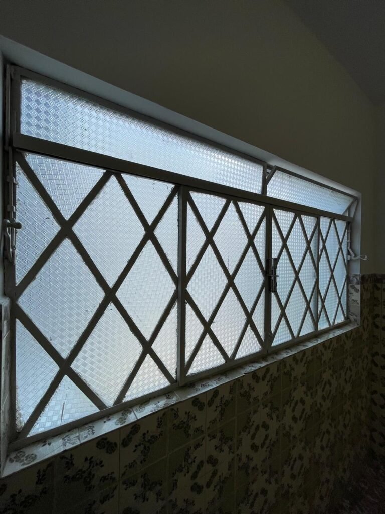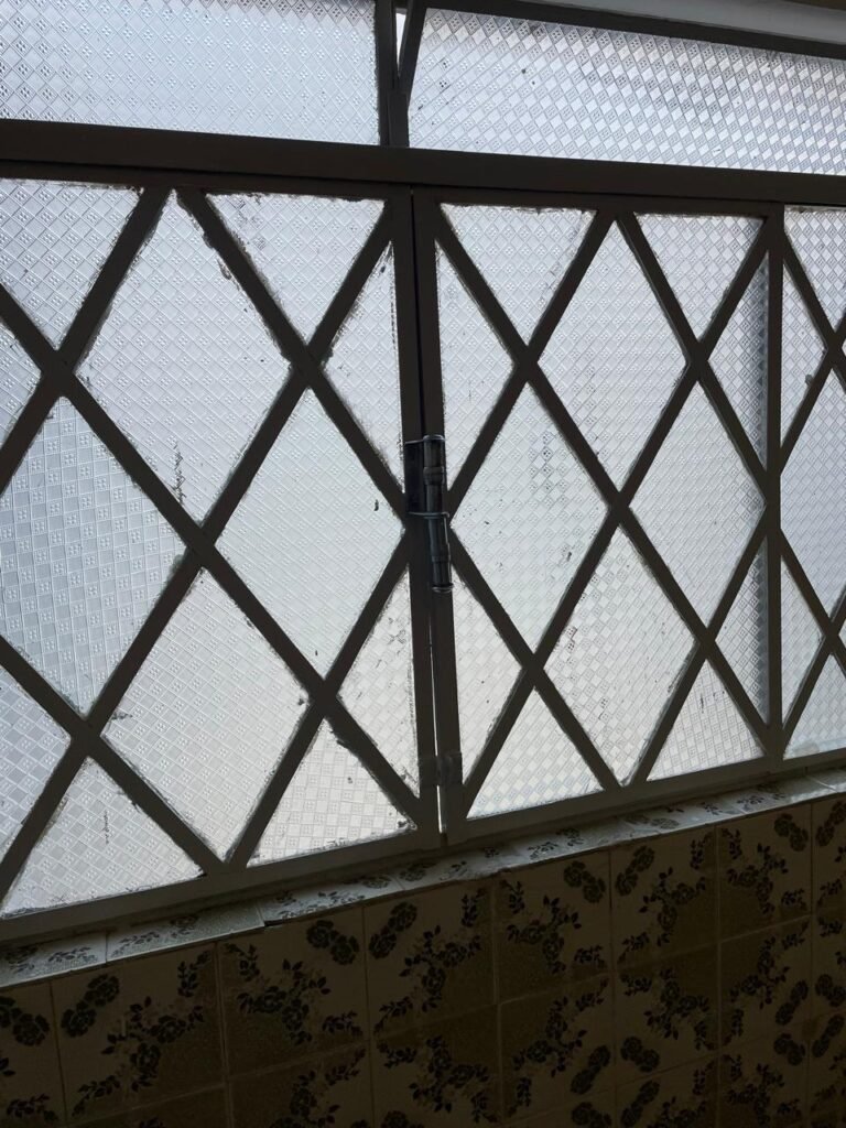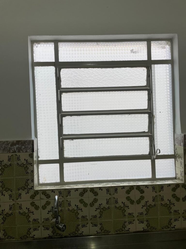 SALA DE JANTAR-: Pisos e rodapés revestidos de frio cerâmico com desenhos e com desgastes naturais e trincados pela extensão, paredes 1/2 revestidas de piso frio cerâmico com desenhos na cor verde, desgaste natural e trincados pela extensão, restante paredes e teto com pintura na cor branco neve nova em ordem, 03 espelhos de luz sendo eles, 01 espelho com 01 interruptor, 01 espelho com 01 interruptor e 01 tomada, 01 espelho com 01 tomada, 01 para fio de dados, 01 interruptor de campainha em ordem, 01 lâmpada com Led em ordem, 01 janela deslizante com 02 vidros basculantes, com esquadrias de ferro com pintura na cor branco nova em ordem, com 04 folhas com 12 vidros personalizados com manchas de tinta e restante em ordem, com 02 vidros personalizados dos litros em ordem, com 02 fechaduras emperradas, 01 fechadura em inox enroscando.