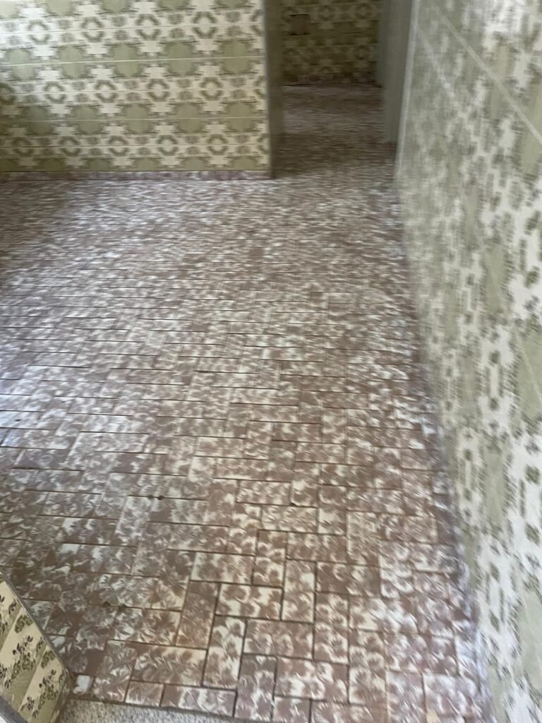 HALL LAVANDERIA-: Pisos e rodapés revestidos de frio cerâmico com desenhos e com desgastes naturais e trincados pela extensão, paredes 1/2 revestidas de piso frio cerâmico com desenhos na cor verde, desgaste natural e trincados pela extensão, restante paredes e teto com pintura na cor branco neve nova em ordem, lâmpada ordem, 01 tanque de alvenaria com desgaste natural restante em ordem, com 04 torneiras de jardim em ordem, 02 espelhos com 01 tomada cada, 01 vitrô basculante com 05 vidros detalhados com manchas de tinta e desgaste natural 01 fechadura em ordem.