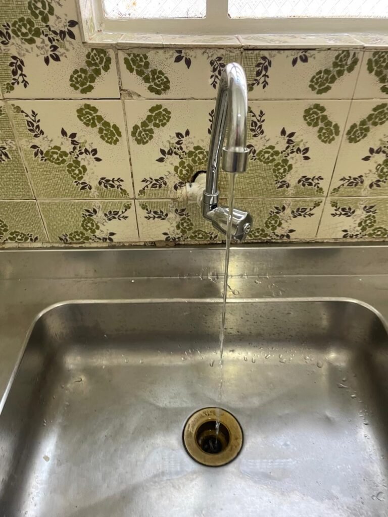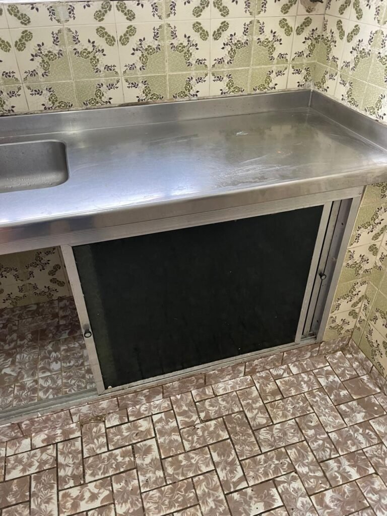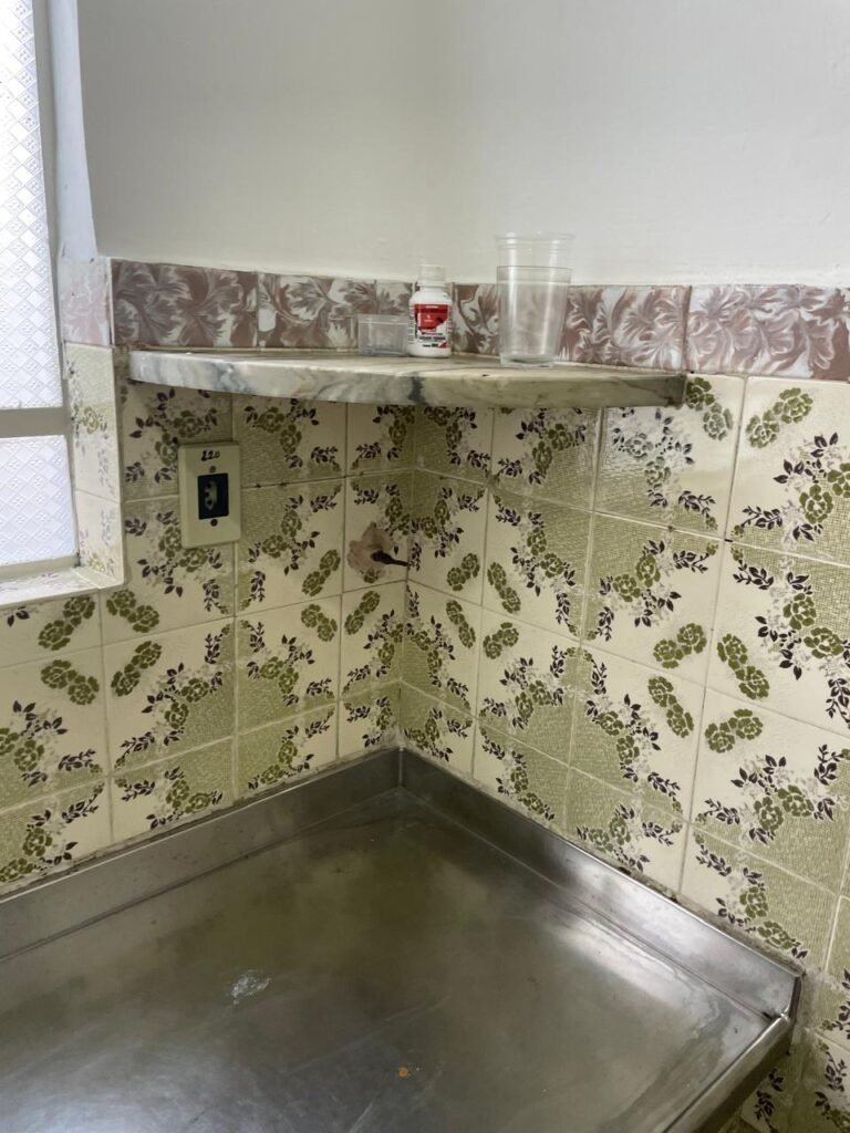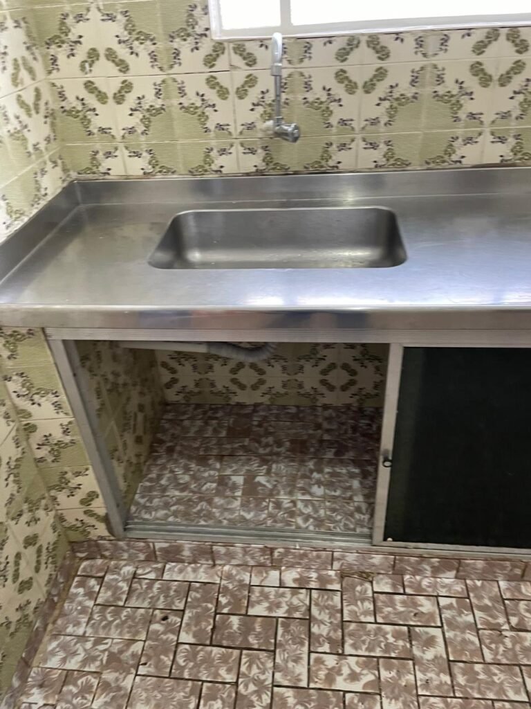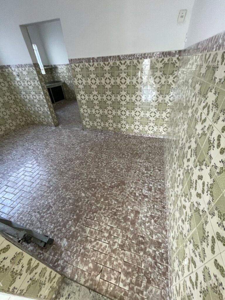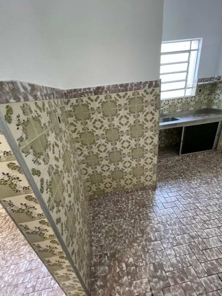 COZINHA-: Pisos e rodapés revestidos de frio cerâmico com desenhos e com desgastes naturais e trincados pela extensão, paredes 1/2 revestidas de piso frio cerâmico com desenhos na cor verde, desgaste natural e trincados pela extensão, restante paredes e teto com pintura na cor branco neve nova em ordem, 03 espelhos de luz, sendo 01 espelho com 03 interruptores e 02 espelhos com 01 tomada (110-220), pia em inox com desgaste natural e restante em ordem, 01 gabinete com 02 portas deslizantes com esquadrias em inox em ordem e 02 folhas de acrílico, sendo que 01 delas trincados, com desgaste natural e restante em ordem, 02 puxadores em ordem, 01 tampa de ferro de inspeção, 01 sifão sanfonada com pingo no rejunte e restante em ordem, 01 torneira em inox em ordem, 01 canopla de Registro em ordem, 01 vitrô basculante, com esquadrias de ferro com pintura na cor branco nova em ordem, 12 vidros personalizados com manchas de tinta e restante em ordem, 01 fechadura em ordem, lâmpada com Led em ordem, 01 pedra de granito com desgaste natural e restante em ordem.