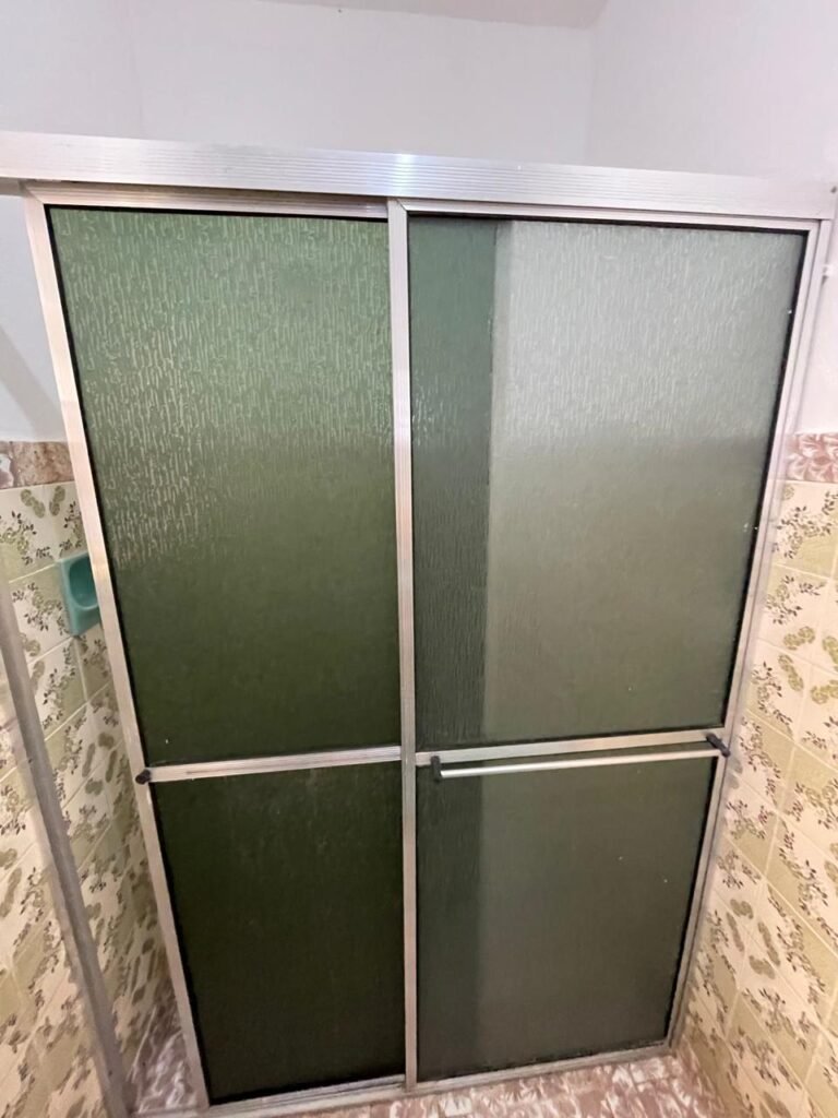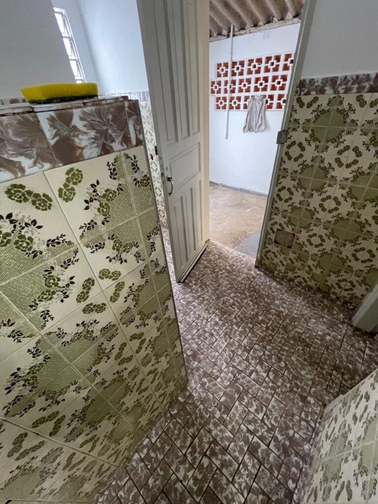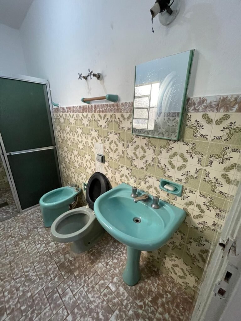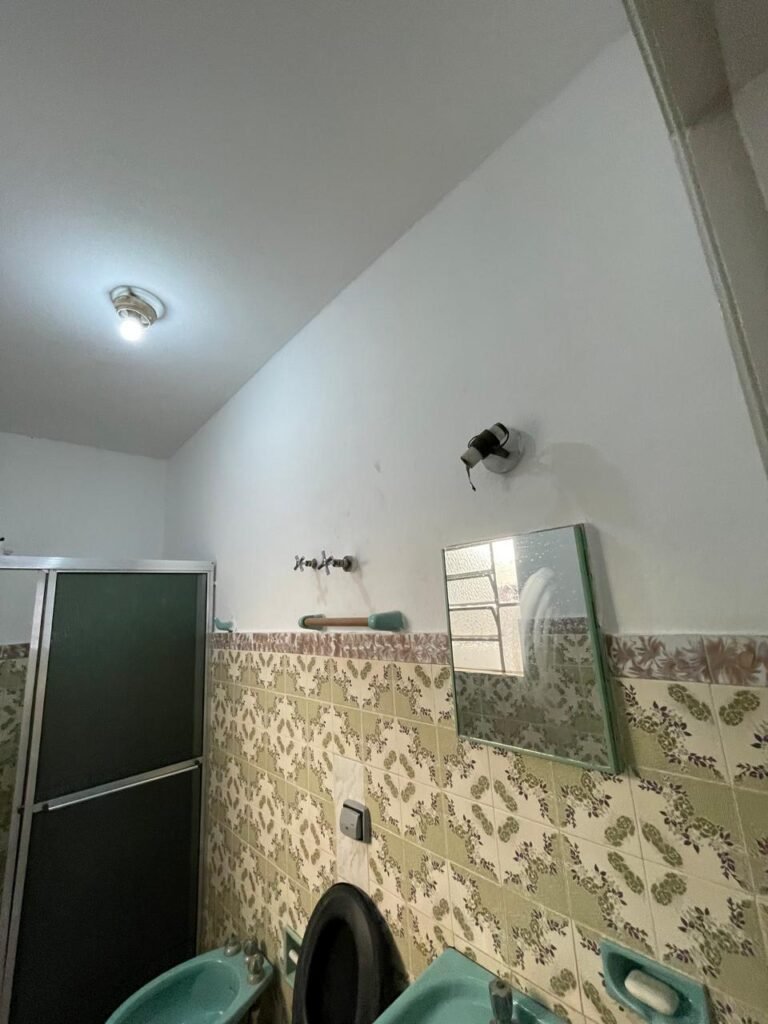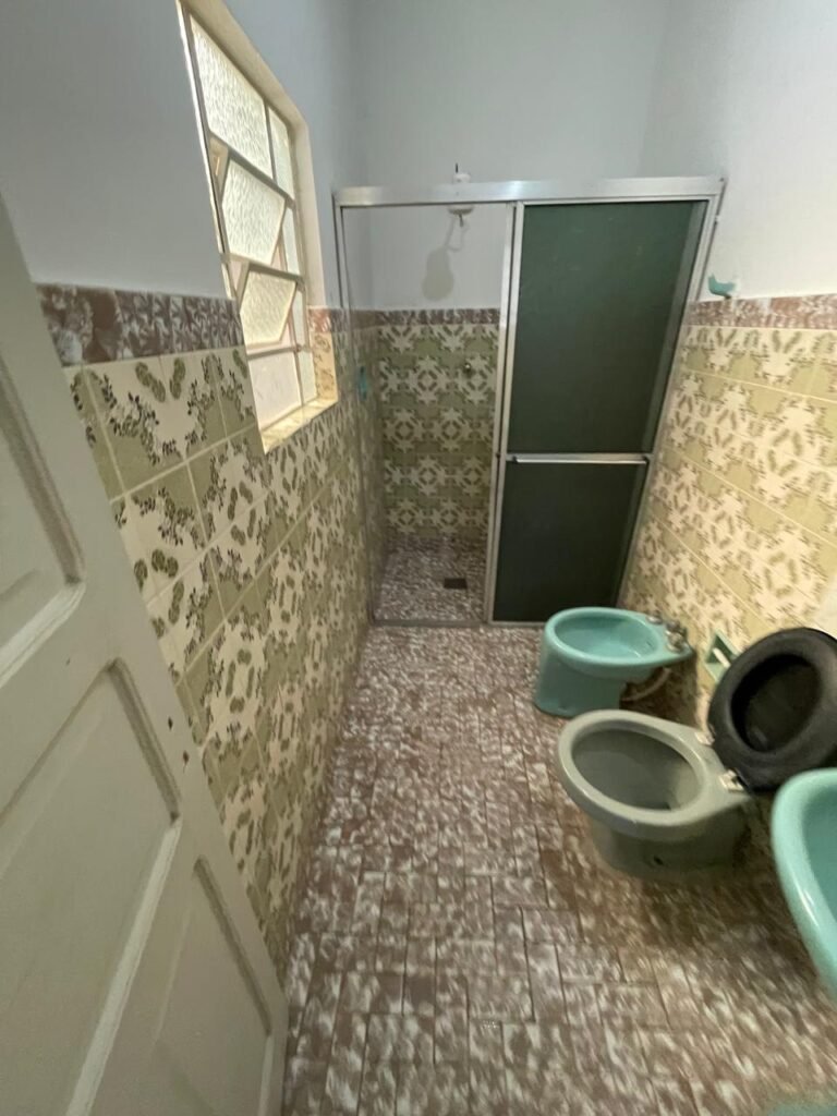 BANHEIRO-: 01 porta social de madeira com 01 trinco em ordem e com desgaste natural e restante em ordem, piso e rodapés parede 1/2 revestida de frio cerâmico com desenhos de flores, desgastes naturais e trincados pela extensão, 01 vaso cerâmico cor cinza marca Deca em ordem, tampa e acento marca Astra em ordem, com descarga e válvula em ordem, 01 pia comcoluna de cerâmica por azul com desgaste natural e restante em ordem, 02 registros com canoplas em inox em ordem, 01 torneira em inox com desgaste natural e restante em ordem, 01 suporte de papel higiênico embutido cor azul em ordem, 01 bidê de cerâmica cor azul em ordem, com 03 registros sendo que 01 deles está faltando o acabamento e restante em ordem , 01 suporte de toalha de cerâmica embutido cor azul com desgaste e restante em ordem, 01 suporte de cerâmica cor azul embutido em ordem, 02 canoplas em inox do registro em ordem, 01 armário embutido com espelho de reflexo com desgaste natural e restante em ordem, 02 suporte de sabonete embutido de cerâmica na cor azul em ordem, 01 espelho de luz com 101 tomada e 02 interruptores em ordem, 01 box 02 portas de correr, com esquadrias em inox com desgaste natural e restante em ordem, com 102 portas contendo zero duas folhas de acrílico cor preto em ordem 01 puxador em ordem, 01 ralo de inox em ordem, 01 cano em óxido do chuveiro, 01 chuveiro Max ducha Lorenzetti em ordem, 01 suporte de ferro cor branco em ordem, estante paredes e teto com pintura na cor branco neve em ordem, 01 lâmpada com Led em ordem, 01 vitrô basculante com esquadria de ferro com pintura na cor branco nova em ordem, e com 08 vidros detalhados em ordem e 01 fechadura em ordem.