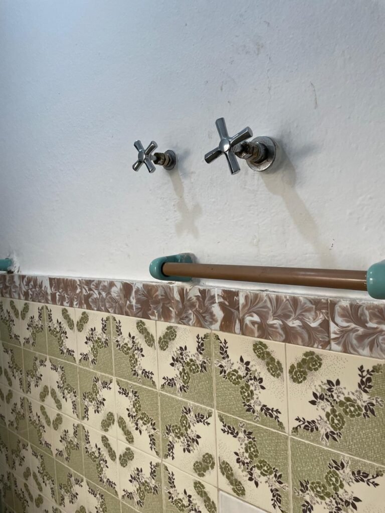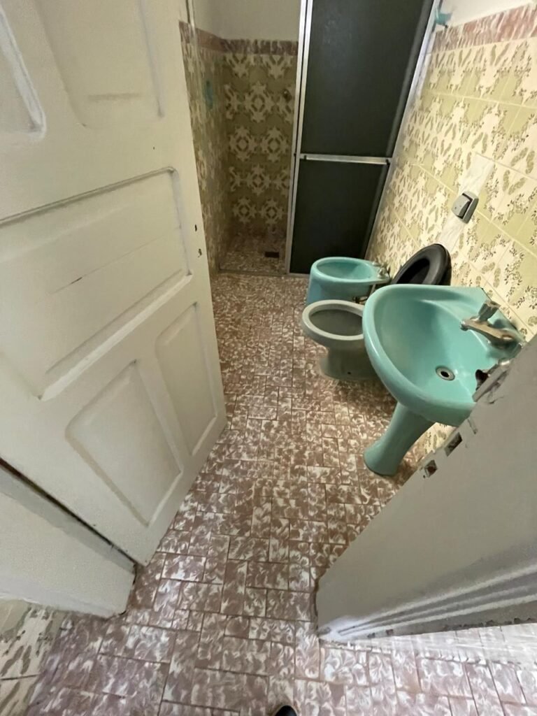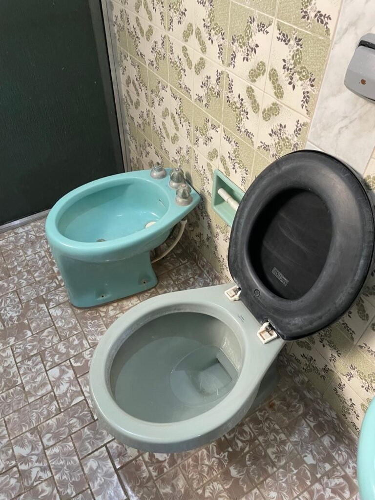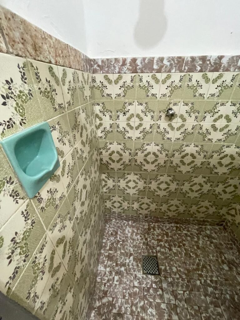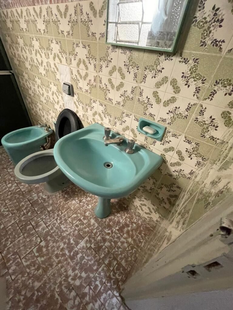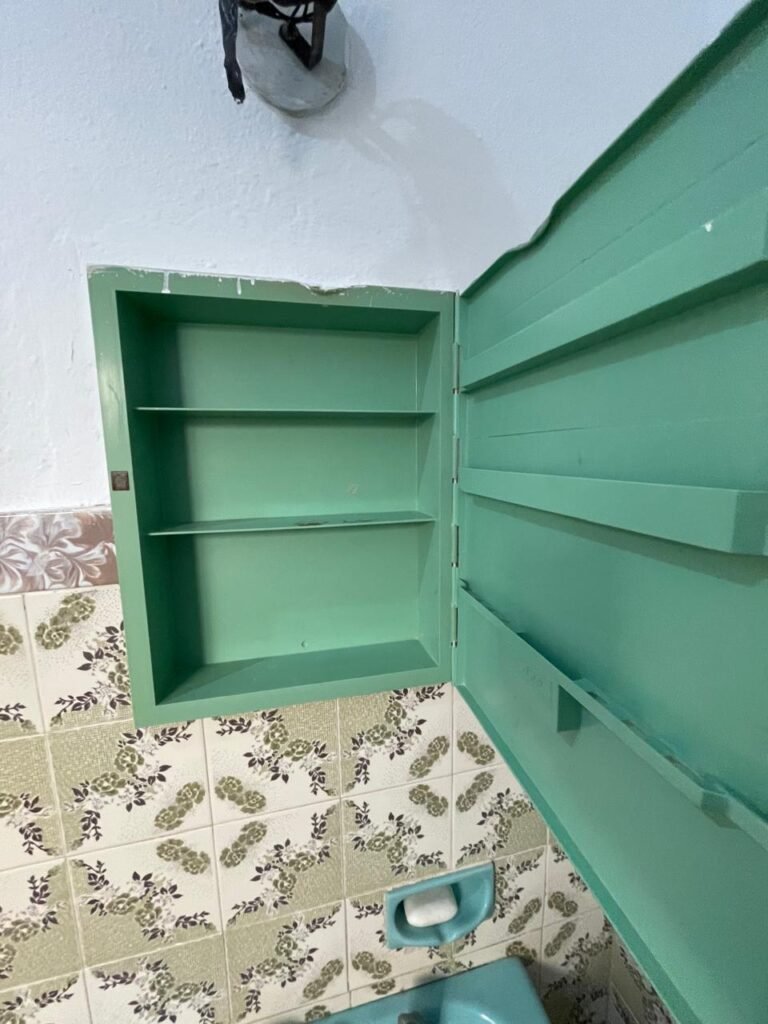 BANHEIRO-: 01 porta social de madeira com 01 trinco em ordem e com desgaste natural e restante em ordem, piso e rodapés parede 1/2 revestida de frio cerâmico com desenhos de flores, desgastes naturais e trincados pela extensão, 01 vaso cerâmico cor cinza marca Deca em ordem, tampa e acento marca Astra em ordem, com descarga e válvula em ordem, 01 pia comcoluna de cerâmica por azul com desgaste natural e restante em ordem, 02 registros com canoplas em inox em ordem, 01 torneira em inox com desgaste natural e restante em ordem, 01 suporte de papel higiênico embutido cor azul em ordem, 01 bidê de cerâmica cor azul em ordem, com 03 registros sendo que 01 deles está faltando o acabamento e restante em ordem , 01 suporte de toalha de cerâmica embutido cor azul com desgaste e restante em ordem, 01 suporte de cerâmica cor azul embutido em ordem, 02 canoplas em inox do registro em ordem, 01 armário embutido com espelho de reflexo com desgaste natural e restante em ordem, 02 suporte de sabonete embutido de cerâmica na cor azul em ordem, 01 espelho de luz com 101 tomada e 02 interruptores em ordem, 01 box 02 portas de correr, com esquadrias em inox com desgaste natural e restante em ordem, com 102 portas contendo zero duas folhas de acrílico cor preto em ordem 01 puxador em ordem, 01 ralo de inox em ordem, 01 cano em óxido do chuveiro, 01 chuveiro Max ducha Lorenzetti em ordem, 01 suporte de ferro cor branco em ordem, estante paredes e teto com pintura na cor branco neve em ordem, 01 lâmpada com Led em ordem, 01 vitrô basculante com esquadria de ferro com pintura na cor branco nova em ordem, e com 08 vidros detalhados em ordem e 01 fechadura em ordem.