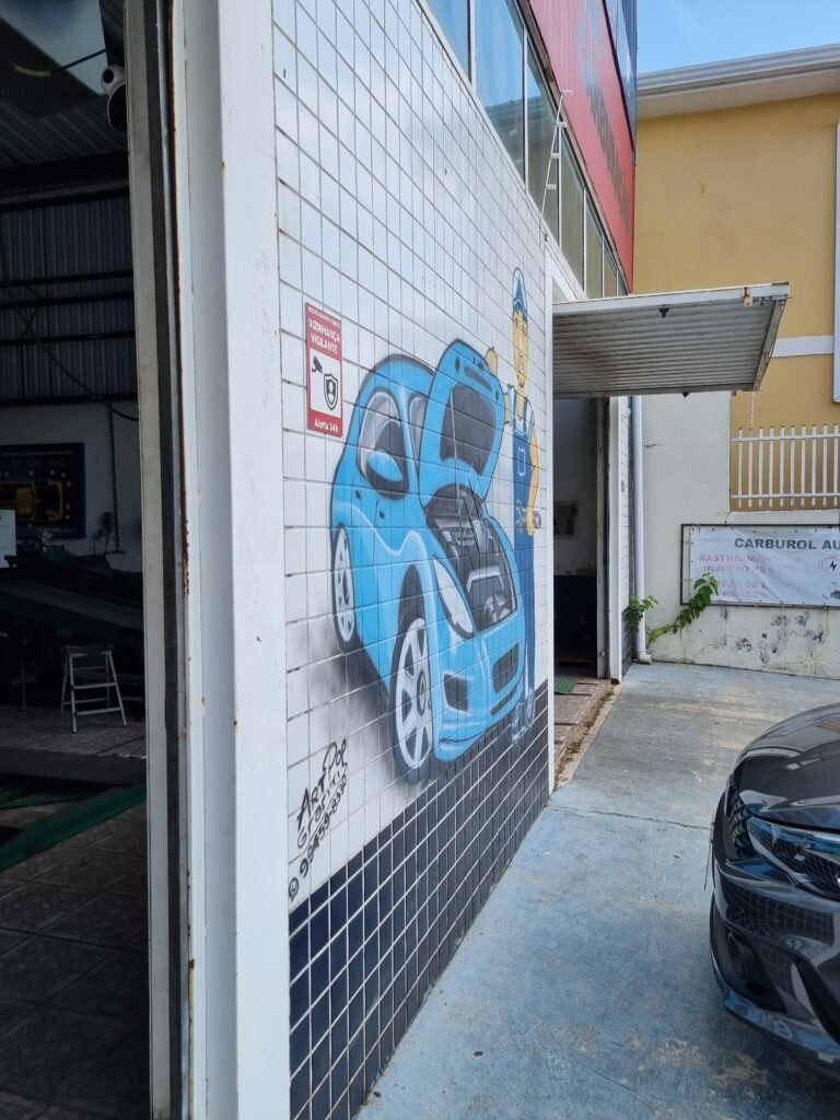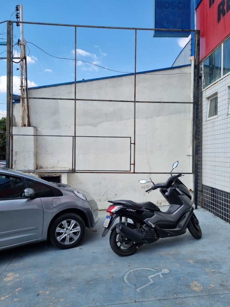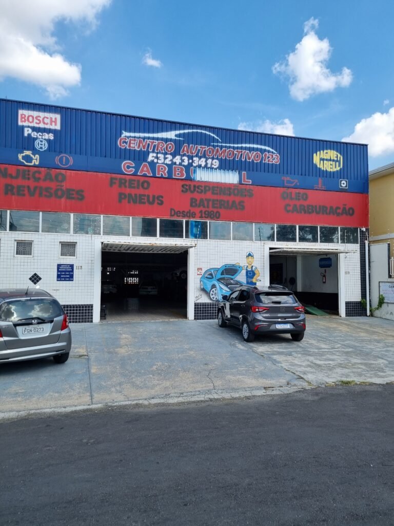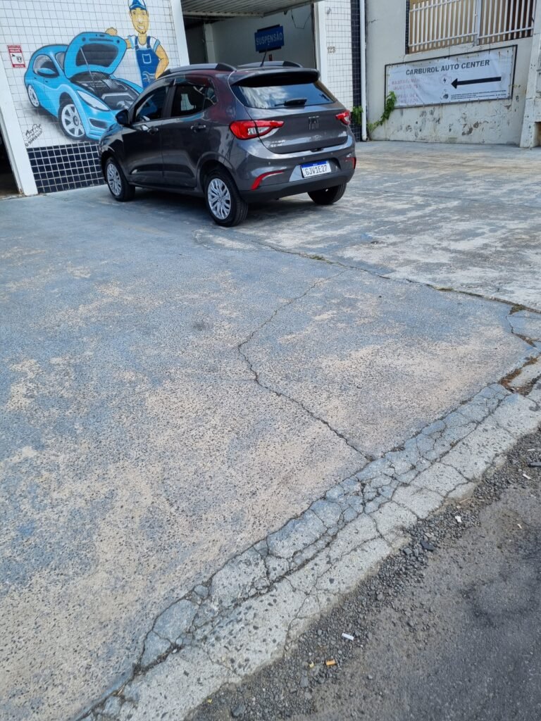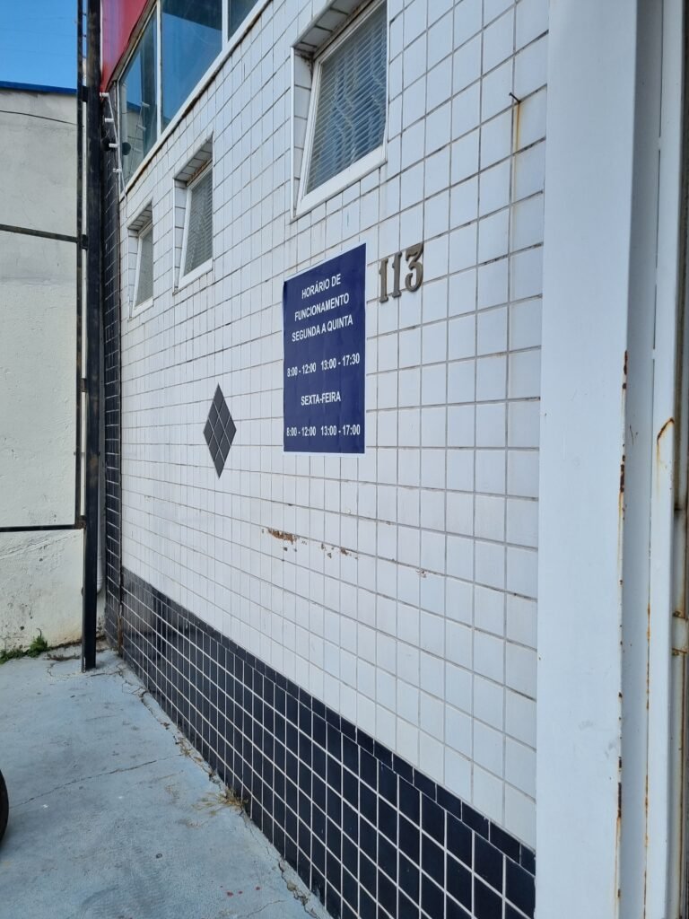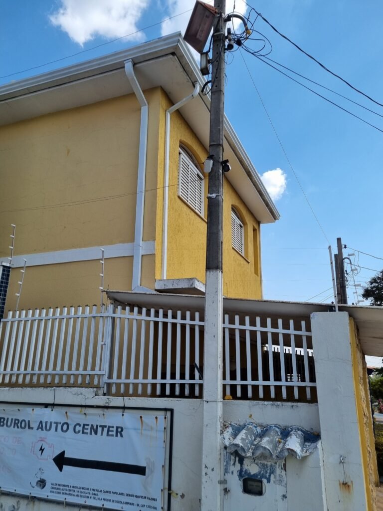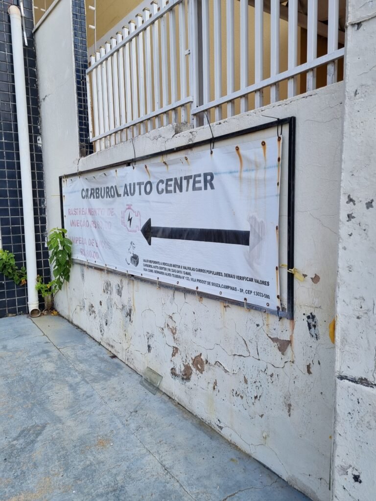 FACHADA:- Calçada piso concreto desempenado com pintura na cor azul com demarcações em amarelo com pintura falhada, gasta com trincas e remedos, muros com pintura na cor branco com infiltrações e desgaste de uso, padrão CFL com relógio em ordem, padrão SANASA com relógio em ordem, estrutura de ferro para propaganda, fachada galpão com parede de pastilhas nas cores branco e preto, 15 vidros lisos em ordem, restante telhas galvanizadas com pintura na cor azul e lona na cor vermelho com publicidade da empresa carburol, 02 portões chapa dobrada com pintura na cor branco em ordem.