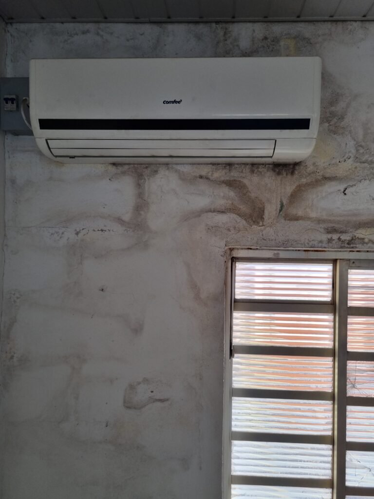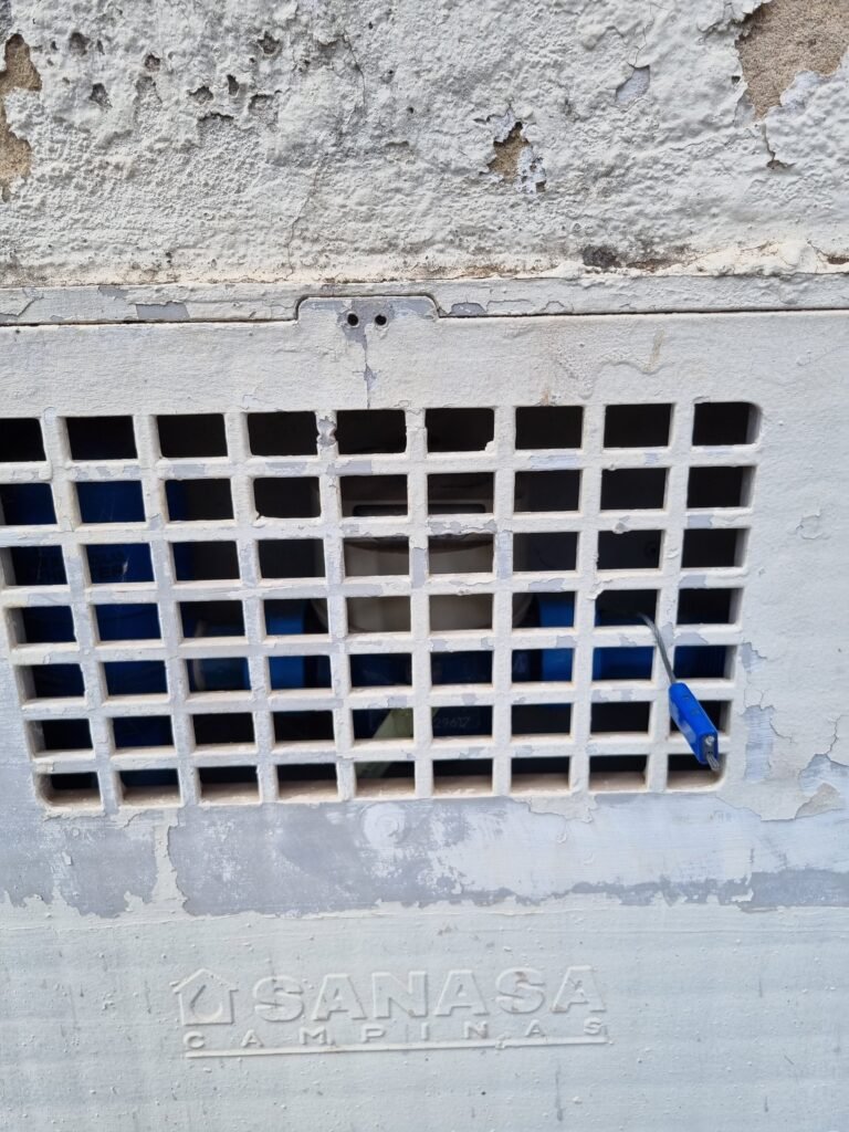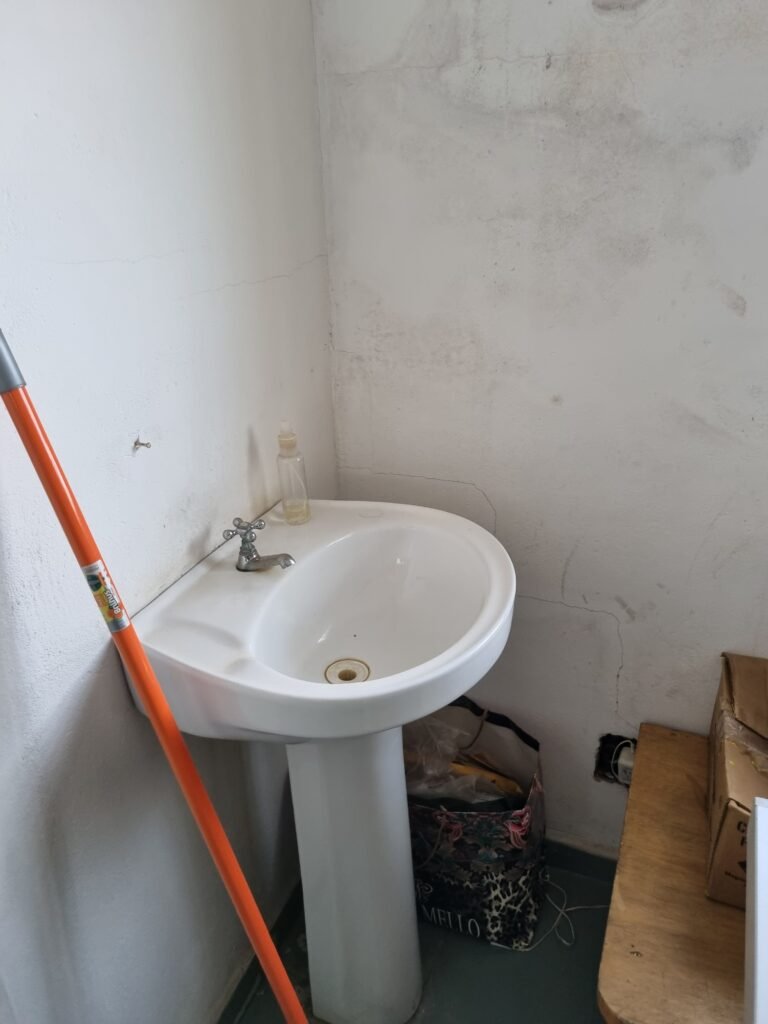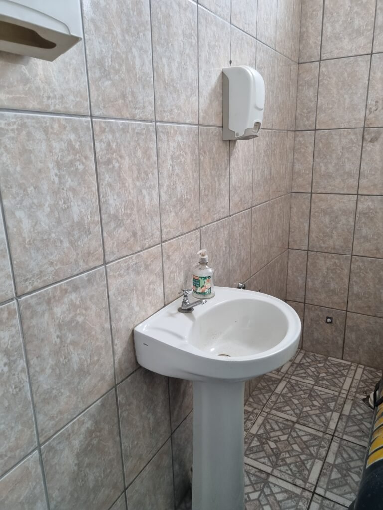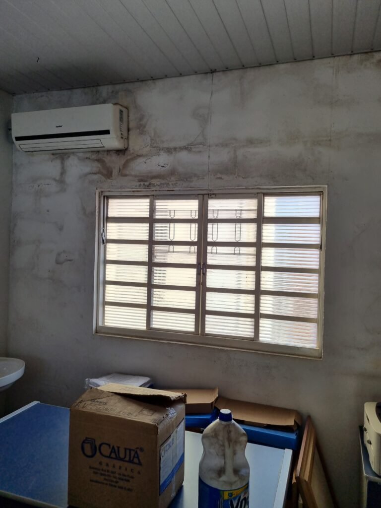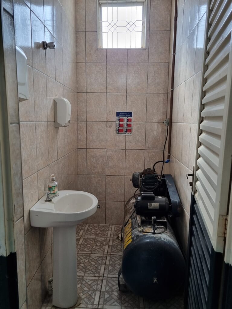 SALA 1:- Piso frio cerâmico com pintura tinta piso na cor cinza com 02 peças trincadas, parede alvenaria com reboco com manchas infiltração, divisório naval e 04 vidros lisos em ordem, porta divisórios anavalhem ordem, vitro de correr com travas em ordem, faltando parte da grade, 28 vidros canelados sendo que 02 estão trincados, 01 conjuntos lavatório e coluna cerâmica branca em ordem, torneira em ordem, 01 suporte toalha em ordem, 01 aparelho ar condicionado comei modelo MSM-07CR 7060 BTU, 02 portas de ferro em ordem, maçanetas e fechadura em ordem.