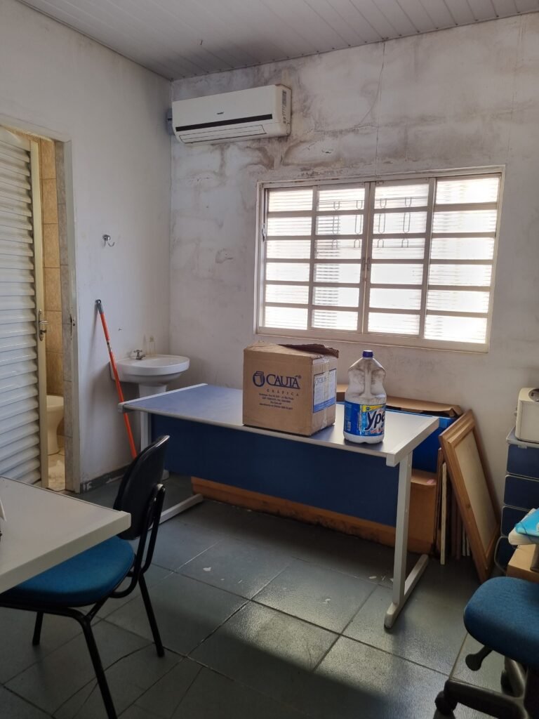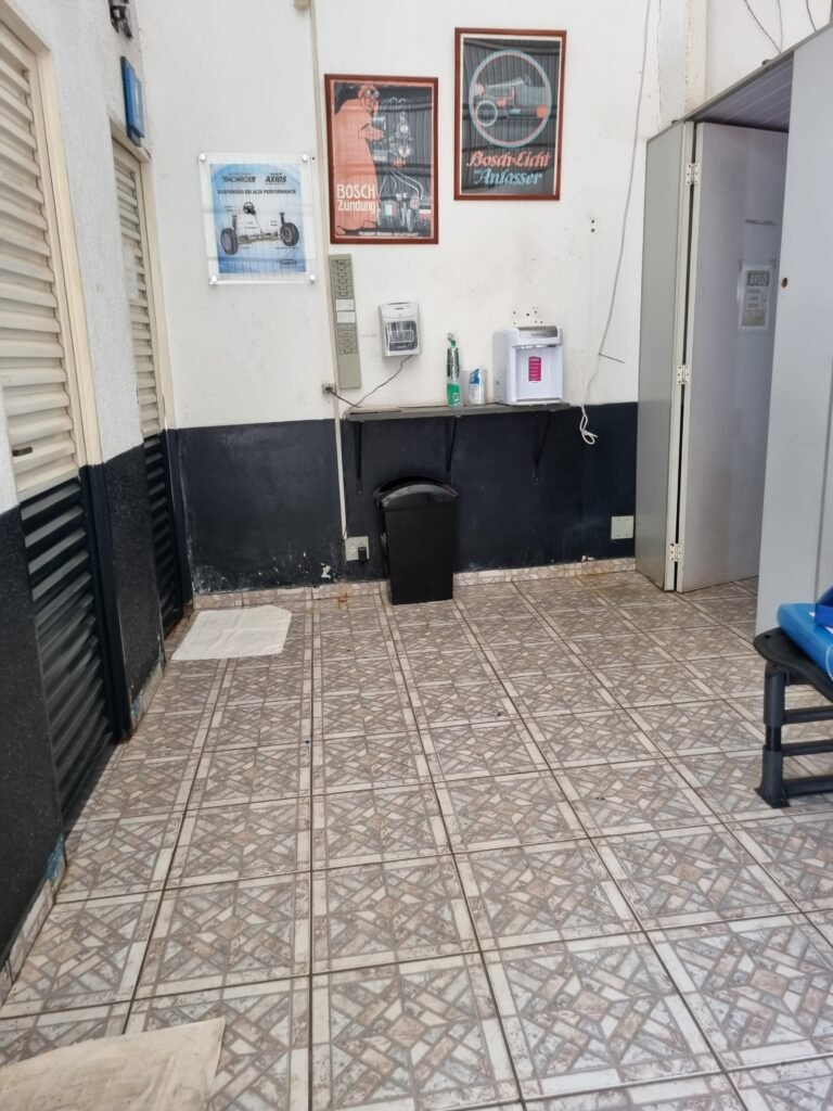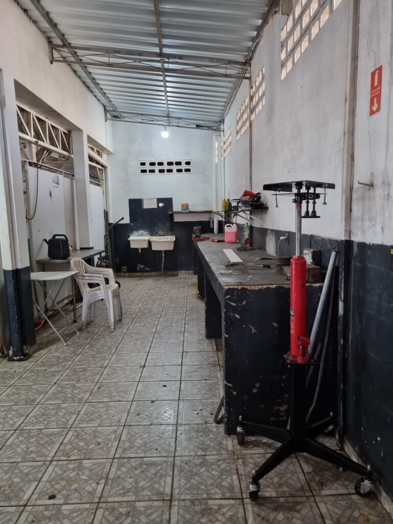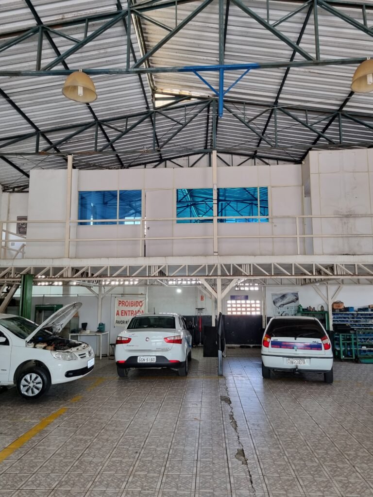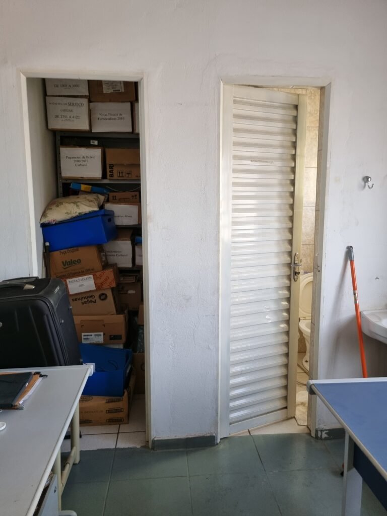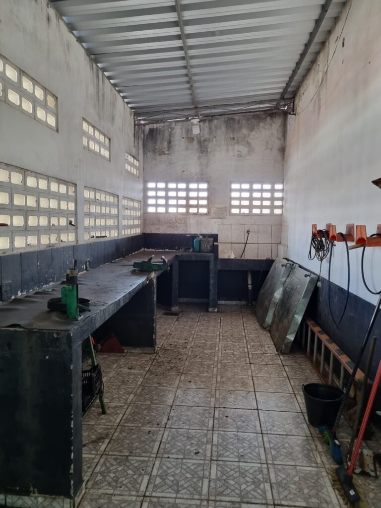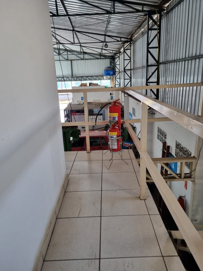 GALPÃO:- Piso frio cerâmico mesclado faltando 10 peças na entrada próximo aos portões, 07 peças quebradas próximo aos portões, trincas do meio da galpão em toda a extensão de portas ao fundo com 60 peças quebradas, varias peças picotadas no piso em geral, ½ parede de alvenaria reboco com pintura na cor branco com manchas e desgaste de uso restante barrado na cor preto em ordem, telhas galvanizadas em ordem, telhado estrutura ferro com telhas galvanizadas em ordem, 06 lustres em ordem, 06 lâmpadas florescentes em ordem, caixa disjuntores com tampa em ordem, com 12 disjuntores em ordem, 05 extintores pó químico 4Kg 20-B:C em ordem, 03 extintores água 10Lt 2-A em ordem, 01 extintor pó químico 8 kg 20-B:C em ordem, 02 bancadas alvenaria com reboco e pintura na cor preto, 02 tanques de plástico com manchas, 01 torneira de jardim em ordem, 03 prateleiras de chapa xadrez, 02 tanques de alvenaria revestido de azulejos em ordem, 01 torneira jardim em ordem, 03 ralos com tampa de ferro em ordem, 04 lâmpadas LED bulbo em ordem e escritório divisório naval com 05 vidros fume em ordem , 02 vidros liso transparente em ordem, 01 porta com fechadura quebrada, teto forro PVC branco.