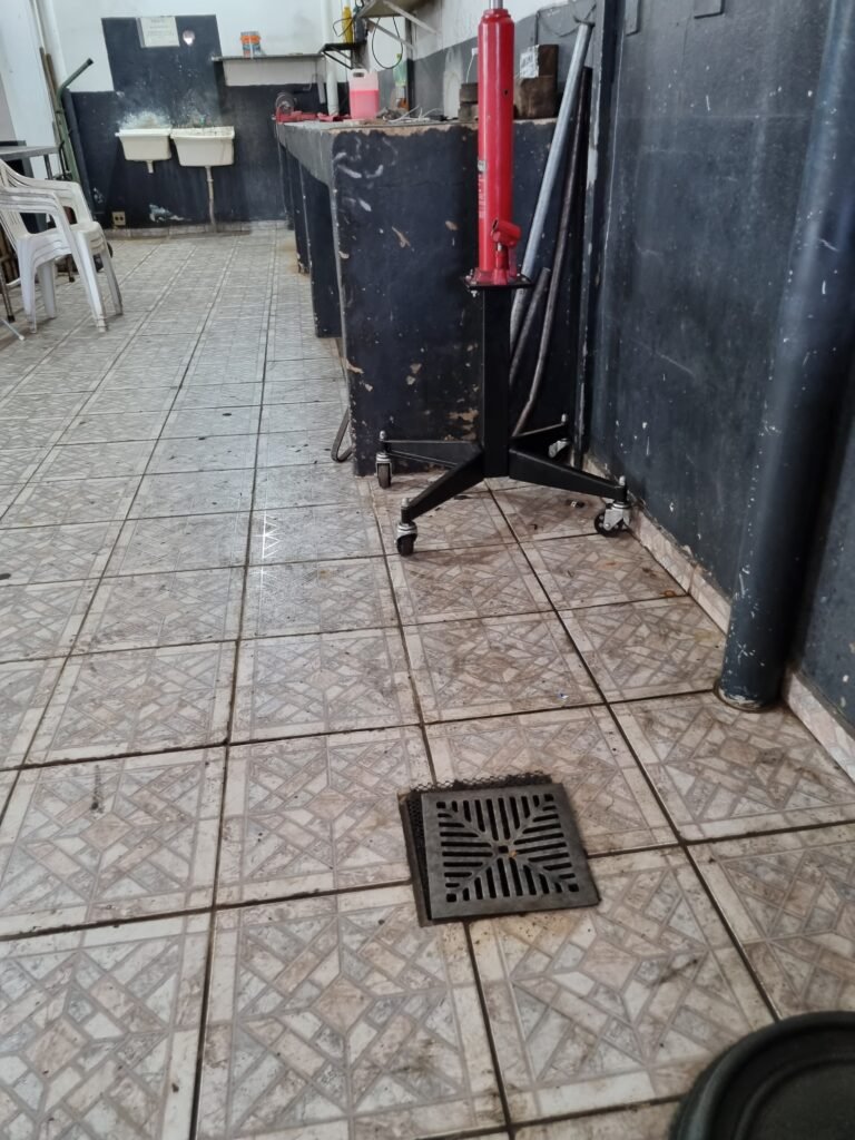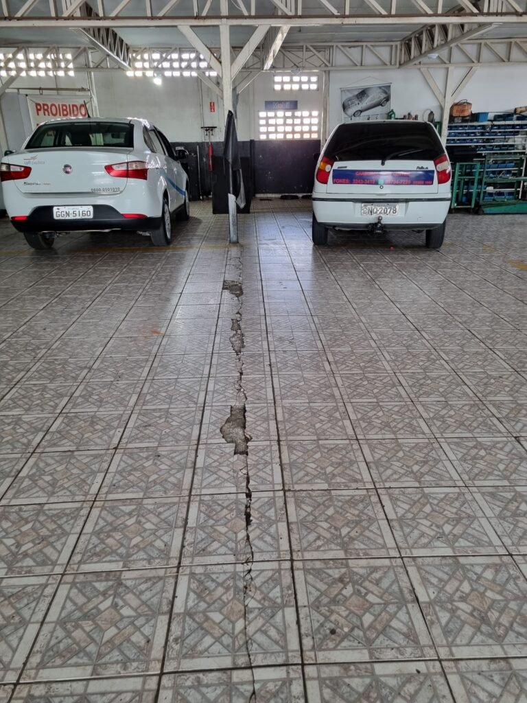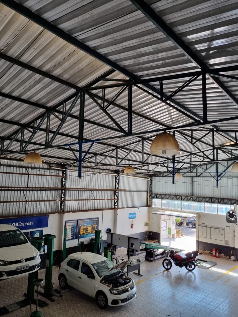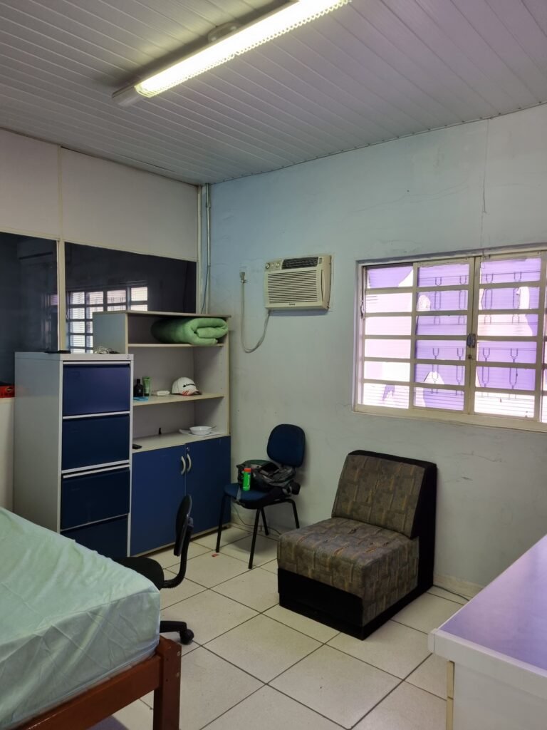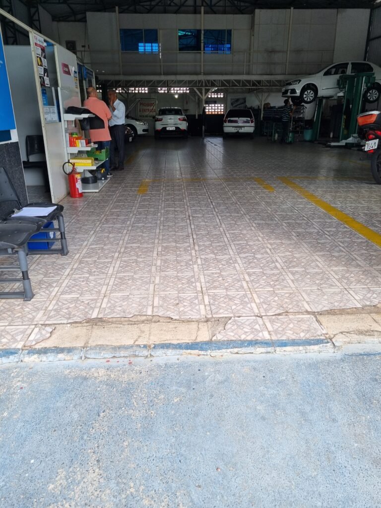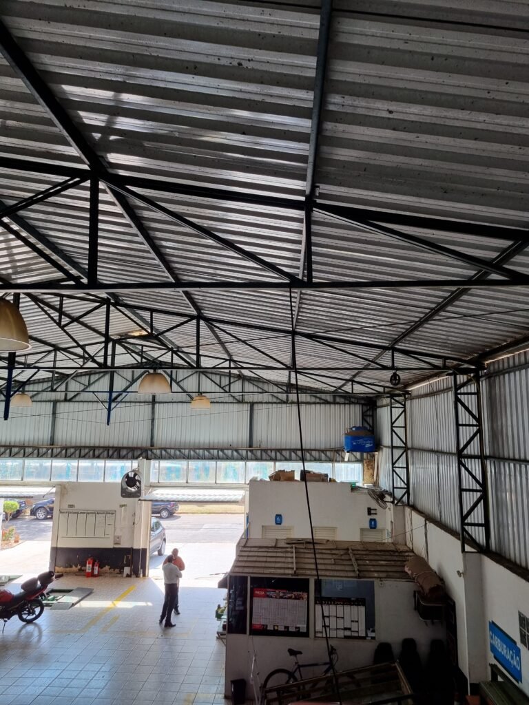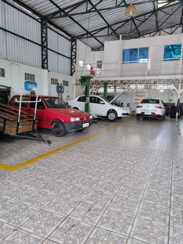 GALPÃO:- Piso frio cerâmico mesclado faltando 10 peças na entrada próximo aos portões, 07 peças quebradas próximo aos portões, trincas do meio da galpão em toda a extensão de portas ao fundo com 60 peças quebradas, varias peças picotadas no piso em geral, ½ parede de alvenaria reboco com pintura na cor branco com manchas e desgaste de uso restante barrado na cor preto em ordem, telhas galvanizadas em ordem, telhado estrutura ferro com telhas galvanizadas em ordem, 06 lustres em ordem, 06 lâmpadas florescentes em ordem, caixa disjuntores com tampa em ordem, com 12 disjuntores em ordem, 05 extintores pó químico 4Kg 20-B:C em ordem, 03 extintores água 10Lt 2-A em ordem, 01 extintor pó químico 8 kg 20-B:C em ordem, 02 bancadas alvenaria com reboco e pintura na cor preto, 02 tanques de plástico com manchas, 01 torneira de jardim em ordem, 03 prateleiras de chapa xadrez, 02 tanques de alvenaria revestido de azulejos em ordem, 01 torneira jardim em ordem, 03 ralos com tampa de ferro em ordem, 04 lâmpadas LED bulbo em ordem e escritório divisório naval com 05 vidros fume em ordem , 02 vidros liso transparente em ordem, 01 porta com fechadura quebrada, teto forro PVC branco.