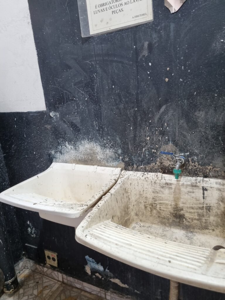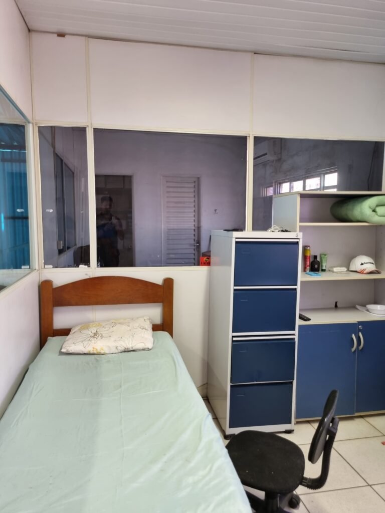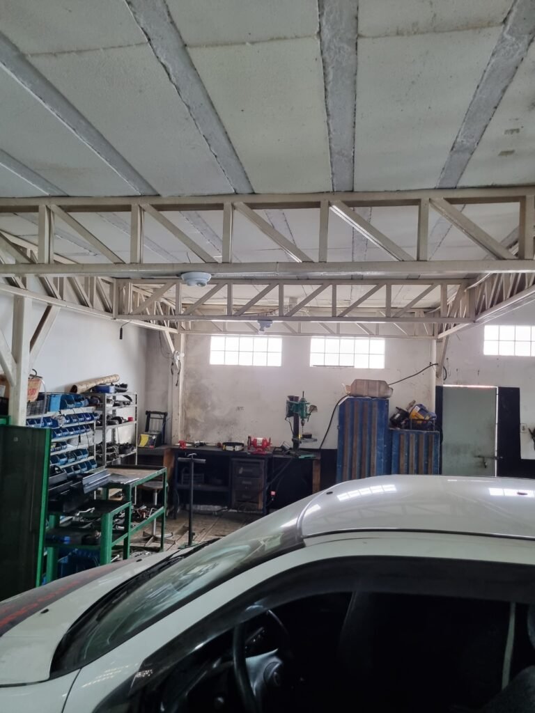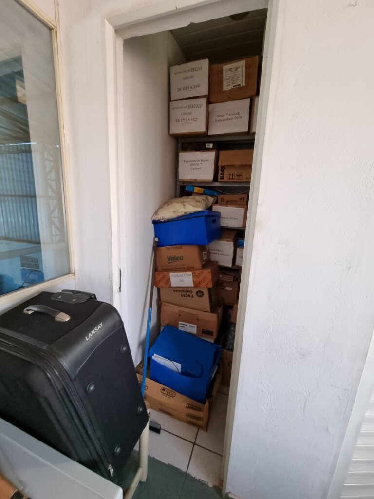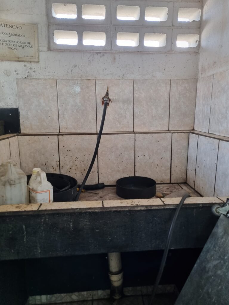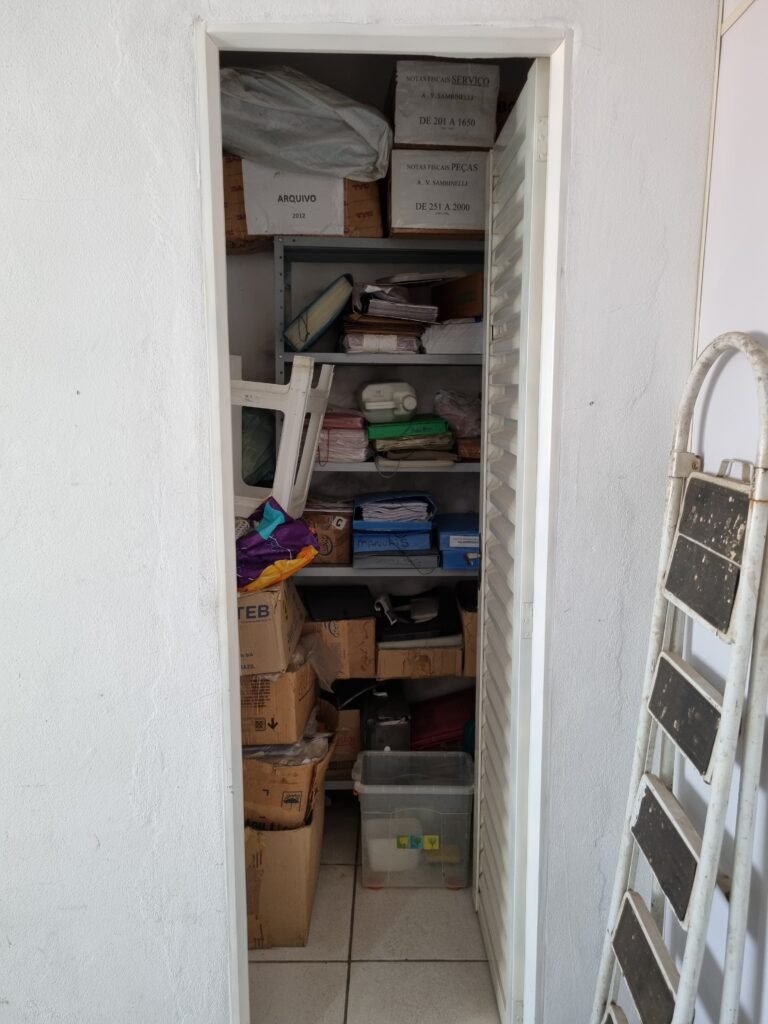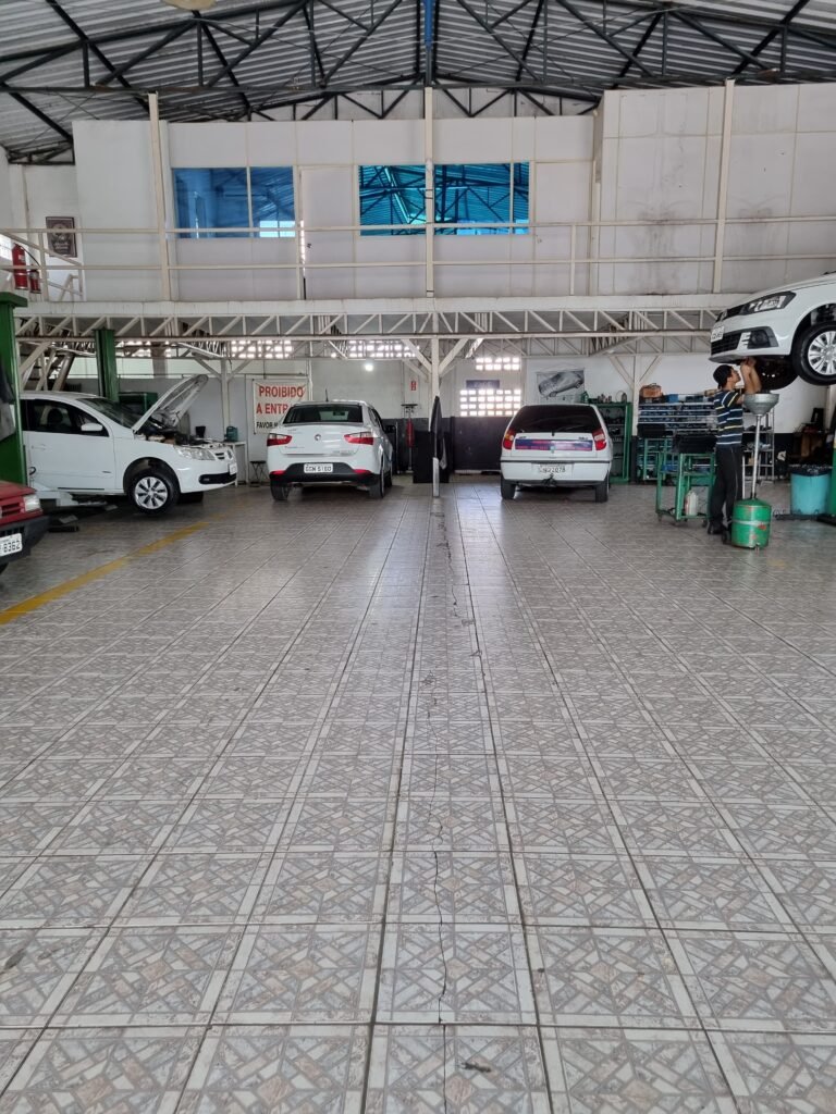 GALPÃO:- Piso frio cerâmico mesclado faltando 10 peças na entrada próximo aos portões, 07 peças quebradas próximo aos portões, trincas do meio da galpão em toda a extensão de portas ao fundo com 60 peças quebradas, varias peças picotadas no piso em geral, ½ parede de alvenaria reboco com pintura na cor branco com manchas e desgaste de uso restante barrado na cor preto em ordem, telhas galvanizadas em ordem, telhado estrutura ferro com telhas galvanizadas em ordem, 06 lustres em ordem, 06 lâmpadas florescentes em ordem, caixa disjuntores com tampa em ordem, com 12 disjuntores em ordem, 05 extintores pó químico 4Kg 20-B:C em ordem, 03 extintores água 10Lt 2-A em ordem, 01 extintor pó químico 8 kg 20-B:C em ordem, 02 bancadas alvenaria com reboco e pintura na cor preto, 02 tanques de plástico com manchas, 01 torneira de jardim em ordem, 03 prateleiras de chapa xadrez, 02 tanques de alvenaria revestido de azulejos em ordem, 01 torneira jardim em ordem, 03 ralos com tampa de ferro em ordem, 04 lâmpadas LED bulbo em ordem e escritório divisório naval com 05 vidros fume em ordem , 02 vidros liso transparente em ordem, 01 porta com fechadura quebrada, teto forro PVC branco.