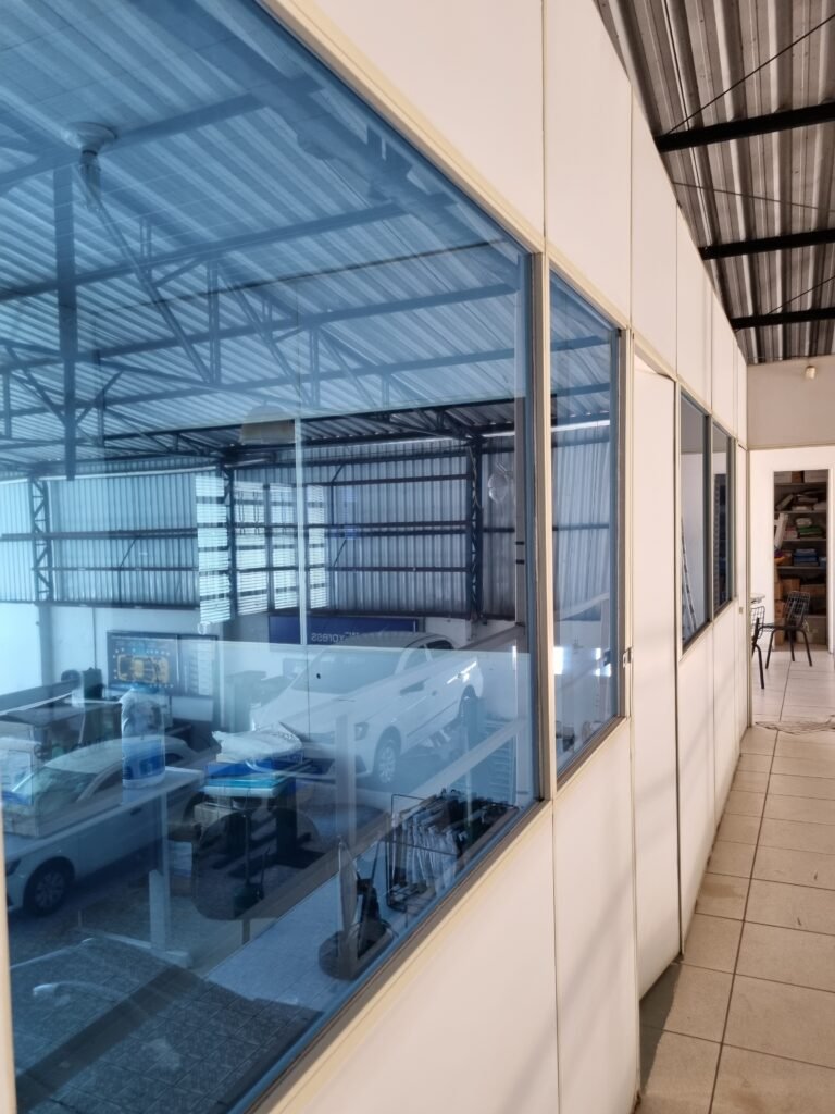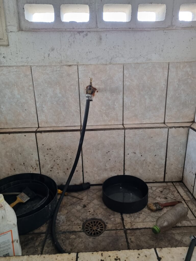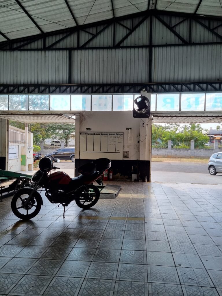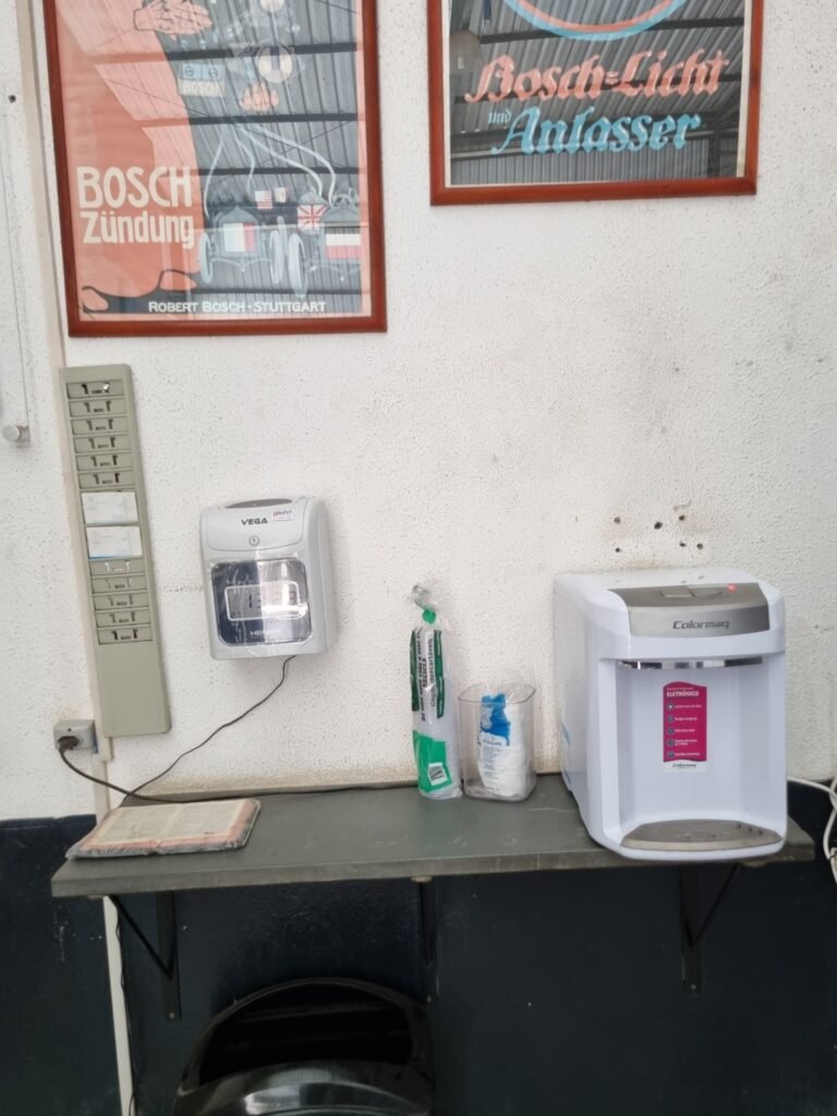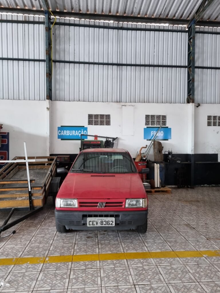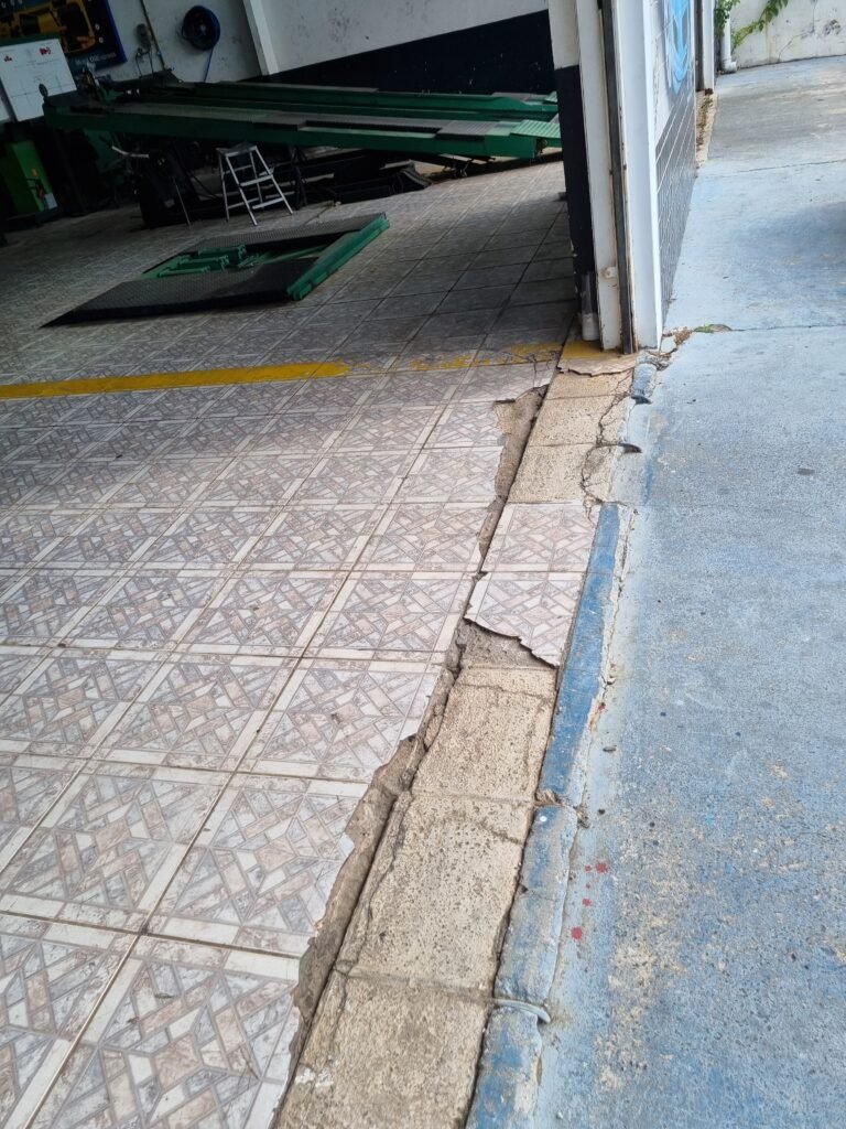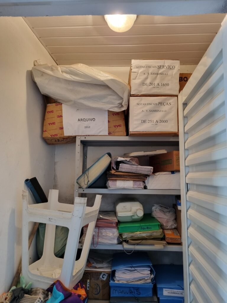 GALPÃO:- Piso frio cerâmico mesclado faltando 10 peças na entrada próximo aos portões, 07 peças quebradas próximo aos portões, trincas do meio da galpão em toda a extensão de portas ao fundo com 60 peças quebradas, varias peças picotadas no piso em geral, ½ parede de alvenaria reboco com pintura na cor branco com manchas e desgaste de uso restante barrado na cor preto em ordem, telhas galvanizadas em ordem, telhado estrutura ferro com telhas galvanizadas em ordem, 06 lustres em ordem, 06 lâmpadas florescentes em ordem, caixa disjuntores com tampa em ordem, com 12 disjuntores em ordem, 05 extintores pó químico 4Kg 20-B:C em ordem, 03 extintores água 10Lt 2-A em ordem, 01 extintor pó químico 8 kg 20-B:C em ordem, 02 bancadas alvenaria com reboco e pintura na cor preto, 02 tanques de plástico com manchas, 01 torneira de jardim em ordem, 03 prateleiras de chapa xadrez, 02 tanques de alvenaria revestido de azulejos em ordem, 01 torneira jardim em ordem, 03 ralos com tampa de ferro em ordem, 04 lâmpadas LED bulbo em ordem e escritório divisório naval com 05 vidros fume em ordem , 02 vidros liso transparente em ordem, 01 porta com fechadura quebrada, teto forro PVC branco.