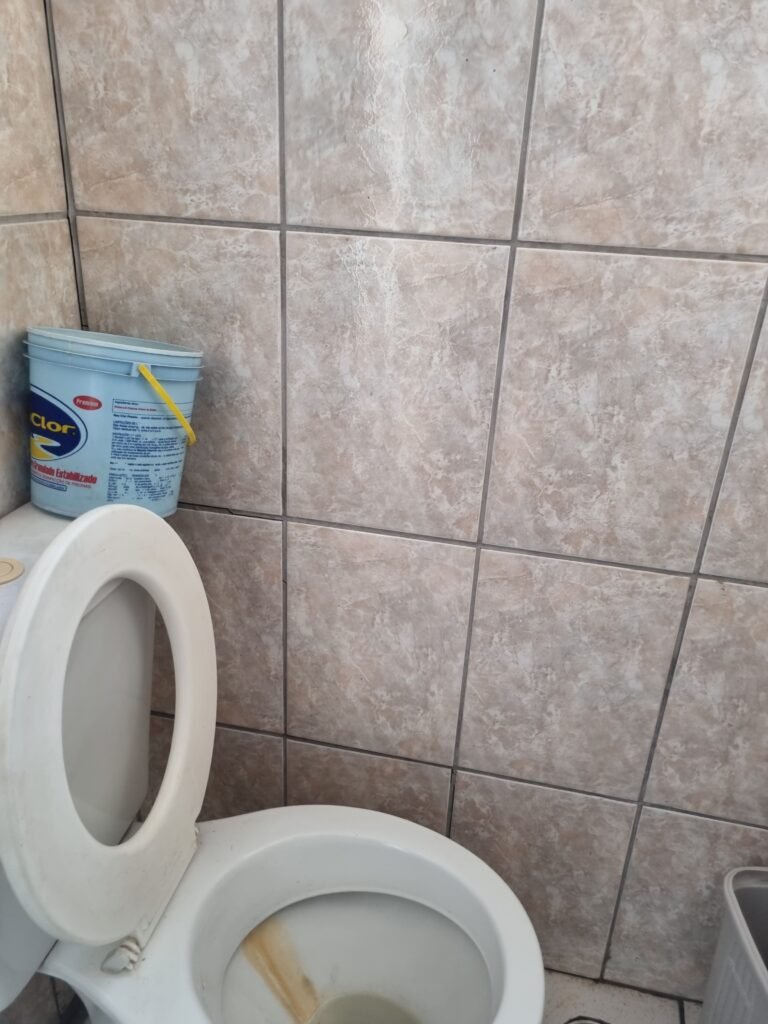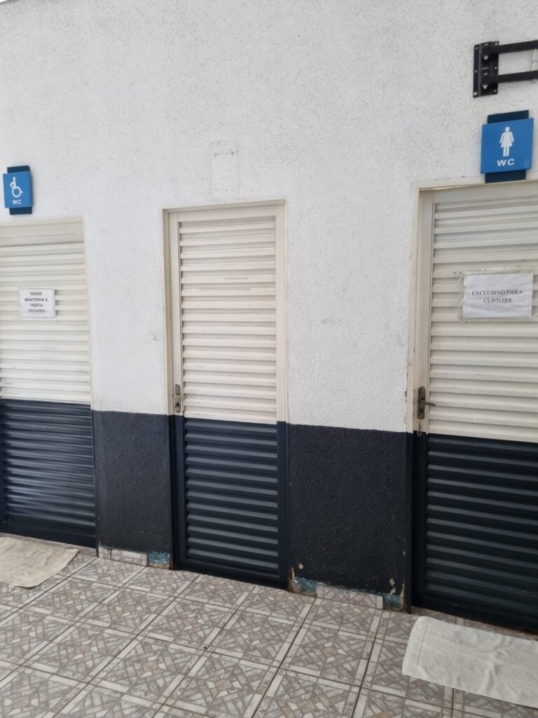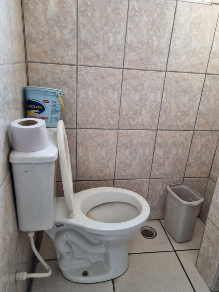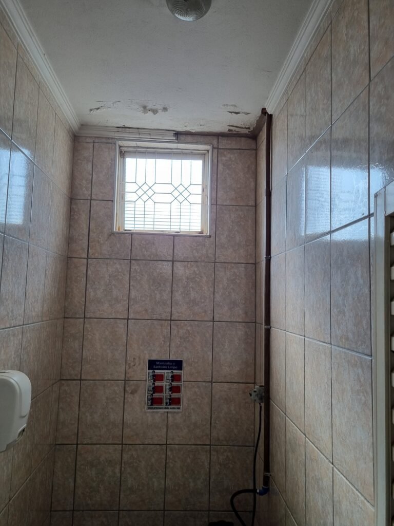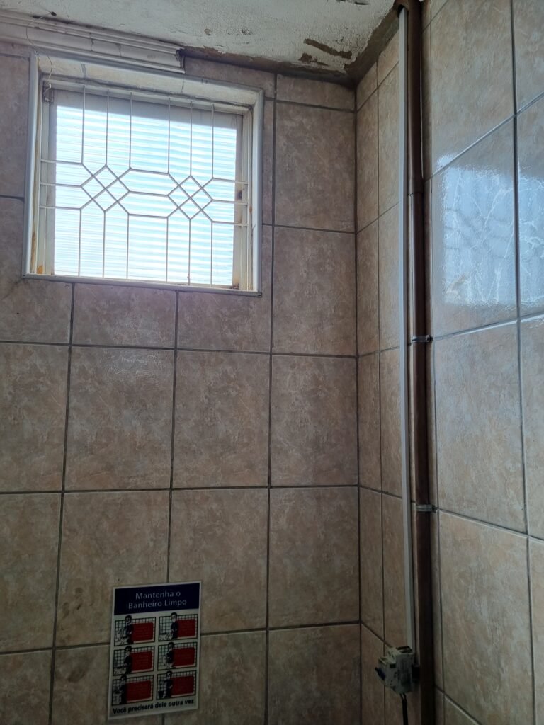 W.C :- Piso frio cerâmico em ordem, azulejo ate o teto em ordem, teto forro PVC em ordem, lustre em ordem, sem lâmpada, 01 chuveiro em ordem, conjunto vasos sanitário e caixa acoplada de descarga em ordem, suporte papel higiênicos em ordem, parte ferro em ordem, maçanetas em ordem, fechadura em ordem, sem chave, vidro basculante em ordem, trava em ordem, grade em ordem, 02 vidros canelado em ordem, 01 ralo sem tampa restante em ordem, 01 interruptor, sem espelho de luz