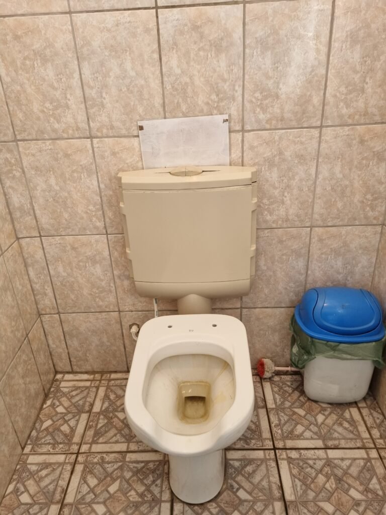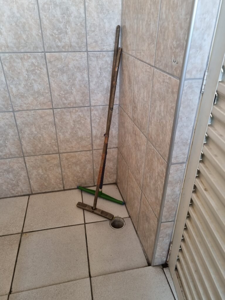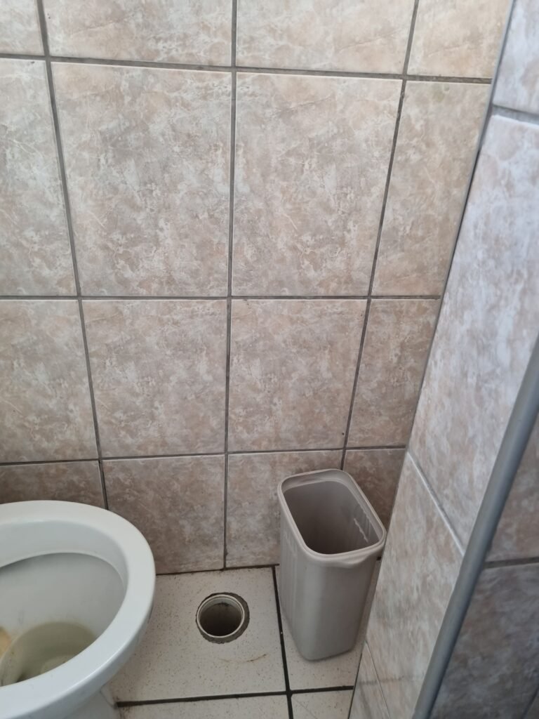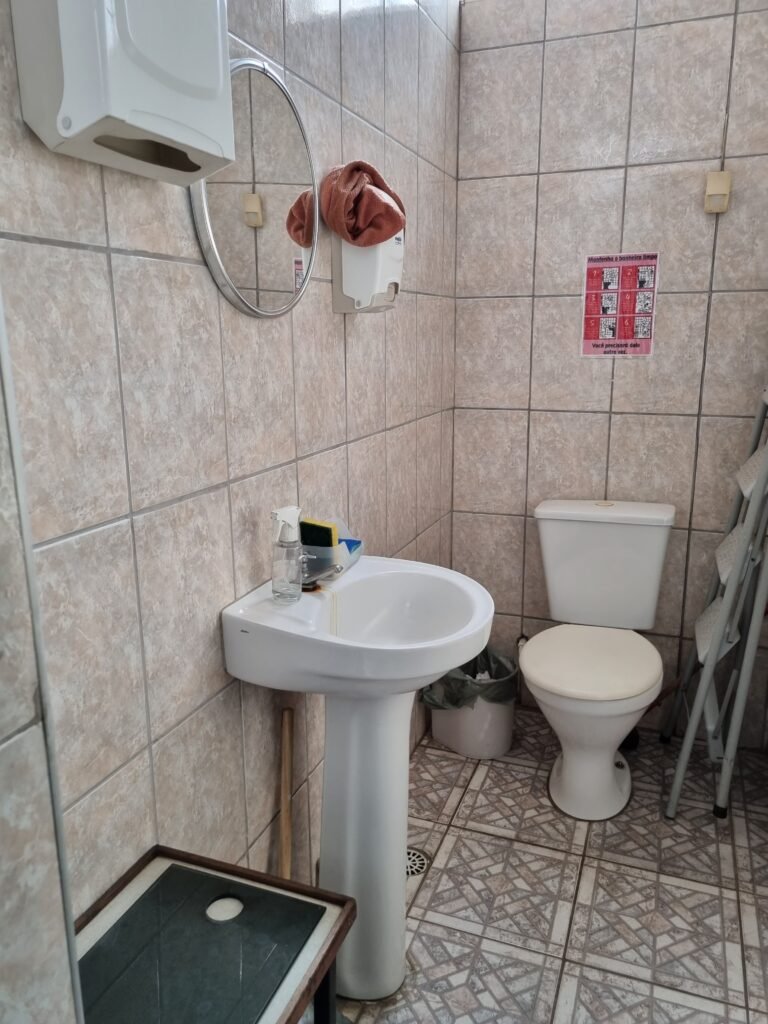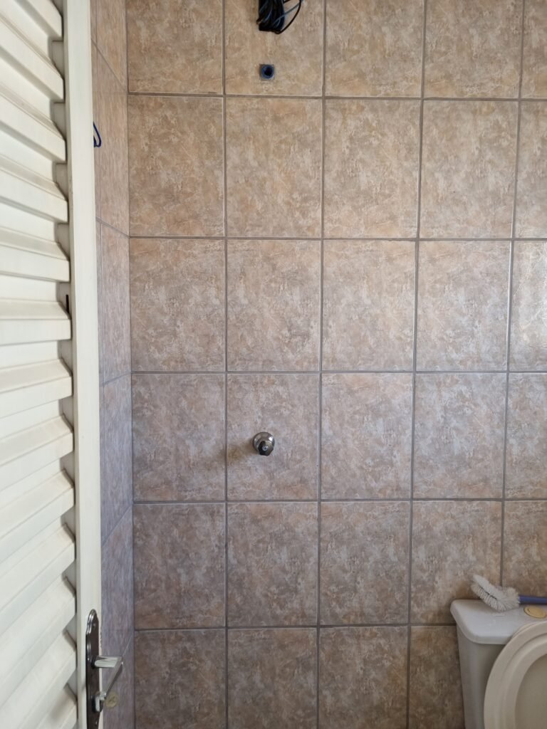 W.C :- Piso frio cerâmico em ordem, azulejo ate o teto em ordem, teto forro PVC em ordem, lustre em ordem, sem lâmpada, 01 chuveiro em ordem, conjunto vasos sanitário e caixa acoplada de descarga em ordem, suporte papel higiênicos em ordem, parte ferro em ordem, maçanetas em ordem, fechadura em ordem, sem chave, vidro basculante em ordem, trava em ordem, grade em ordem, 02 vidros canelado em ordem, 01 ralo sem tampa restante em ordem, 01 interruptor, sem espelho de luz