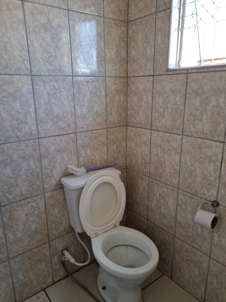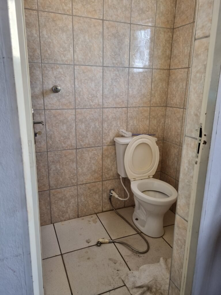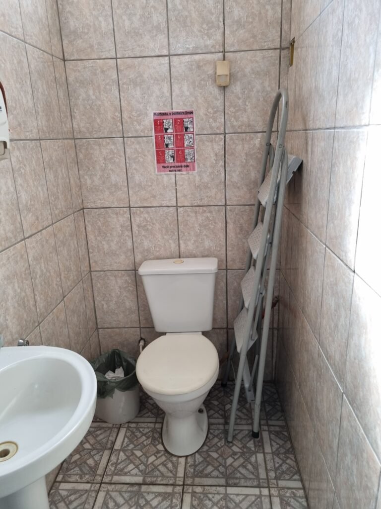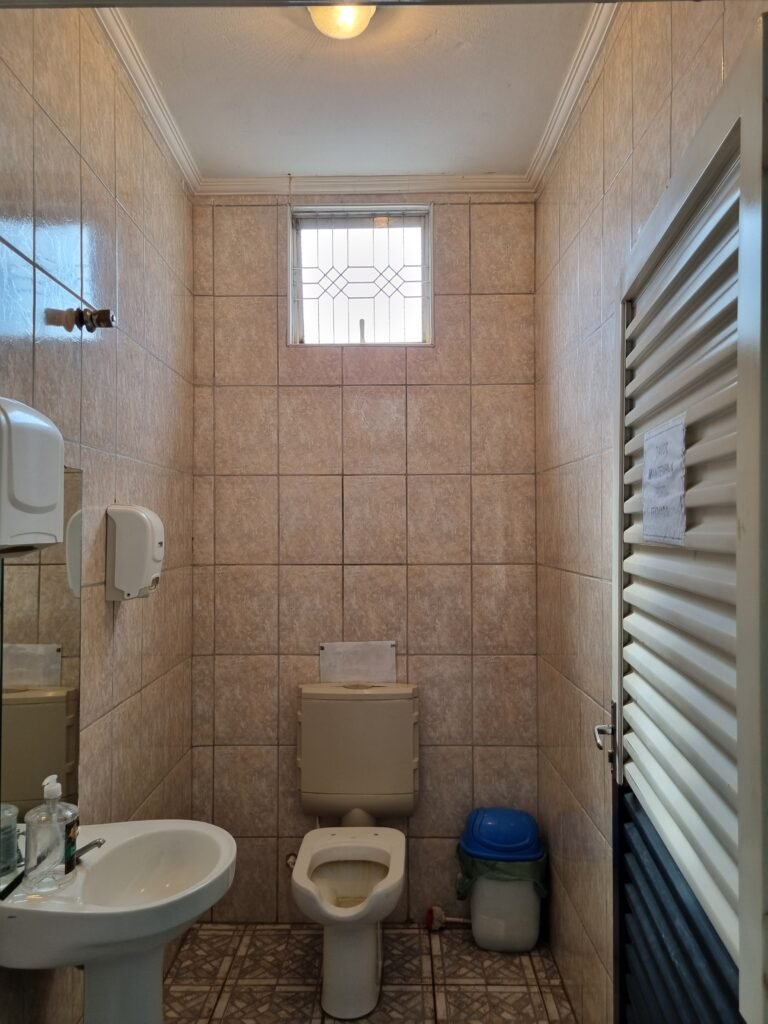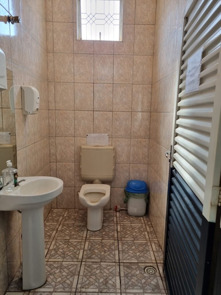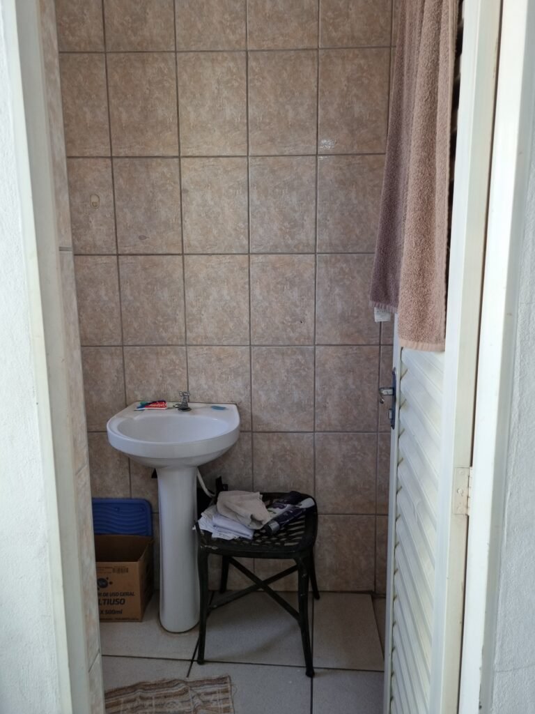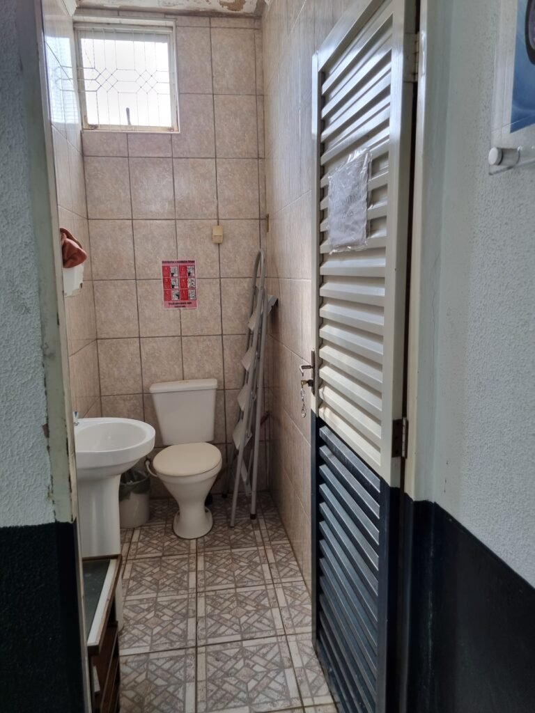 W.C :- Piso frio cerâmico em ordem, azulejo ate o teto em ordem, teto forro PVC em ordem, lustre em ordem, sem lâmpada, sem chuveiro, conjunto vasos sanitário e caixa acoplada de descarga em ordem, suporte papel higiênicos em ordem, parte ferro em ordem, maçanetas em ordem, fechadura e chave em ordem, vidro basculante em ordem, trava em ordem, grade em ordem, 02 vidros canelado em ordem, 01 ralo em ordem, 01 interruptor, 01 espelho de luz.