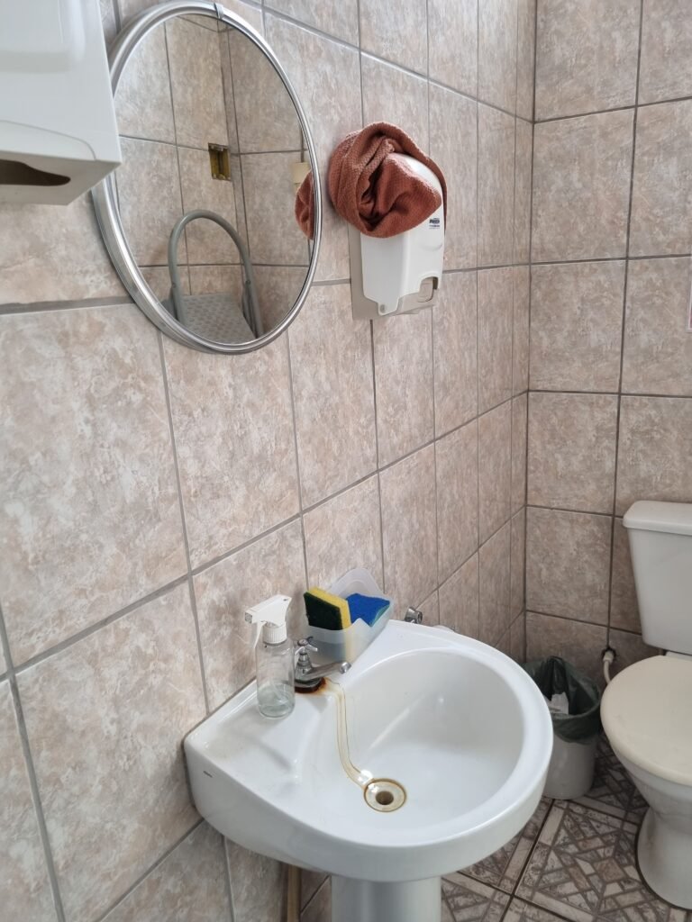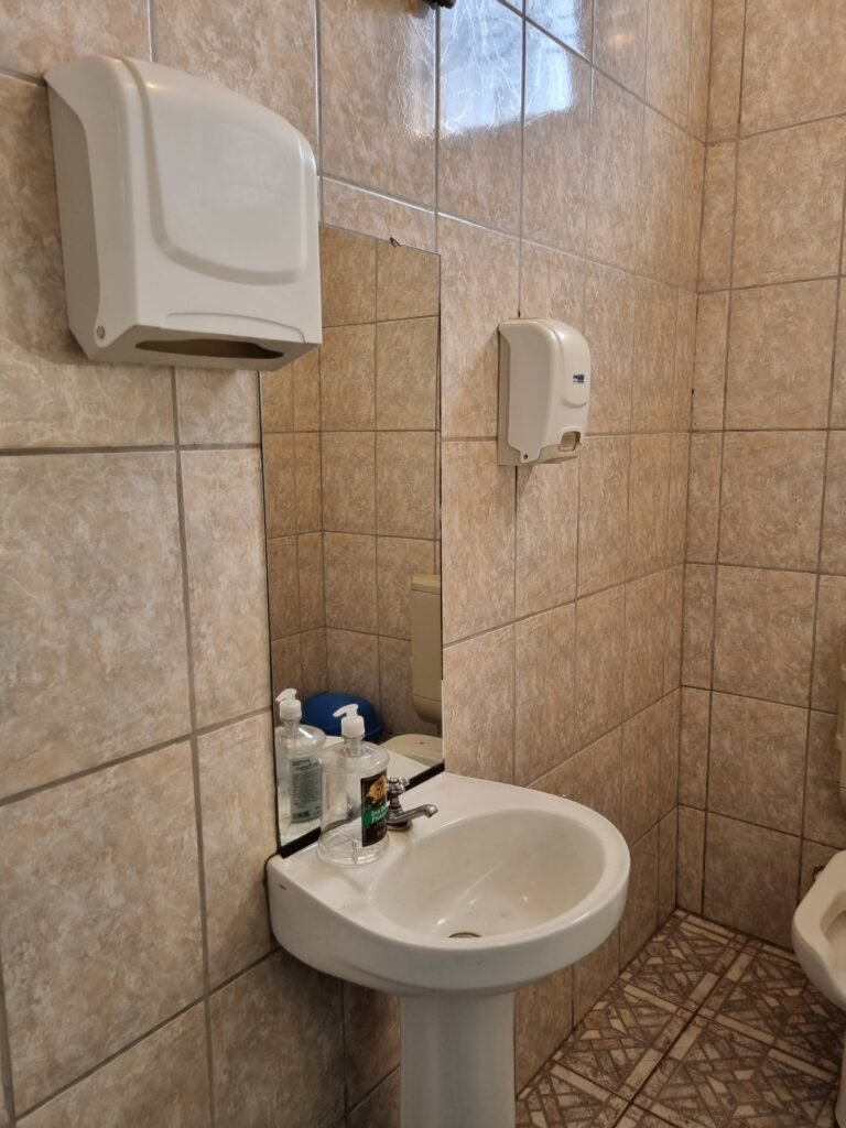 W.C 3:- Piso frio cerâmico mesclado em ordem, ralo com tampa de plástico e desentupido em ordem, azulejo até o teto em ordem, 01 lâmpada fluorescente em ordem, teto com pintura na cor branco neve em ordem, gola de gesso com pintura na cor branco neve faltando 02 pedaços, 02 vitro basculante em ordem, trava em ordem, grade em ordem, 01 vidro canelado em ordem, porta de ferro em ordem com pintura nas cores branco e preto, maçanetas em ordem, fechadura e chave em ordem, conjunto lavatório e coluna cerâmica na cor branca em ordem,01 torneira com vazamento, espelho sobre a pia em ordem, conjunto vaso sanitário e caixa acoplada de descarga em ordem, suporte papel higiênico em ordem, suporte papel toalha, suporte sabonete liquido em ordem, registro com canopla em ordem, 01 espelho de luz em ordem, interruptor em ordem.