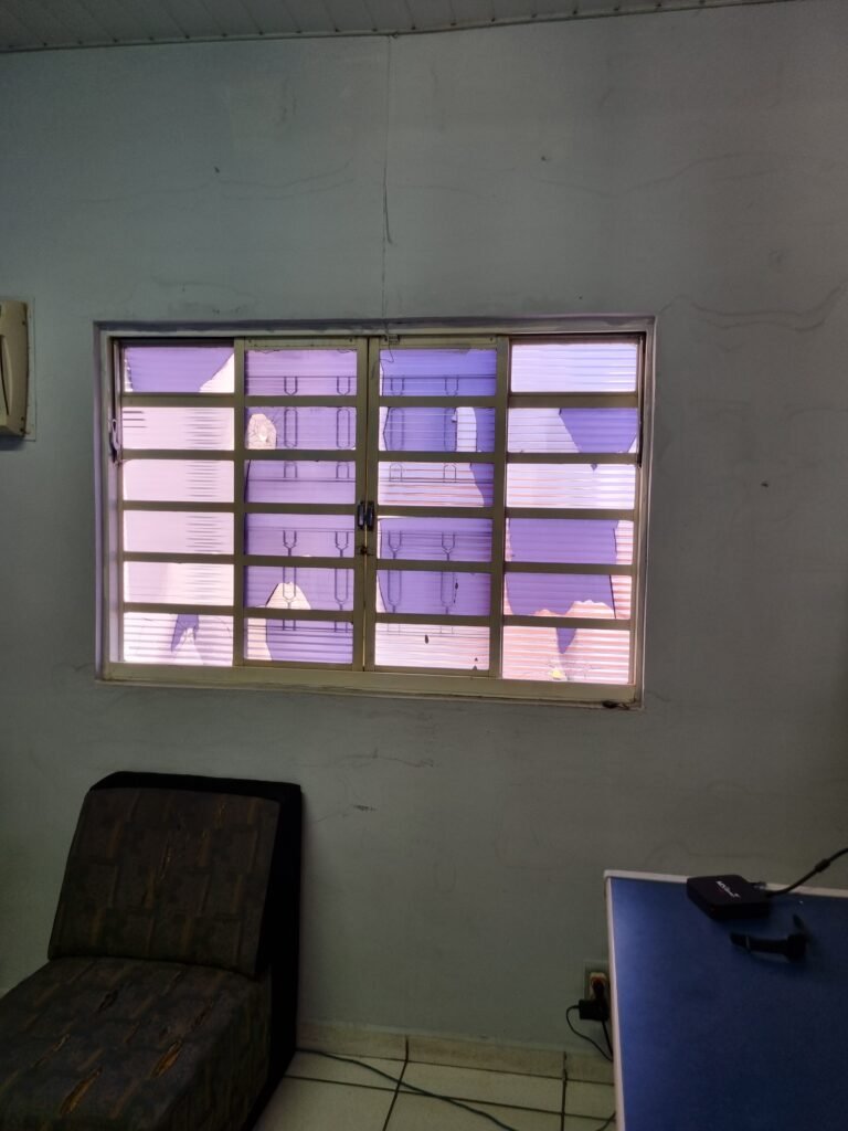 SALA 2:- Piso frio cerâmico, parede frente e lateral divisória naval, 06 vidros lisos, porta divisória naval em ordem, maçaneta com fechadura vitro de correr em ordem, trava em ordem, grade em ordem, 28 vidros canelados sendo que 03 estão trincados, luminária com 02 lâmpadas florescentes tubular em ordem, interruptores em ordem, 03 tomadas em ordem, 01 aparelho ar condicionado cônsul 7500.